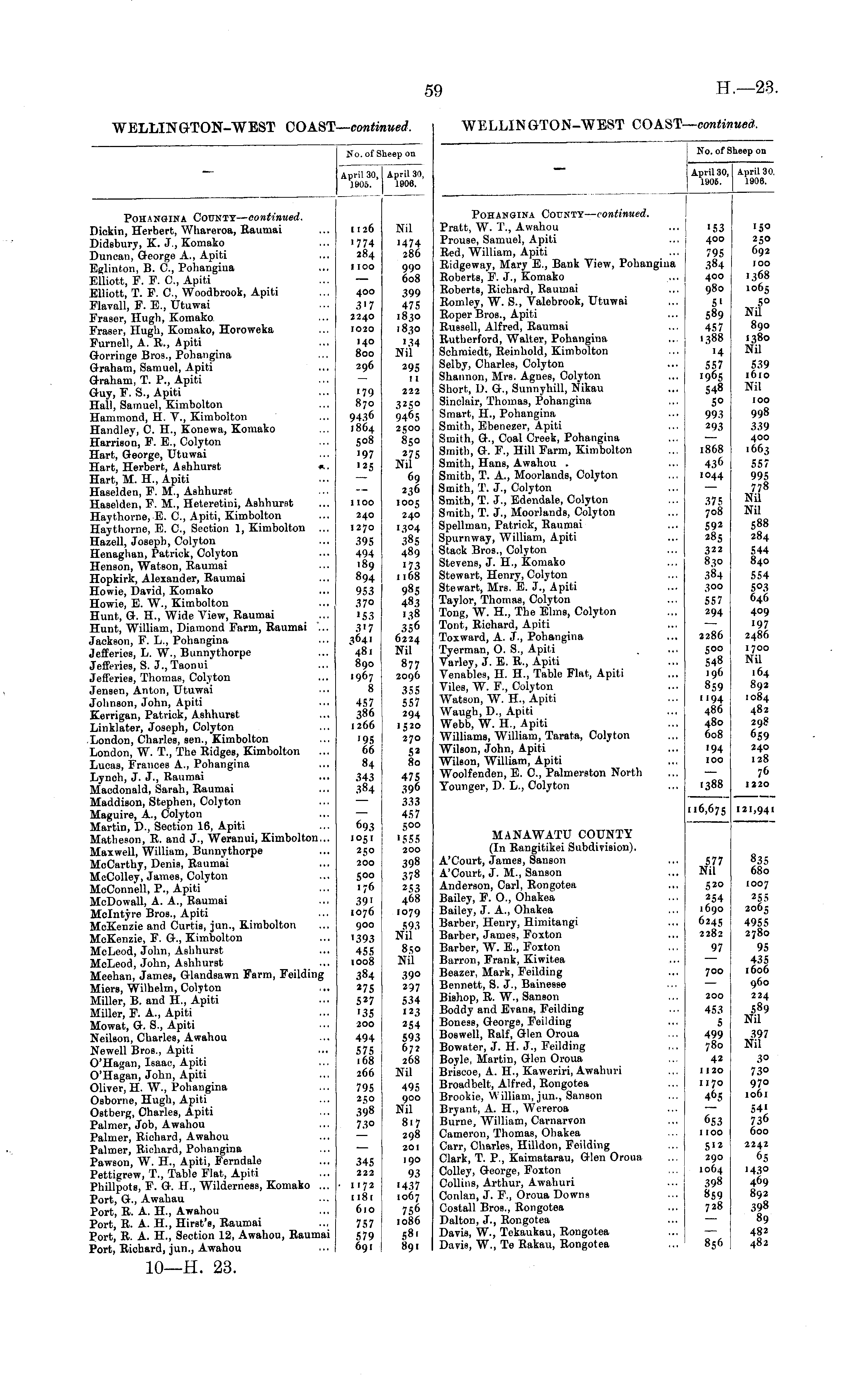 No. of Sheep on April 30, April 3 1905. 1908. April 30. 1908. Pohangina County— continued. Pratt, W. T., Awahou Prouse, Samuel, Apiti Eed, William, Apiti Eidgeway, Mary E., Bank View, Pohangina Eoberts, F. J., Komako EobertB, Eichard, Baumai Romley, W. S., Valebrook, Utuwai Roper Bros., Apiti Eussell, Alfred, Eaumai Eutherford, Walter, Pohangina Schmiedt, Eeinhold, Kimbolton Selby, Charles, Colyton Shannon, Mrs. Agnes, Colyton Short, D. G., Sunnyhill, Nikau Sinclair, Thomas, Pohangina Smart, H., Pohangina Smith, Ebenezer, Apiti Smith, G., Coal Creek, Pohangina Smith, G. F., Hill Farm, Kimbolton Smith, Hans, Awahou . Smith, T. A., Moorlands, Colyton Smith, T. J., Colyton Smith, T. J., Edendale, Colyton Smith, T. J., Moorlands, Colyton Spellman, Patrick, Eaumai Spurnway, William, Apiti Stack Bros., Colyton Stevens, J. H., Komako Stewart, Henry, Colyton Stewart, Mrs. E. J., Apiti Taylor, Thomas, Colyton Tong, W. H., The Elms, Colyton Tont, Eichard, Apiti Toxward, A. J., Pohangina Tyerman, O. S., Apiti Varley, J. E. E., Apiti Venables, H. H., Table Flat, Apiti Viles, W. F., Colyton Watson, W. H., Apiti Waugh, D., Apiti Webb, W. H„ Apiti Williams, William, Tarata, Colyton Wilson, John, Apiti Wilson, William, Apiti Woolfenden, E. C, Palmerston North Younger, D. L., Colyton •53 4OO 795 384 400 980 51 589 457 .388 •4 557 196S 548 5° 993 293 1868 436 1044 375 708 592 285 322 830 384 300 557 294 '50 250 692 100 1368 1065 50 Nil 890 1380 Nil 539 1610 Nil 100 998 339 400 1663 5S7 995 778 Nil Nil 588 284 544 840 554 503 646 409 •97 2486 1700 Nil 164 892 1084 482 298 659 240 128 76 1220 2286 500 548 196 859 "94 486 480 608 •94 100 1388 116,675 121,941 MANAWATU COUNTY (In Eangitikei Subdivision). A'Court, James, Sanson A'Court, J. M., Sanson Anderson, Carl, Bongotea Bailey, F. 0., Ohakea Bailey, J. A., Ohakea Barber, Henry, Himitangi Barber, James, Foxton Barber, W. E., Foxton Barron, Frank, Kiwitea Beazer, Mark, Feilding Bennett, S. J., Bainesse Bishop, B. W., Sanson Boddy and Evans, Feilding Boness, George, Feilding Boswell, Ralf, Glen Oroua Bowater, J. H. J., Feilding Boyle, Martin, Glen Oroua Briscoe, A. H., Kaweriri, Awahuri Broadbelt, Alfred, Bongotea Brookie, William, jun., Sanson Bryant, A. H., Wereroa Burne, William, Carnarvon Cameron, Thomas, Ohakea Carr, Charles, Hilldon, Feilding Clark, T. P., Kaimatarau, Glen Oroua Colley, George, Foxton Collins, Arthur, Awahuri Conlan, J. F., Oroua Downs Costall Btob., Eongotea Dalton, J., Eongotea Davis, W., Tekaukau, Eongotea Davis, W., Te Eakau, Eongotea 577 Nil 520 254 1690 6245 2282 97 700 200 453 5 499 780 42 1120 1170 465 653 1100 5'2 290 1064 398 859 728 835 680 1007 255 2065 4955 2780 95 435 1606 960 224 589 Nil 397 Nil 30 73° 970 1061 54' 736 600 2242 65 1430 469 892 398 89 482 482 856