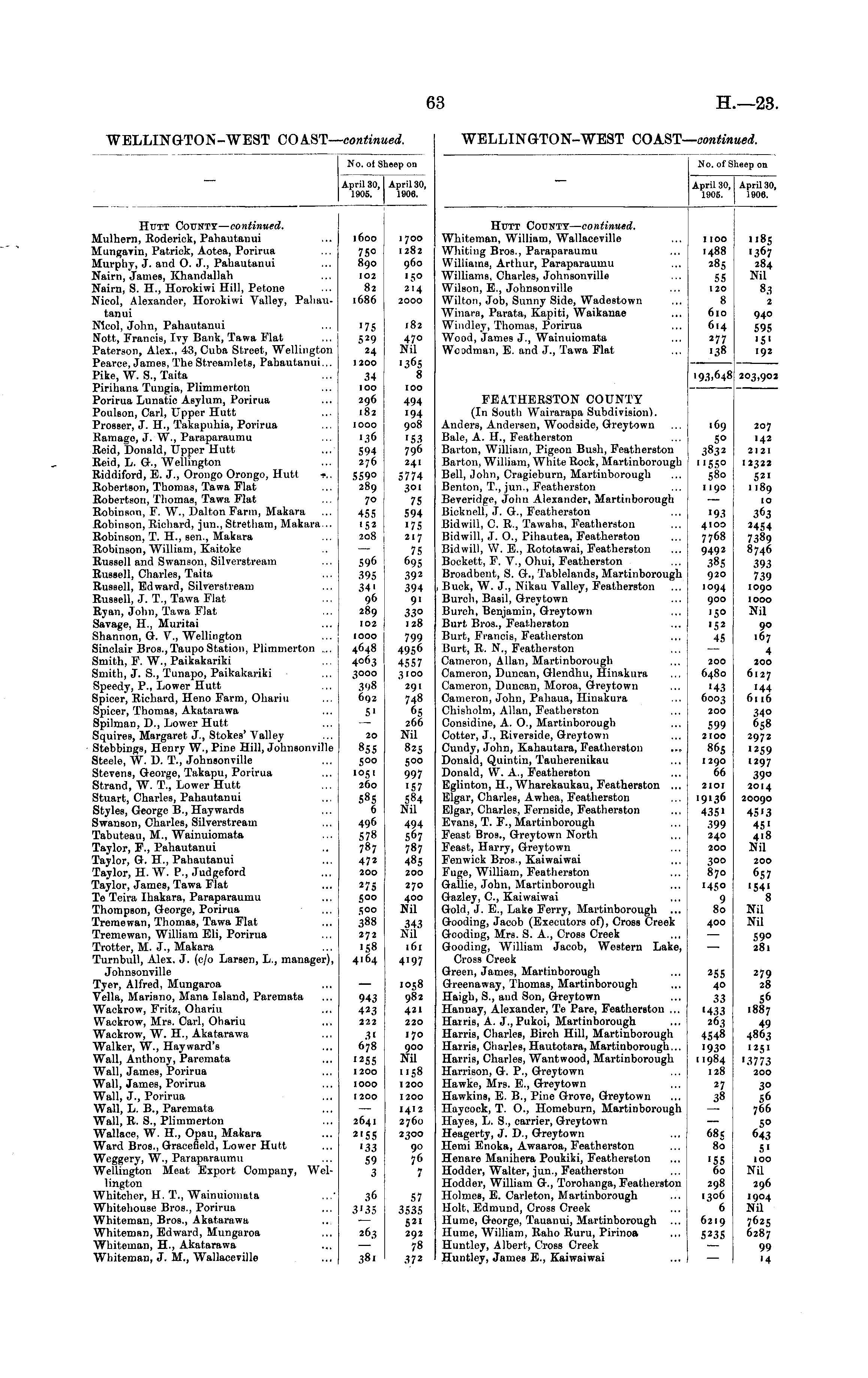 No. of Sheep on April 30, April 30, 1906. 1906. Hutt County— continued. Whiteman, William, Wallaceville Whiting Bros., Paraparaumu Williams, Arthur, Paraparaumu Williams, Charles, Johnsonville Wilson, E., Johnsonville Wilton, Job, Sunny Side, Wadestown Winara, Parata, Kapiti, Waikanae Windley, Thomas, Porirua Wood, James J., Wainuiomata Woodman, E. and J., Tawa Flat I IOO 1488 285 55 120 8 610 614 277 '38 193,648 "85 •367 284 Nil 83 2 940 595 '5' 192 FEATHERSTON COUNTY (In South Wairarapa Subdivision). Anders, Andersen, Woodside, Greytown Bale, A. II., Featherston Barton, William, Pigeon Bush, Featherston Barton, William, White Bock, Martinborough Bell, John, Cragieburn, Martinborough Benton, T., jun., Featherston Beveridge, John Alexander, Martinborough Bicknell, J. G., Featherston Bidwill, C. R., Tawaha, Featherston Bidwill, J. 0., Pihautea, Featherston Bidwill, W. E., Eototawai, Featherston Bockett, F. V., Ohui, Featherston Broadbent, S. G., Tablelands, Martinborough , Buck, W. J., Nikau Valley, Featherston Burch, Basil, Greytown Burch, Benjamin, Greytown Burt Bros., Featherston Burt, Francis, Featherston Burt, B. N., Featherston Cameron, Allan, Martinborough Cameron, Duncan, Glendhu, Hinakura Cameron, Duncan, Moroa, Greytown Cameron, John, Pahaua, Hinakura Chisholm, Allan, Featherston Considine, A. O., Martinborough Cotter, J., Eiverside, Greytown Cundy, John, Kahautara, Featherston ... Donald, Quintin, Tauherenikau Donald, W. A., Featherston Eglinton, H., Wharekaukau, Featherston ... Elgar, Charles, Awhea, Featherston Elgar, Charles, Fernside, Featherston Evans, T. F., Martinborough Feast Bros., Greytown North Feast, Harry, Greytown Fenwick Bros., Kaiwaiwai Fuge, William, Featherston Gallie, John, Martinborough Gazley, C, Kaiwaiwai Gold, J. E., Lake Ferry, Martinborough ... Gooding, Jacob (Executors of), Cross Creek Gooding, Mrs. S. A., Cross Creek Gooding, William Jacob, Western Lake, CrosB Creek Green, James, Martinborough Greenaway, Thomas, Martinborough Haigh, S., and Son, Greytown Hannay, Alexander, Te Pare, Featherston ... Harris, A. J.,Pukoi, Martinborough Harris, Charles, Birch Hill, Martinborough Harris, Charles, Hautotara, Martinborough... Harris, Charles, Wantwood, Martinborough Harrison, G. P., Greytown Hawke, Mrs. E., Greytown Hawkins, E. B., Pine Grove, Greytown Haycock, T. O., Homeburn, Martinborough Hayes, L. 8., carrier, Greytown Heagerty, J. D., Greytown Hemi Enoka, Awaaroa, Featherston Henare Manihera Poukiki, Featherston Hodder, Walter, jun., Featherston Hodder, William G., Torohanga, Featherston Holmes, E. Carleton, Martinborough Holt, Edmund, Cross Creek Hume, George, Tauanui, Martinborough ... Hume, William, Baho Buru, Pirinoa Huntley, Albert, Cross Creek Huntley, James E., Kaiwaiwai 203,902 169 5o 3832 "550 580 1190 207 142 2121 12322 521 1189 10 363 2454 7389 8746 393 739 1090 IOOO Nil '93 4100 7768 9492 385 920 1094 900 '5° 152 45 200 6480 '43 6003 200 90 167 4 200 6127 •44 6116 599 2100 865 1290 66 2101 19136 4351 399 240 200 340 658 2972 1259 1297 39° 2014 20090 4513 451 418 Nil 200 657 •54' 8 Nil Nil 300 870 •45o 9 80 400 59o 281 255 40 33 •433 263 4548 1930 11984 128 27 38 279 28 56 1887 49 4863 1251 •3773 200 30 56 766 5° 643 5' 100 Nil 296 1904 Nil 7625 6287 99 '4 685 80 '55 60 298 1 1306 | 6 j 6219 5235