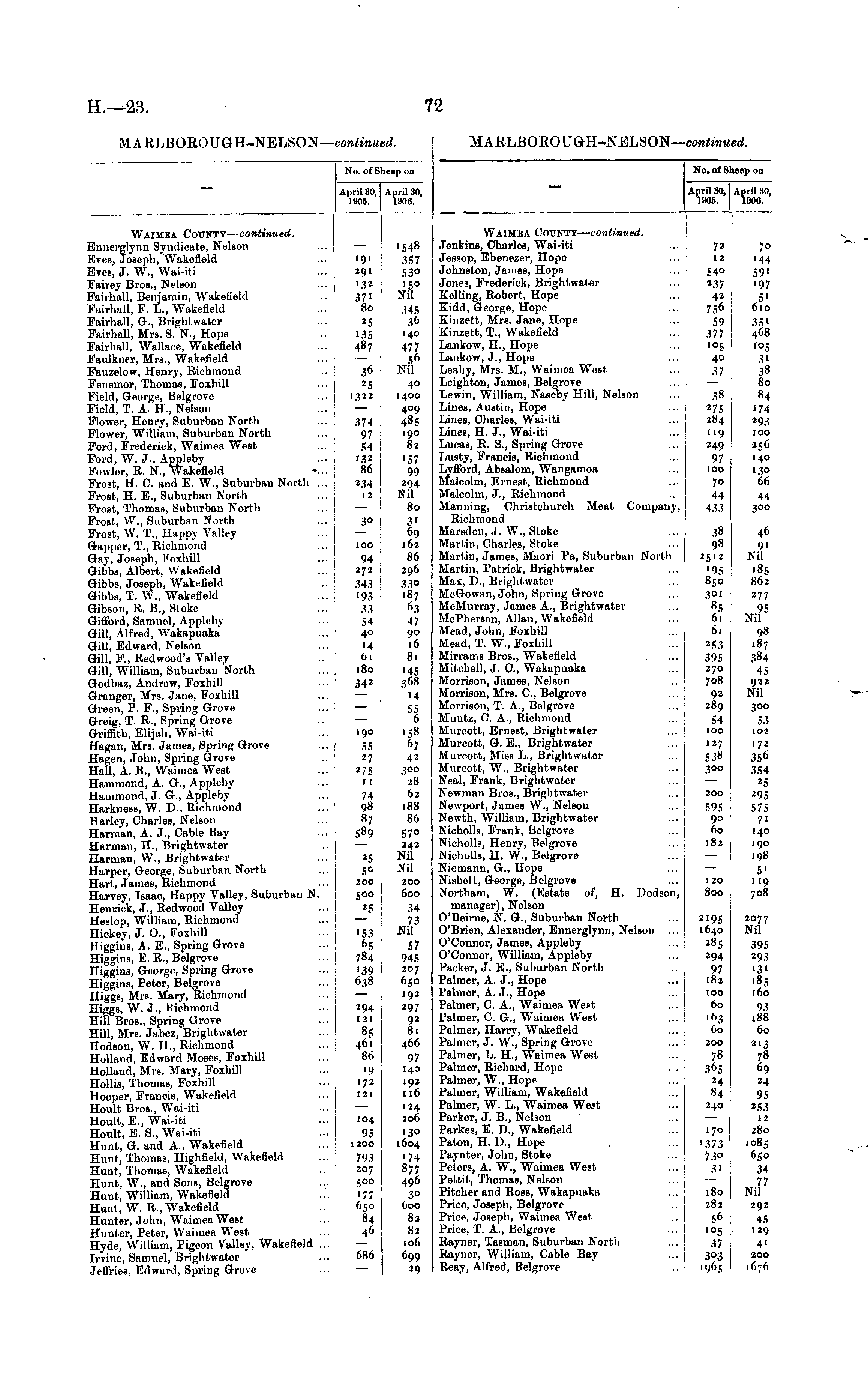 No. of Sheep on April 30, April 30, 1906. 1906. Waimea County— continued. Jenkins, Charles, Wai-iti JeSBop, Ebenezer, Hope Johnston, James, Hope Jones, Frederick, Brightwater Kelling, Bobert, Hope Kidd, George, Hope Kinzett, Mrs. Jane, Hope Kinzett, T., Wakefield Lankow, H, Hope .. Lankow, J, Hope Leahy, Mrs. M., Waimea West Leighton, James, Belgrove Lewin, William, Naseby Hill, Nelson Lines, Austin, Hope ... j Lines, Charles, Wai-iti Lines, H. J., Wai-iti Lucas, R. S., Spring Grove Lu9ty, Francis, Eichmond Lyfford, Absalom, Wangamoa Malcolm, Ernest, Eichmond Malcolm, J., Eichmond Manning, Christchurch Meat Company, Biehmond Marsden, J. W., Stoke ... j Martin, Charles, Stoke ... Martin, James, Maori Pa, Suburban North | Martin, Patrick, Brightwater Max, D., Brightwater McGowan, John, Spring Grove McMurray, James A., Brightwater McPherson, Allan, Wakefield Mead, John, Foxhill Mead, T. W., Foxhill Mirrams Bros., Wakefield Mitchell, J. 0., Wakapuaka Morrison, James, Nelson Morrison, Mrs. C, Belgrove Morrison, T. A., Belgrove Muntz, 0. A., Eichmond Murcott, Ernest, Brightwater Murcott, G. E., Brightwater Murcott, Miss L., Brightwater Murcott, W., Brightwater Neal, Frank, Brightwater Newman Bros., Brightwater Newport, James W., Nelson Newth, William, Brightwater Nicholls, Frank, Belgrove Nicholls, Henry, Belgrove Nicholla, H. W., Belgrove Niemann, G., Hope NiBbett, George, Belgrove Northam, W. (Estate of, H. Dodson, manager), Nelson O'Beirne, N. G., Suburban North O'Brien, Alexander, Ennerglynn, Nelson O'Connor, James, Appleby O'Connor, William, Appleby Packer, J. E., Suburban North Palmer, A. J., Hope Palmer, A. J., Hope Palmer, C. A., Waimea West Palmer, C. G., Waimea West Palmer, Harry, Wakefield Palmer, J. W., Spring Grove Palmer, L. H., Waimea West Palmer, Eichard, Hope Palmer, W., Hope Palmer, William, Wakefield Palmer, W. L., Waimea West Parker, J. B., Nelson Parkes, E. D., Wakefield Paton, H. D., Hope Paynter, John, Stoke Peters, A. W., Waimea West Pettit, Thomas, Nelson Pitcher and Boss, Wakapuaka Price, Joseph, Belgrove Price, Joseph, Waimea West Price, T. A., Belgrove Eayner, Tasman, Suburban North Eayner, William, Cable Bay Eeay, Alfred, Belgrove ... I 72 12 540 2.37 42 756 59 377 i°5 40 37 38 275 284 "9 249 97 100 70 44 433 38 98 2512 '95 850 301 85 61 61 25.3 395 270 708 92 289 54 100 127 538 300 200 595 90 60 182 120 800 2195 1640 285 294 97 182 100 60 163 60 200 78 365 24 84 240 I 70 '373 730 31 180 282 56 '05 37 303 '965 70 '44 59' '97 5' 610 35' 468 105 31 38 80 84 •74 293 100 256 140 •30 66 44 300 46 9' Nil '85 862 277 95 Nil 98 187 384 45 922 Nil 300 S3 102 172 356 354 25 295 575 T 140 190 198 5' "9 708 2077 Nil 395 293 '3' '85 160 93 188 60 2'3 78 69 24 95 253 12 280 1085 650 34 77 Nil 292 45 129 4' 200 1676
