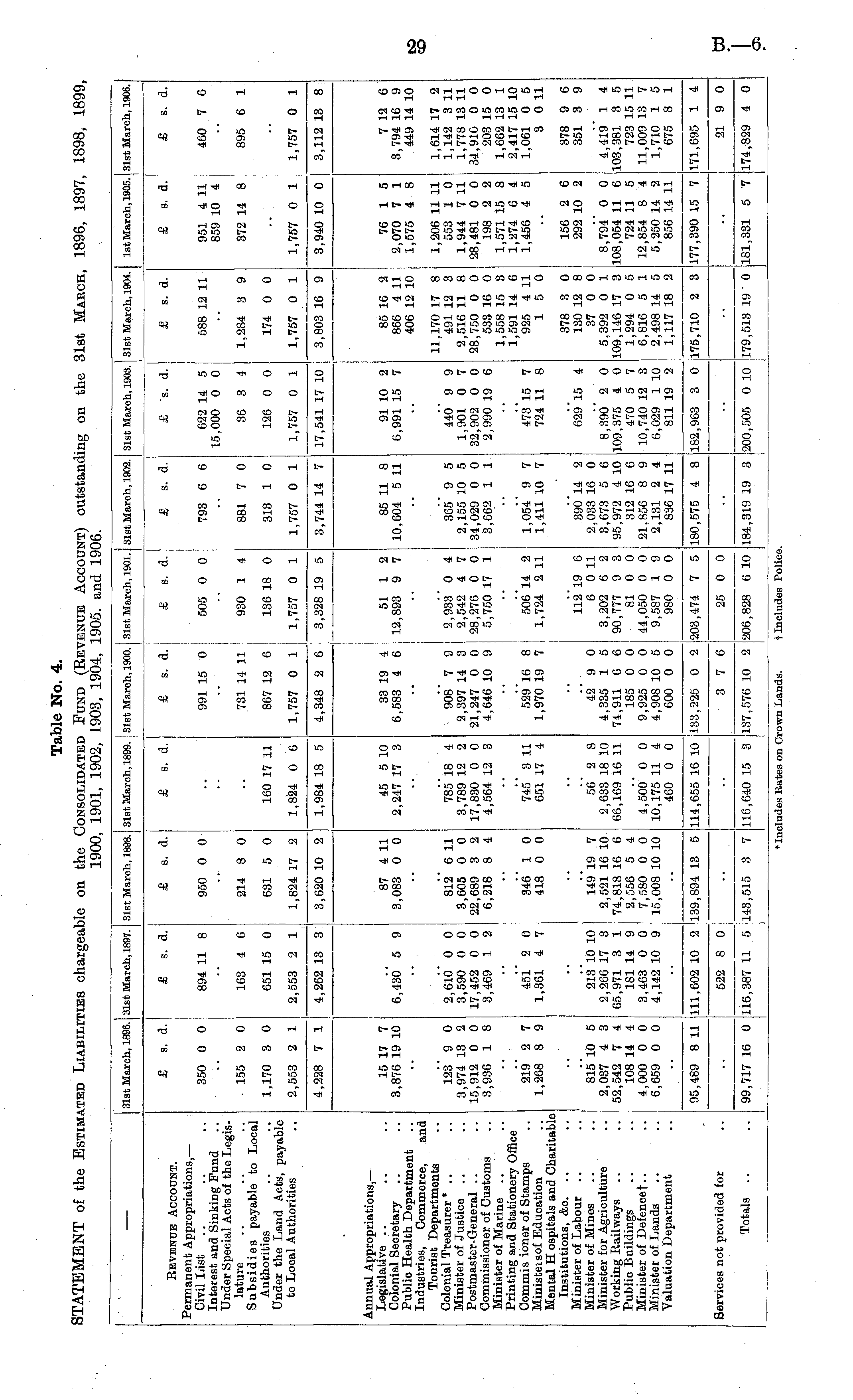 Table No. 4. STATEMENT of the Estimated Liabilities chargeable on the Consolidated Fund (Revenue Account) outstanding on the 31st March, 1896, 1897, 1898, 1899, 1900, 1901, 1902, 1903, 1904, 1905, and 1906.