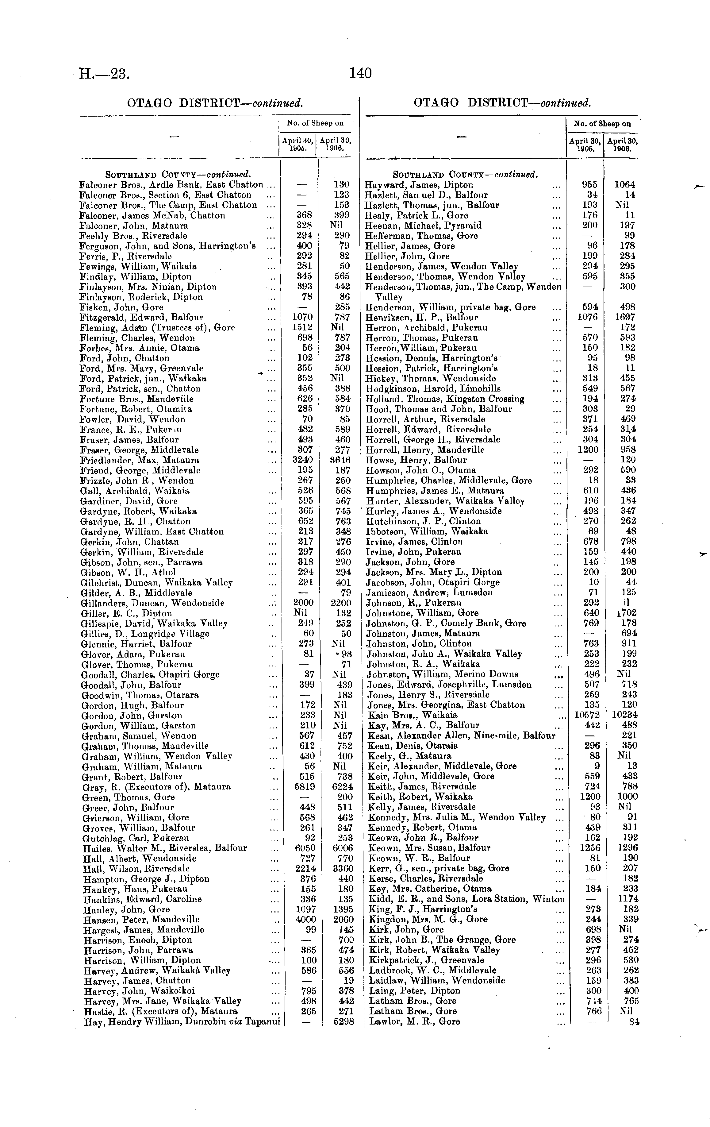 No. of Sheep on April 30, 1906. April 30, 1906. Southland Covsiy—continued. Hayward, James, Dipton Hazlett, San uel D., Balfour Hazlett, Thomas, jun., Balfour Healy, Patrick L., Gore Heenan, Michael, Pyramid Hefferman, Thomas, Gore Hellier, James, Gore Hellier, John, Gore Henderson, James, Wendon Valley Henderson, Thomas, Wendon Valley Henderson, Thomas, jun., The Camp, Wenden Valley Henderson, William, private bag, Gore Henriksen, H. P., Balfour Herron, Archibald, Pukerau Herron, Thomas, Pukerau Herron,William, Pukerau Hession, Dennis, Harrington's Hession, Patrick, Harrington's Hickey, Thomas, Wendonside Hodgkinson, Harold, Limehills Holland, Thomas, Kingston Crossing Hood, Thomas and John, Balfour Horrell, Arthur, Biversdale Horrell, Edward, Biversdale Horrell, George H, Riversdale Horrell, Henry, Mandeville Howse, Henry, Balfour Howson, John O., Otama Humphries, Charles, Middlevale, Gore Humphries, James E., Mataura Hunter, Alexander, Waikaka Valley Hurley, James A., Wendonside Hutchinson, J. P., Clinton Ibbotson, William, Waikaka Irvine, James, Clinton Irvine, John, Pukerau Jackson, John, Gore Jackson, Mrs. Mary L-, Dipton Jacobson, John, Otapiri Gorge Jamieson, Andrew, Lumsden Johnson, B., Pukerau Johnstone, William, Gore Johnston, G. P., Comely Bank, Gore Johnston, James, Mataura Johnston, John, Clinton Johnston, John A., Waikaka Valley Johnston, B. A., Waikaka Johnston, William, Merino Downs ... Jones, Edward, Josephville, Lumsden j Jones, Henry S., Biversdale Jones, Mrs. Georgina, East Chatton Kain Bros., Waikaia Kay, Mrs. A. C, Balfour Kean, Alexander Allen, Nine-mile, Balfour Kean, Denis, Otaraia Keely, G., Mataura Keir, Alexander, Middlevale, Gore Keir, John, Middlevale, Gore Keith, James, Biversdale Keith, Eobert, Waikaka Kelly, James, Riversdale i Kennedy, Mrs. Julia M., Wendon Valley ... Kennedy, Eobert, Otama Keown, John B., Balfour Keown, Mrs. Susan, Balfour Keown, W. B., Balfour Kerr, G., sen., private bag, Gore Kerse, Charles, Biversdale Key, Mrs. Catherine, Otama Kidd, E. B., and Sons, Lora Station, Winton King, F. J., Harrington's Kingdon, Mrs. M. G., Gore Kirk, John, Gore Kirk, John B., The Grange, Gore Kirk, Bobert, Waikaka Valley Kirkpatrick, J., Greenvale Ladbrook, W. C., Middlevale Laidlaw, William, Wendonside Laing, Peter, Dipton Latham Bros., Gore Latham Bros., Gore Lawlor, M. E., Gore 955 34 193 176 200 96 199 294 595 594 1076 570 150 95 18 313 549 194 303 371 254 304 1200 292 18 610 190 498 270 69 678 159 145 200 10 71 292 640 769 1064 14 Nil 11 197 99 178 284 295 355 300 498 1697 172 593 182 98 11 455 567 274 29 469 314 304 958 120 590 83 436 184 347 262 48 798 440 198 200 44 125 il 1702 178 694 911 199 232 Nil 718 243 120 10234 488 221 350 Nil 13 433 788 1000 Nil 91 311 192 1296 190 207 182 233 1174 182 339 Nil 274 452 530 262 383 400 765 Nil 84 763 253 222 496 507 259 135 10572 442 296 83 9 559 724 1200 93 80 439 162 1256 81 150 184 273 244 698 398 277 296 263 159 300 7-14 760