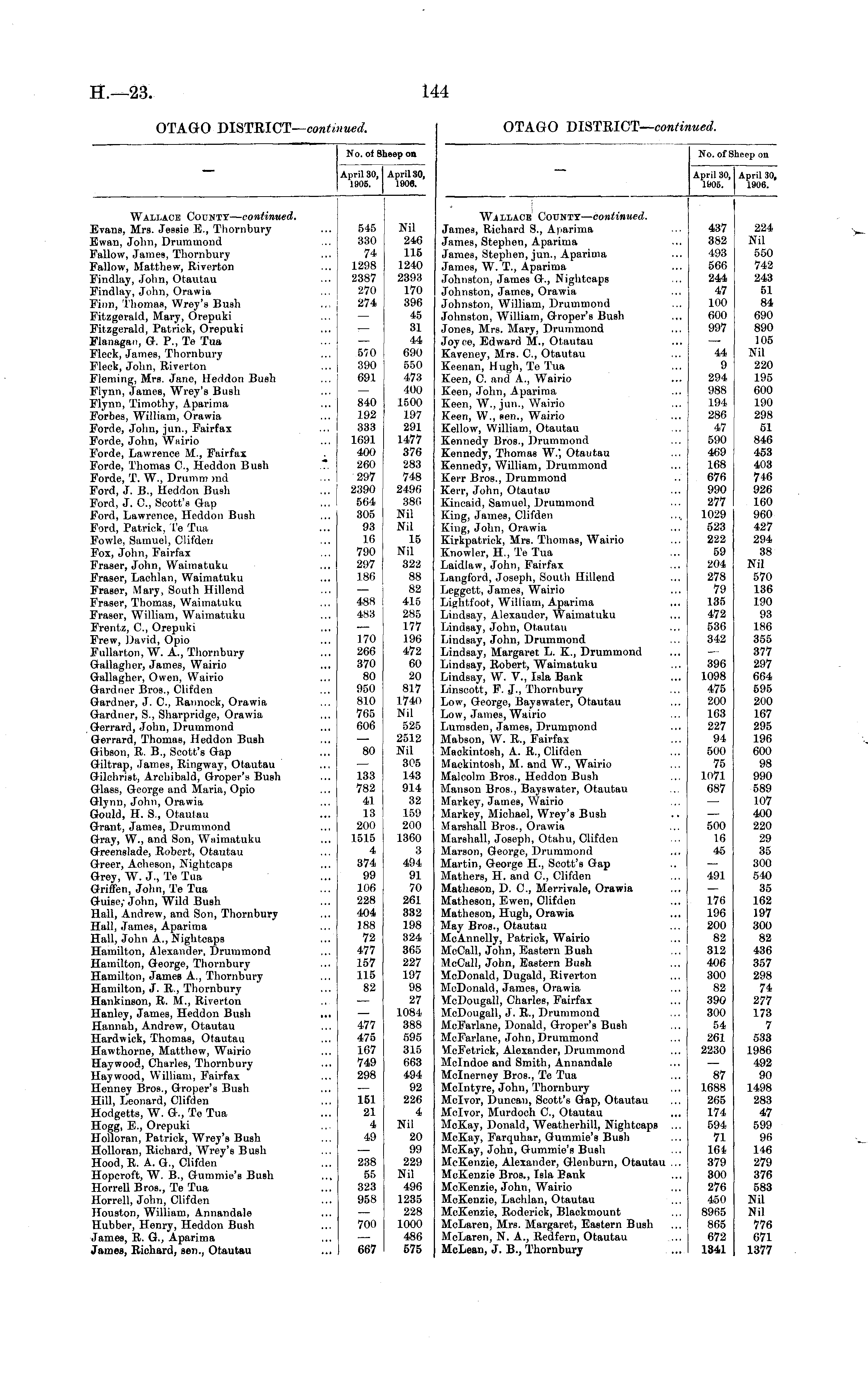 No. of Sheep on April 30, April 30, 1905. 1906. Wallace Codnty— continued. Evans, Mrs. Jessie E., Thornbury Ewan, John, Drummond Fallow, James, Thornbury Fallow, Matthew, Eiverton Findlay, John, Otautau Findlay, John, Orawia Finn, Thomas, Wrey's Bush Fitzgerald, Mary, Orepuki Fitzgerald, Patrick, Orepuki Flanagan, G. P., Te Tua Fleck, James, Thornbury Fleck, John, Eiverton Fleming, Mrs. Jane, Heddon Bush Flynn, James, Wrey's Bush Flynn, Timothy, Aparima Forbes, William, Orawia Forde, John, jun., Fairfax Fordo, John, Wairio Forde, Lawrence M., Fairfax Forde, Thomas G, Heddon Bush Forde, T. W., Drumm >nd Ford, J. B., Heddon Bush Ford, J. C, Scott's Gap Ford, Lawrence, Heddon Bush Ford, Patrick, Te Tua Fowle, Samuel, Clifden Fox, John, Fairfax Fraser, John, Waimatuku Fraser, Lachlan, Waimatuku Fraser, Mary, South Hillend Fraser, Thomas, Waimatuku Fraser, William, Waimatuku Frentz, C, Orepuki Frew, David, Opio Fullarton, W. A., Thornbury Gallagher, James, Wairio Gallagher, Owen, Wairio Gardner Bros., Clifden Gardner, J. C, Bannock, Orawia Gardner, S., Sharpridge, Orawia Gerrard, John, Drummond Gerrard, Thomas, Heddon Bush Gibson, E. B., Scott's Gap Giltrap, James, Bingway, Otautau Gilchrist, Archibald, Groper's Bush Glass, George and Maria, Opio Glynn, John, Orawia Gould, II. S., Otautau Grant, James, Drummond Gray, W., and Son, Waimatuku Greenslade, Bobert, Otautau Greer, Acheson, Nightcaps Grey, W. J., Te Tua Griffen, John, Te Tua Guise; John, Wild Bush Hall, Andrew, and Son, Thornbury Hall, James, Aparima Hall, John A., Nightcaps Hamilton, Alexander, Drummond Hamilton, George, Thornbury Hamilton, James A., Thornbury Hamilton, J. B., Thornbury Hankinson, E. M., Eiverton Hanley, James, Heddon Bush Hannah, Andrew, Otautau Hardwick, Thomas, Otautau Hawthorne, Matthew, Wairio Haywood, Charles, Thornbury Haywood, William, Fairfax Henney Bros., Groper's Bush Hill, Leonard, Clifden Hodgetts, W. G., Te Tua Hogg, E., Orepuki Holloran, Patrick, Wrey's Bush Holloran, Eichard, Wrey's Bush Hood, E. A. G., Clifden Hopcroft, W. B., Gummie's Bush Horrell Bros., Te Tua Horrell, John, Clifden Houston, William, Annandale Hubber, Henry, Heddon Bush James, E. G., Aparima James, Eichard, sen., Otautau 545 330 74 1298 2387 270 274 570 390 691 840 192 333 1691 400 260 297 2390 564 305 93 16 790 297 186 488 483 170 266 370 80 950 810 765 606 Nil 246 115 1240 2393 170 396 45 31 44 690 550 473 400 1500 197 291 1477 376 283 748 2496 380 Nil Nil 15 Nil 322 88 82 415 285 177 196 472 60 20 817 1740 Nil 525 2512 Nil 305 143 914 32 159 200 1360 3 494 91 70 261 332 198 324 365 227 197 98 27 1084 388 595 315 663 494 92 226 4 Nil 20 99 229 Nil 496 1235 228 1000 486 575 80 133 782 41 18 200 1515 4 374 99 106 228 404 188 72 477 157 115 82 477 475 167 749 298 151 21 4 49 238 55 323 958 700 667