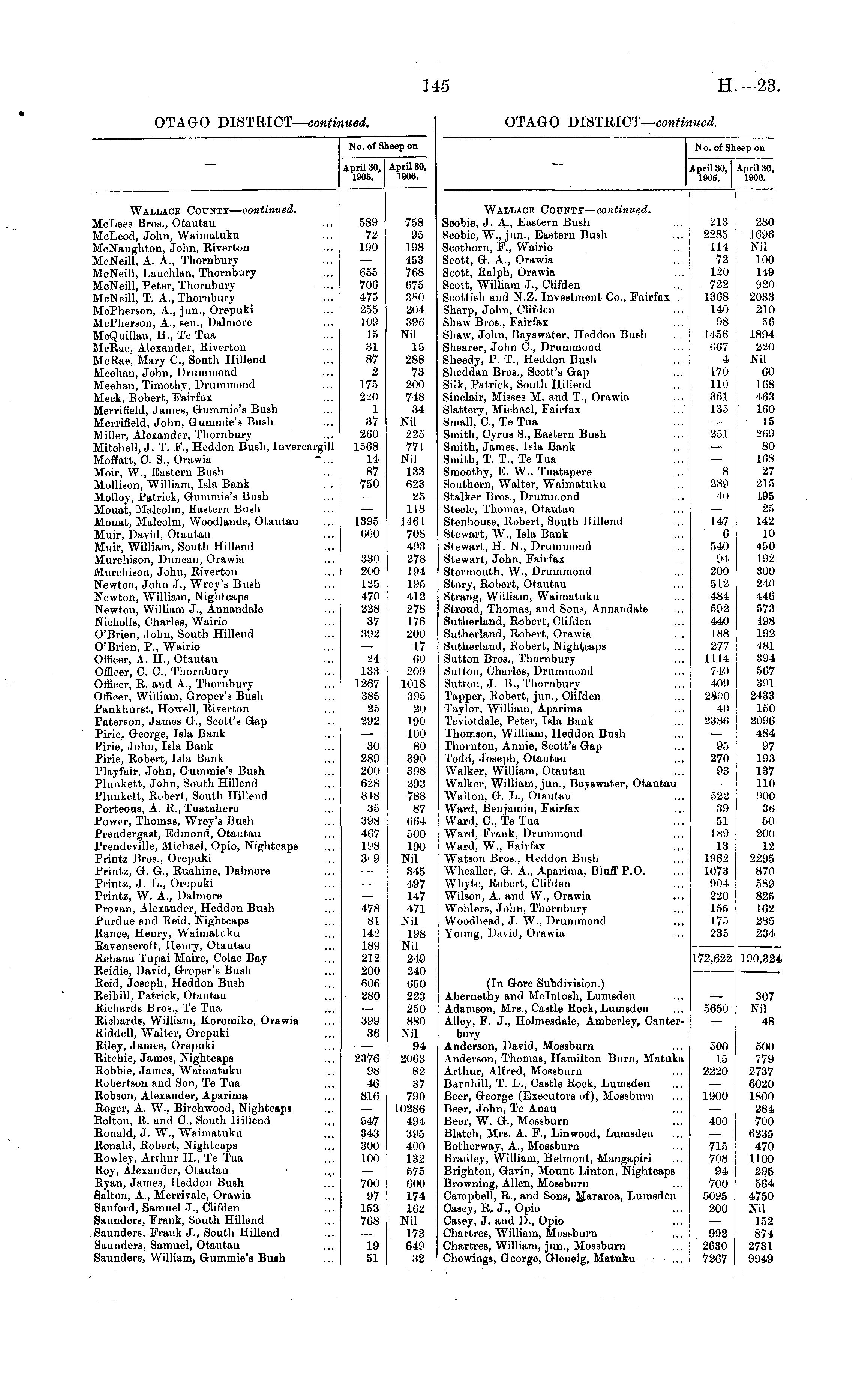No. of 8heep on April 30, 1905. April 30, 1906. Wallace County— continued. Scobie, J. A., Eastern Bush Scobie, W., jun., Eastern Bush ... Scothorn, F., Wairio Scott, G. A., Orawia Scott, Ealph, Orawia Scott, William J., Clifden Scottish and N.Z. Investment Co., Fairfax .. Sharp, John, Clifden Shaw Bros., Fairfax Shaw, John, Bayswater, Heddon Bush Shearer, John C., Drummond Sheedy, P. T., Heddon Bush Sheddan Bros., Scott's Gap Silk, Patrick, South Hillend Sinclair, Misses M. and T., Orawia Slatter;, Michael, Fairfax Small, C, Te Tua Smith, Cyrus S., Eastern Bush Smith, James, Isla Bank Smith, T. T., Te Tua Smoothy, E. W., Tuatapere Southern, Walter, Waimatuku Stalker Bros., Drummond Steele, Thomas, Otautau Stenhouse, Eobert, South Hillend Stewart, W., Isla Bank Stewart, H. N., Drummond Stewart, John, Fairfax Stormouth, W., Drummond Story, Bobert, Otautau Strang, William, Waimatuku Stroud, Thomas, and Sons, Annandale Sutherland, Bobert, Clifden Sutherland, Bobert, Orawia Sutherland, Robert, Nightcaps Sutton Bros., Thornbury Sutton, Charles, Drummond Sutton, J. B., Thornbury Tapper, Eobert, jun., Clifden Taylor, William, Aparima Teviotdale, Peter, Isla Bank Thomson, William, Heddon Bush Thornton, Annie, Scott's Gap Todd, Joseph, Otautau Walker, William, Otautau Walker, William, jun., Bayswater, Otautau Walton, G. L., Otautau Ward, Benjamin, Fairfax Ward, C, Te Tua Ward, Frank, Drummond Ward, W., Fairfax Watson Bros., Heddon Bush Whealler, G. A., Aparima, Bluff P.O. Whyte, Eobert, Clifden Wilson, A. and W., Orawia Wohlers, John, Thornbury Woodhead, J. W., Drummond Young, David, Orawia 213 2285 114 72 120 722 1368 140 98 1466 067 4 170 110 301 135 251 8 289 40 147 6 540 94 200 512 484 592 440 188 277 1114 740 409 2800 40 2386 280 1696 Nil 100 149 920 2033 210 56 1894 220 Nil 00 108 463 100 15 269 80 ios 27 215 495 25 142 10 450 192 300 240 116 573 198 192 181 394 567 391 2433 150 2096 484 97 193 137 110 000 36 50 200 12 2295 870 589 825 162 285 234 95 270 93 522 39 51 189 13 1962 1073 904 220 155 175 235 172,622 190,324 (In Gore Subdivision.) Abernethy and Mcintosh, Lumsden Adamson, Mrs., Castle Bock, Lumsden Alley, F. J., Holmesdale, Amberley, Canterbury Anderson, David, Mossburn Anderson, Thomas, Hamilton Burn, Matuka Arthur, Alfred, Mossburn Barnhill, T. L., Castle Eock, Lumsden Beer, George (Executors of), MosBburn Beer, John, Te Anau Beer, W. G., Mossburn Blatch, Mrs. A. F., Linwood, Lumsden Botherway, A., Mossburn Bradley, William, Belmont, Mangapiri Brighton, Gavin, Mount Linton, Nightcaps Browning, Allen, Mossburn Campbell, E., and Sons, Mararoa, Lumsden Casey, E. J., Opio Casey, J. and D., Opio Chartres, William, Mossburn Chartres, William, jun., Mossburn ChewingB, George, Glenelg, Matuku 5650 500 15 2220 1900 400 307 Nil 48 500 779 2737 6020 1800 284 700 6235 470 1100 295 564 4750 Nil 152 874 2731 9949 715 708 94 700 5095 200 992 2630 7267
