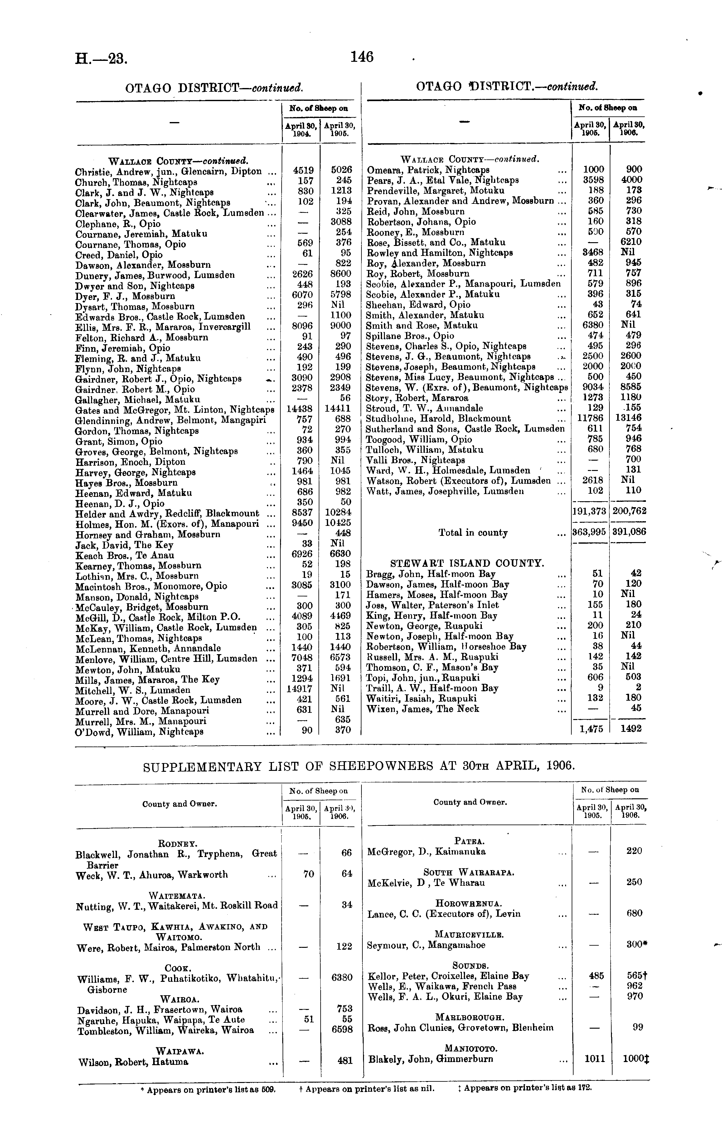 SUPPLEMENTARY LIST OF SHEEPOWNERS AT 30th APRIL, 1906.