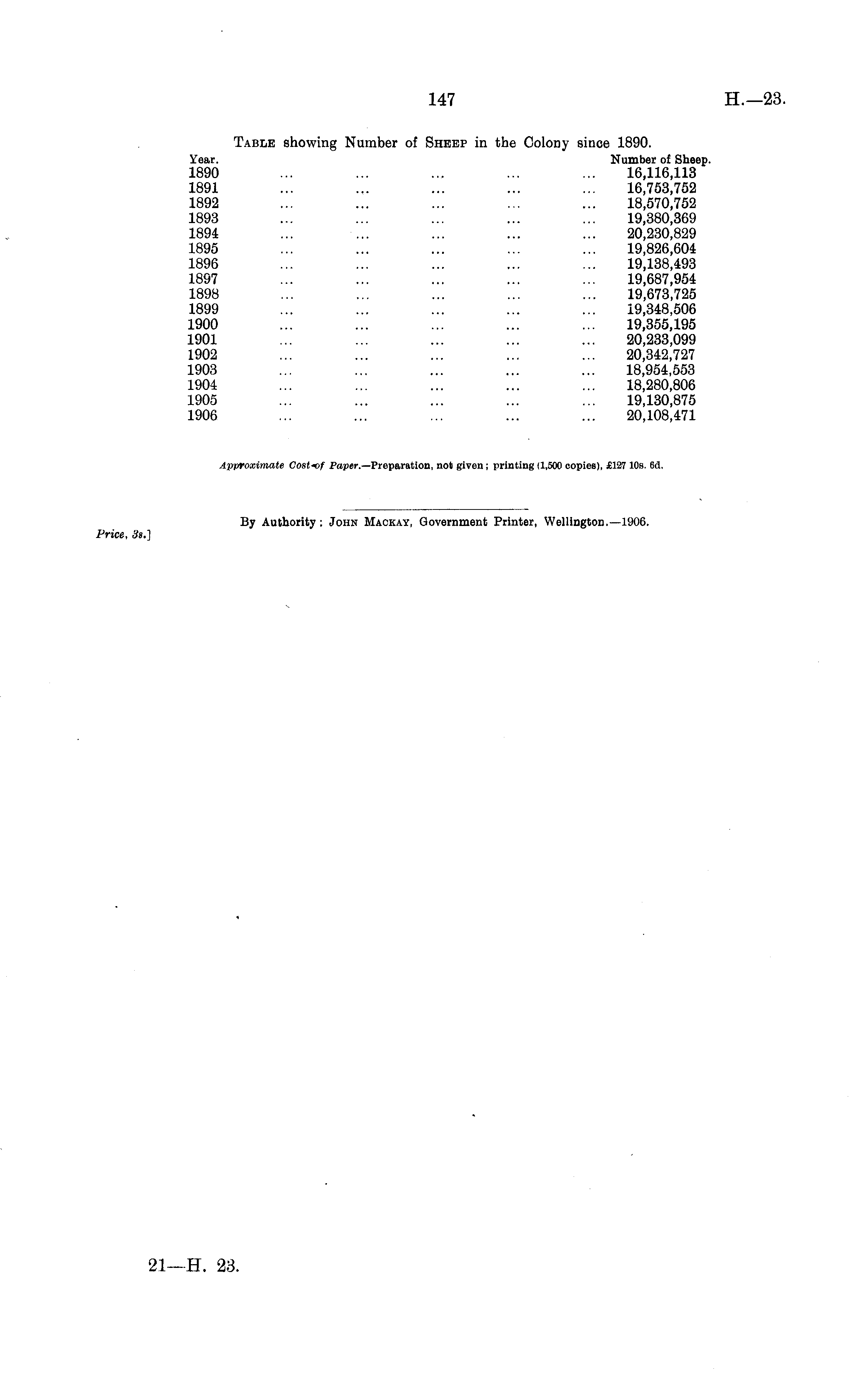 Table showing Number of Sheep in the Colony since 1890. Year. Number of Sheep. 1890 ... ... ... ... ... 16,116,113 1891 ... ... ... ... ... 16,753,752 1892 ... ... ... ... ... 18,570,752 1893 ... ... ... ... ... 19,380,369 1894 ... ... ... ... ... 20,230,829 1895 ... ... ... ... ... 19,826,604 1896 ... ... ... ... ... 19,138,493 1897 ... ... ... ... ... 19,687,954 1898 ... ... ... ... ... 19,673,725 1899 ... ... ... ... ... 19,348,506 1900 ... ... ... ... ... 19,355,195 1901 ... ... ... ... ... 20,233,099 1902 ... ... ... ... ... 20,342,727 1903 ... ... ... ... ... 18,954,553 1904 ... ... ... ... ... 18,280,806 1905 ... ... ... ... ... 19,130,875 1906 ... ... ... ... ... 20,108,471 Approximate Costof Paper.—Preparation, not given; printing (1,500 copies), £127 10s. 6d.