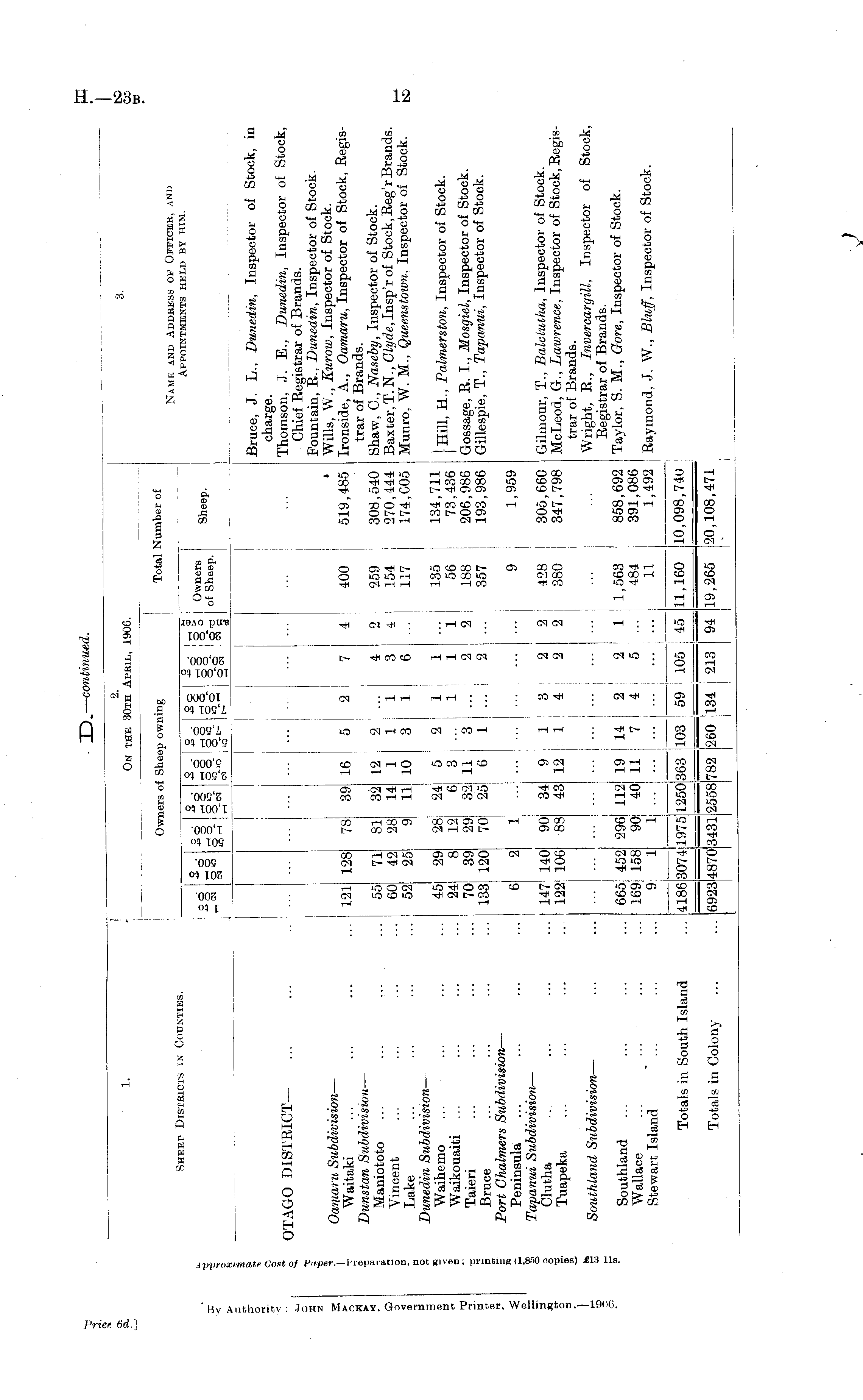 i. J i 2. On the 30th Apbil, 1906. Owners o! Sheep owning 3. Total Number of Name and Address of Offices, and Appointments held by him. Sheep Districts im Countiks. o ■"o HS h5 r-io "HO o§ O° o d Owners of Sheep. Sheep. iTAGO DISTRICT— Oamaru Subdivision — Waitaki Dunstan Subdivision — Maniototo Vincent Lake Dunedin Subdivision — Waihemo Waikouaiti ... Taieri Bruce Port Chalmers Subdivision — Peninsula Tapanui Subdivision — Clutha Tuapeka 5 2 7 > Bruce, J. L., Dunedin, Inspector of Stock, in charge. Thomson, J. E., Dunedin, Inspector of Stock, Chief Eegistrar of Brands. Fountain, R., Dunedin, Inspector of Stock. Wills, W., Kurow, Inspector of Stock. Ironside, A., Oamaru, Inspector of Stock, Registrar of Brands. Shaw, C, Naseby, Inspector of Stock. Baxter, T.N. , CZz/de, Insp'r of Stock,Eeg'rBrands. Munro, W. M., Queenstoivn, Inspector of Stock. 121 128 78 39 16 4 ; 400 519,485 55 60 52 71 42 25 81 28 9 32 14 11 12 10 2 ... 1 1 3 i 1 I 2 , 1 j ... \ 1 4 3 6 1 1 2 2 2 259 154 117 308,540 270,444 174,005 45! 24 70 133 29 39 120 28! 12 29 70 24 6 32 25 : 5 3 11 6 1 2 135 56 188 357 9 134,711 73,436 206,986 193,986 1,959 [.Bill, H., Palmerston, Inspector of Stock. Gossage, R. I., Mosgiel, Inspector of Stock. Gillespie, T., Tapanui, Inspector of Stock. 6 2 1 1 3 1 4 2 2 Gilmour, T., Baiclutha, Inspector of Stock. McLeod, G., Lawrence, Inspector of Stock, Eegistrar of Brands. Wright, E., Invercargill, Inspector of Stock, Eegistrar of Brands. Taylor, S. M., Gore, Inspector of Stock. 147 122! 140l 1061 90 88 34 43 9 12 2 2 i 428 380 305,660 347,798 Southland Subdivision — ... I ... 14 2 7 4 2 5 ... I Southland Wallace Stewart Island 665 169 9 452 158 1 296 90 1 112 40 19 II 1 ... J 1,563 484 11 858,692 391,086 1,492 Raymond, J. W., Bluff, Inspector of Stock. "' Totals in South Island 3074 1975 L250J 1363 103 59 105 45 11,160 10,098,740 J 1 Totals in Colony 782 260 !l34 213 j 94 19,265 20,108,471