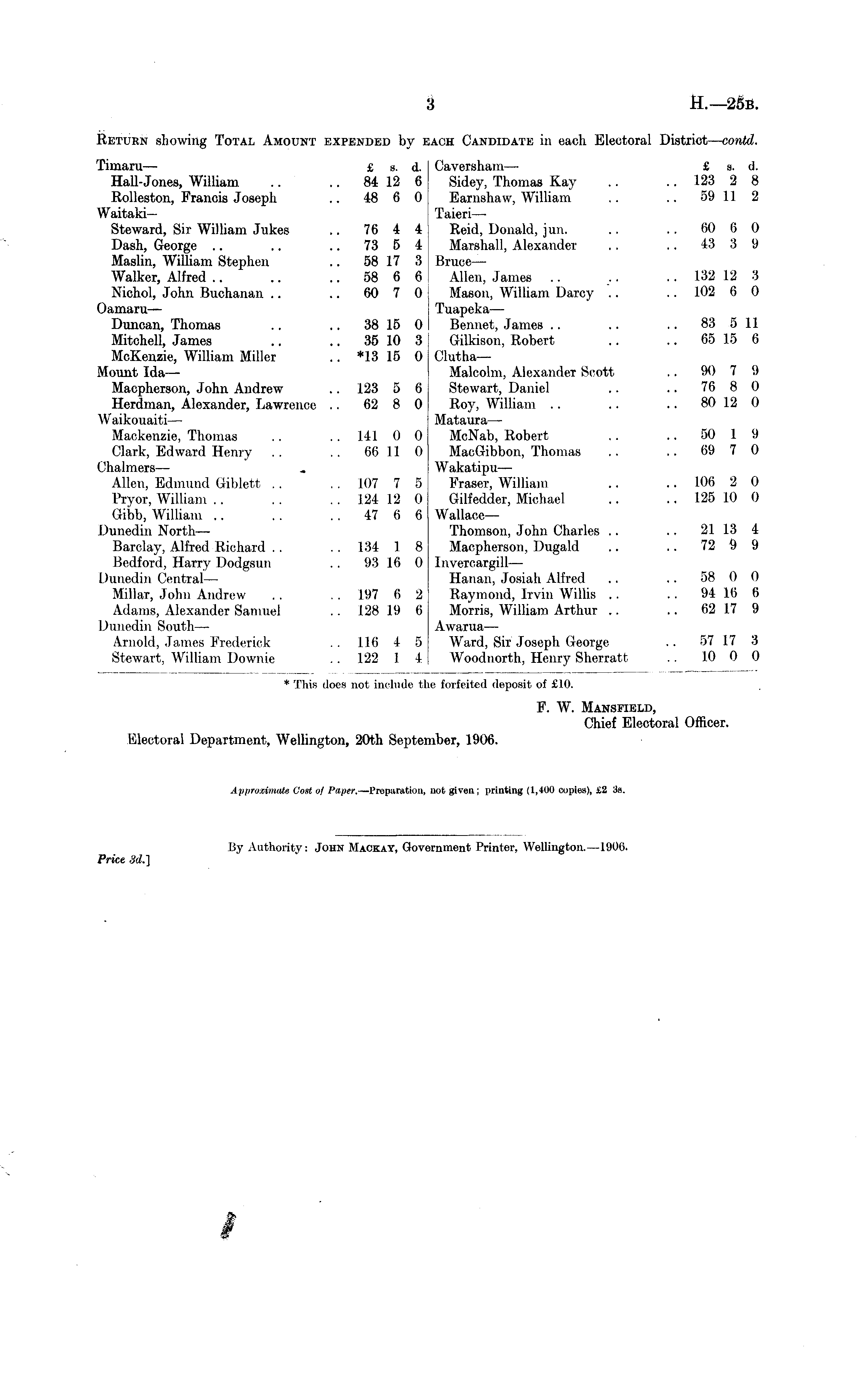 Tiinaru— £ a. d. I Hall-Jones, William .. .. 84 12 6 Rolleston, Francis Joseph .. 48 6 0 WaitakiSteward, Sir William Jukes .. 76 4 4 i Dash, George .. .. .. 73 5 4 Maslin, William Stephen .. 58 17 3 Walker, Alfred .. .. .. 58 6 6 Nichol, John Buchanan .. .. 60 7 0 Oamaru — Duncan, Thomas .. .. 38 15 0 i Mitchell, James .. .. 35 10 3 McKenzie, William Miller .. *13 15 0 Mount Ida— Macpherson, John Andrew .. 123 5 6 Herdman, Alexander, Lawrence .. 62 8 0 Waikouaiti — Mackenzie, Thomas .. .. 141 0 0 Clark, Edward Henry .. .. 66 11 0 ChalmersAllen, Edmund Giblett .. .. 107 7 5 Pryor, William .. .. .. 124 12 0 Gibb, William .. .. .. 47 6 6 Dimedin North— Barclay, Alfred Richard .. .. 134 1 8 Bedford, Harry Dodgsun .. 93 16 0 Dunedin Central— Millar, John Andrew .. .. 197 (i 2 Adams, Alexander Samuel .. 128 19 6 Dunedin South —■ Arnold, .lames Frederick .. 116 4 5 Stewart, William Downie .. 122 1 4