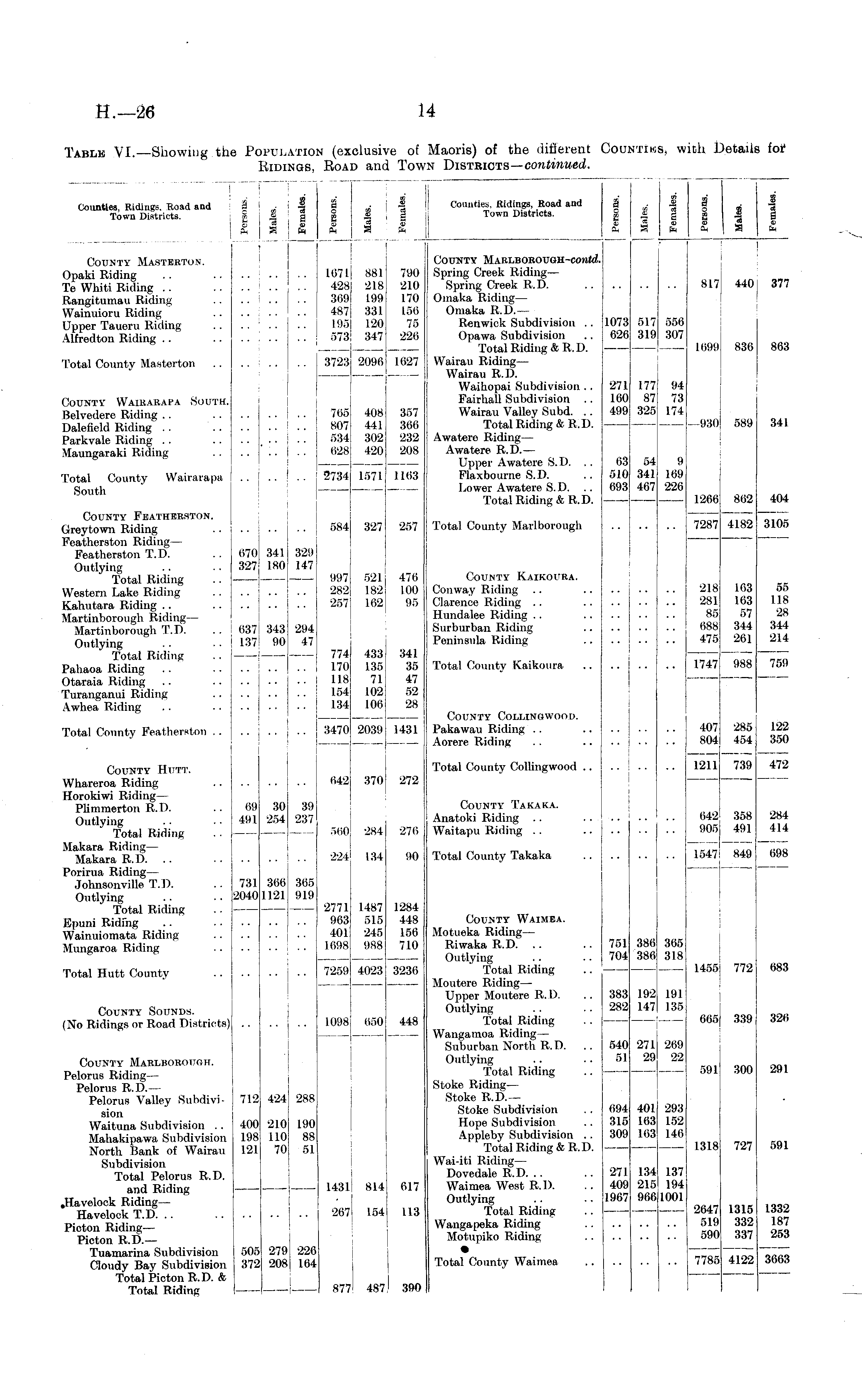 Table VI.—Showing the Population (exclusive of Maoris) of the different Counties, with Details for Ridings, Road and Town Districts— continued.
