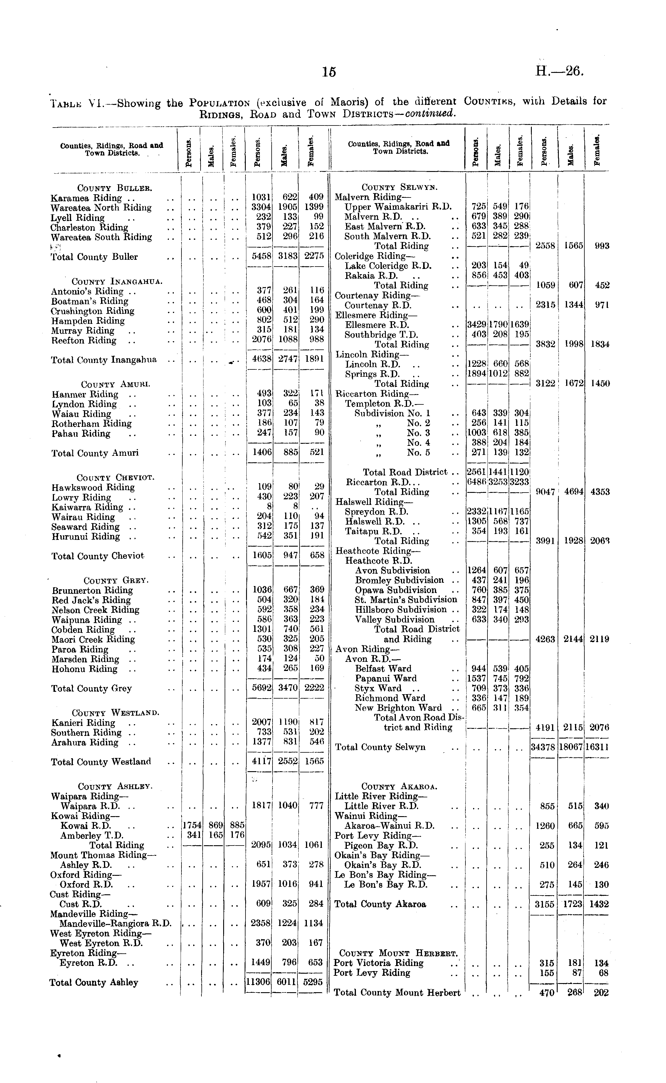 Table VI.—Showing the Population (exclusive of Maoris) of the different Counties, with Details for Ridings, Road and Town Districts— continued.