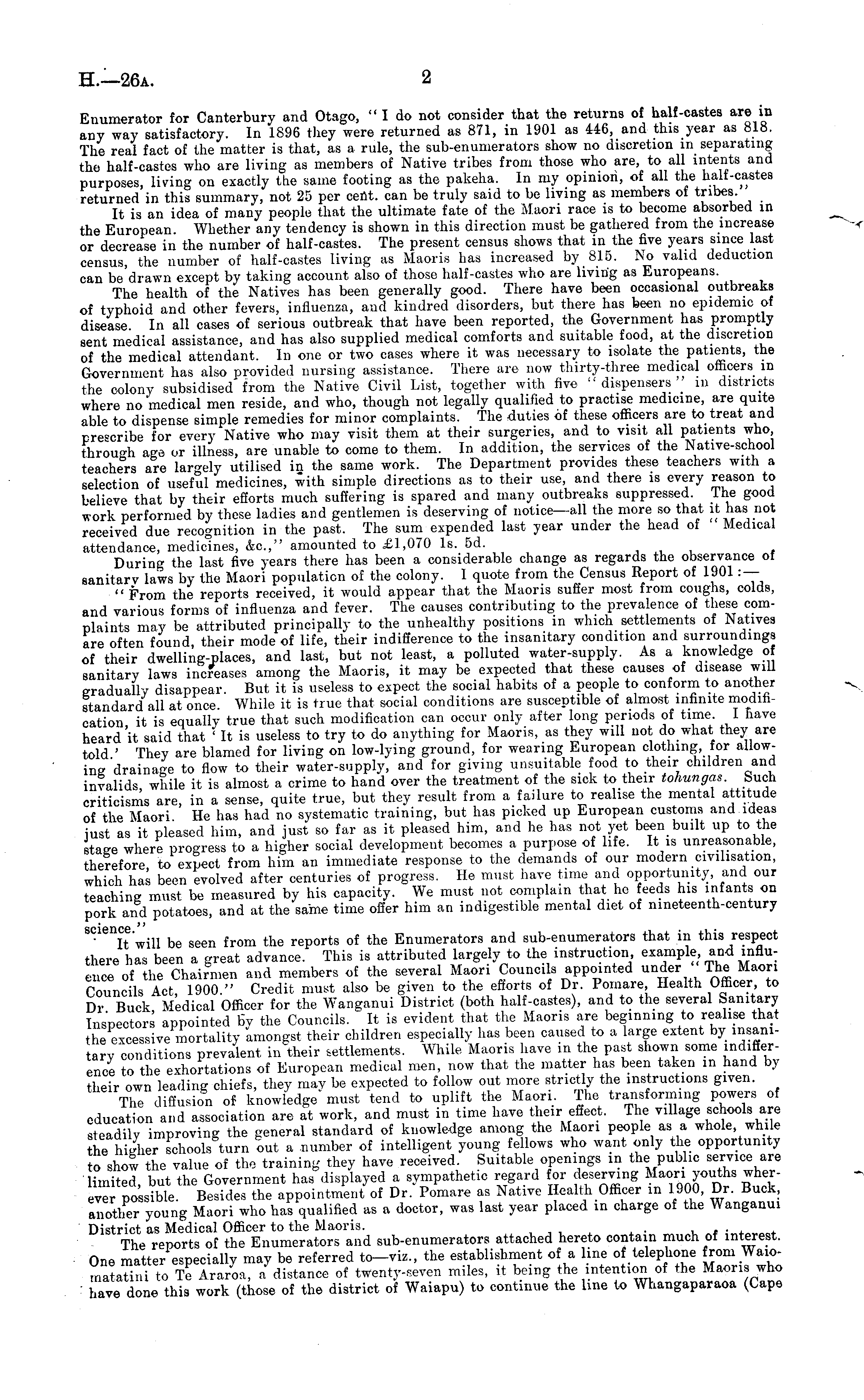 Enumerator for Canterbury and Otago, " I do not consider that the returns of half-castes are in any way satisfactory. In 1896 they were returned as 871, in 1901 as 446, and this year as 818. The real fact of the matter is that, as a rule, the sub-enumerators show no discretion in separating the half-castes who are living as members of Native tribes from those who are, to all intents and purposes, living on exactly the same footing as the pakeha. In my opinion, of all the half-castes returned in this summary, not 25 per cent, can be truly said to be living as members ot tribes. It is an idea of many people that the ultimate fate of the Maori race is to become absorbed in the European Whether any tendency is shown in this direction must be gathered from the increase or decrease in the number of half-castes. The present census shows that in the five years since last census, the number of half-castes living as Maoris has increased by 810. No valid deduction can be drawn except by taking account also of those half-castes who are living as Europeans. The health of the Natives has been generally good. There have been occasional outbreaks of typhoid and other fevers, influenza, and kindred disorders, but there has been no epidemic of disease In all cases of serious outbreak that have been reported, the Government has promptly sent medical assistance, and has also supplied medical comforts and suitable food, at the discretion of the medical attendant. In one or two cases where it was necessary to isolate the patients, the Government has also provided nursing assistance. There are now thirty-three medical officers in the colony subsidised" from the Native Civil List, together with five "dispensers _ in districts where no medical men reside, and who, though not legally qualified to practise medicine, are quite able to dispense simple remedies for minor complaints. The duties of these officers are to treat and prescribe for every Native who may visit them at their surgeries, and to visit all patients who, through age or illness, are unable to come to them. In addition, the services of the Native-school teachers are largely utilised in the same work. The Department provides these teachers with a selection of useful medicines, with simple directions as to their use, and there is every reason to believe that by their efforts much suffering is spared and many outbreaks suppressed. The good work performed by these ladies and gentlemen is deserving of notice—all the more so that it has not received due recognition in the past. The sum expended last year under the head of Medical attendance, medicines, &c," amounted to £1,070 Is. sd. During the last five years there has been a considerable change as regards the observance of eanitarv laws by the Maori population of the colony. I quote from the Census Report of 1901 : — " From the reports received, it would appear that the Maoris suffer most from coughs, colds, and various forms of influenza and fever. The causes contributing to the prevalence of these complaints may be attributed principally to the unhealthy positions in which settlements of Natives are often found, their mode of life, their indifference to the insanitary condition and surroundings of their dwelling-places, and last, but not least, a polluted water-supply. As a knowledge of sanitary laws increases among the Maoris, it may be expected that these causes of disease will gradually disappear. But it is useless to expect the social habits of a people to conform to another standard all at once While it is true that social conditions are susceptible of almost infinite modification it is equally true that such modification can occur only after long periods of time. I have heard 'it said that : It is useless to try to do anything for Maoris, as they will not do what they are told ' They are blamed for living on low-lying ground, for wearing European clothing, for allowing drainage to flow to their water-supply, and for giving unsuitable food to their children and invalids while it is almost a crime to hand over the treatment of the sick to their tohungas. Such criticisms are, in a sense, quite true, but they result from a failure to realise the mental attitude of the Maori He has had no systematic training, but has picked up European customs and ideas iust as it pleased him, and just so far as it pleased him, and he has not yet been built up to the stage where progress to a higher social development becomes a purpose of life. It is unreasonable, therefore to expect from him an immediate response to the demands of our modern civilisation, which has been evolved after centuries of progress. He must have time and opportunity, and our teaching must be measured by his capacity. We must not complain that he feeds his infants on pork and potatoes, and at the same time offer him an indigestible mental diet of nmeteenth-century S " e "lt will be seen from the reports of the Enumerators and sub-enumerators that in this respect there has been a great advance. This is attributed largely to the instruction example and influence of the Chairmen and members of the several Maori Councils appointed under Ihe Maori Councils Ace 1900." Credit must also be given to the efforts of Dr. Pomare, Health Officer, to Di Buck Medical Officer for the Wanganui District (both half-castes), and to the several Sanitary Inspectors appointed by the Councils. It is evident that the Maoris are beginning to realise that the excessive mortality amongst their children especially has been caused to a large extent by insanitary conditions prevalent in their settlements. While Maoris have in the past shown some indifference to the exhortations of European medical men, now that the matter has been taken in hand by their own leading chiefs, they may be expected to follow out more strictly the instructions given. The diffusion of knowledge' must "tend to uplift the Maori. The transforming powers of education and association are at work, an