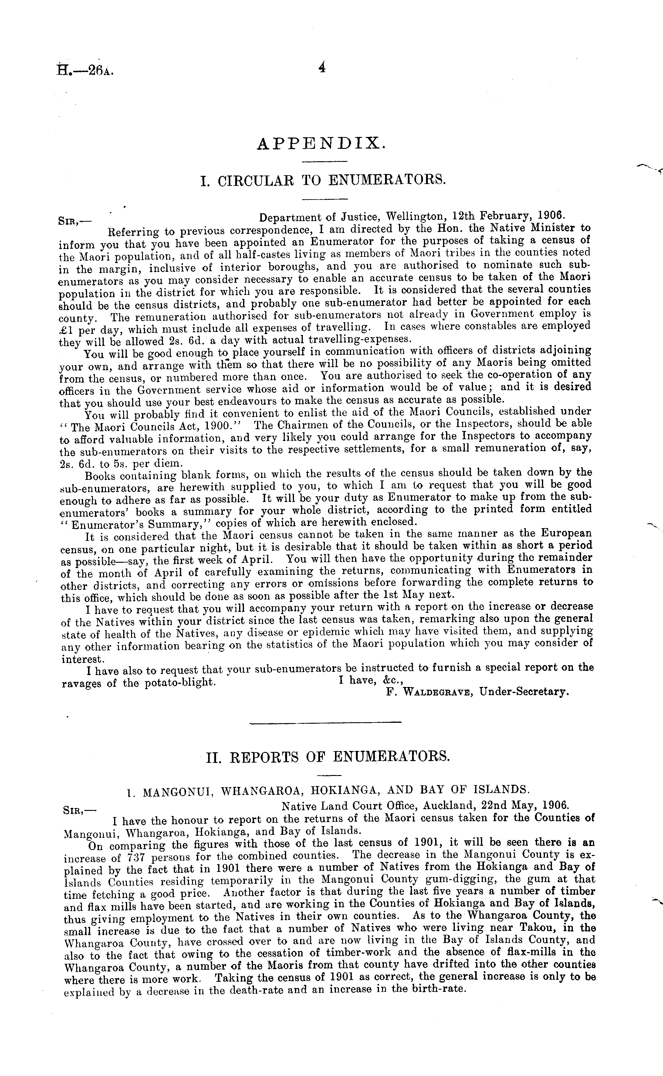 I. CIRCULAR TO ENUMERATORS. g IRj Department of Justice, Wellington, 12th February, 1906. Referring to previous correspondence, I am directed by the Hon. the Native Minister to inform you that you have been appointed an Enumerator for the purposes of taking a census of the Maori population, and of all half-castes living as members of Maori tribes in the counties noted in the margin, inclusive of interior boroughs, and you are authorised to nominate such subenumerators as you may consider necessary to enable an accurate census to be taken of the Maori population in the district for which you are responsible. It is considered that the several counties should be the census districts, and probably one sub-enumerator had better be appointed for each county The remuneration authorised for sub-enumerators not already in Government employ is £1 per day, which must include all expenses of travelling. In cases where constables are employed they will be' allowed 2s. 6d. a day with actual travelling-expenses. You will be good enough to place yourself in communication with officers of districts adjoining your own, and arrange with them so that there will be no possibility of any Maoris being omitted from the census, or numbered more than once. You are authorised to seek the co-operation of any officers in the Government service whose aid or information would be of value; and it is desired that you should use your best endeavours to make the census as accurate as possible. You will probably find it convenient to enlist the aid of the Maori Councils, established under " The Maori Councils Act, 1900." The Chairmen of the Councils, or the Inspectors, should be able to afford valuable information, and very likely you could arrange for the Inspectors to accompany the sub-enumerators on their visits to the respective settlements, for a small remuneration of, say, 2s. 6d. to ss. per diem. Books containing blank forms, on which the results of the census should be taken down by the sub-enumerators, are herewith supplied to you, to which I am to request that you will be good enough to adhere as far as possible. It will be your duty as Enumerator to make up from the subenumerators' books a summary for your whole district, according to the printed form entitled " Enumerator's Summary," copies of which are herewith enclosed. It is considered that the Maori census cannot be taken in the same manner as the European census, on one particular night, but it is desirable that it should be taken within as short a period as possible say, the first week of April. You will then have the opportunity during the remainder of the month of April of carefully examining the returns, communicating with Enumerators in other districts, and correcting any errors or omissions before forwarding the complete returns to this office, which should be done as soon as possible after the Ist May next. I have to request that you will accompany your return with a report on the increase or decrease of the Natives within your district since the last census was taken, remarking also upon the general state of health of the Natives, any disease or epidemic which may have visited them, and supplying any other information bearing on the statistics of the Maori population which you may consider of interest. I have also to request that your sub-enumerators be instructed to furnish a special report on the ravages of the potato-blight. I have, &c, F. Waldegravb, Under-Secretary.