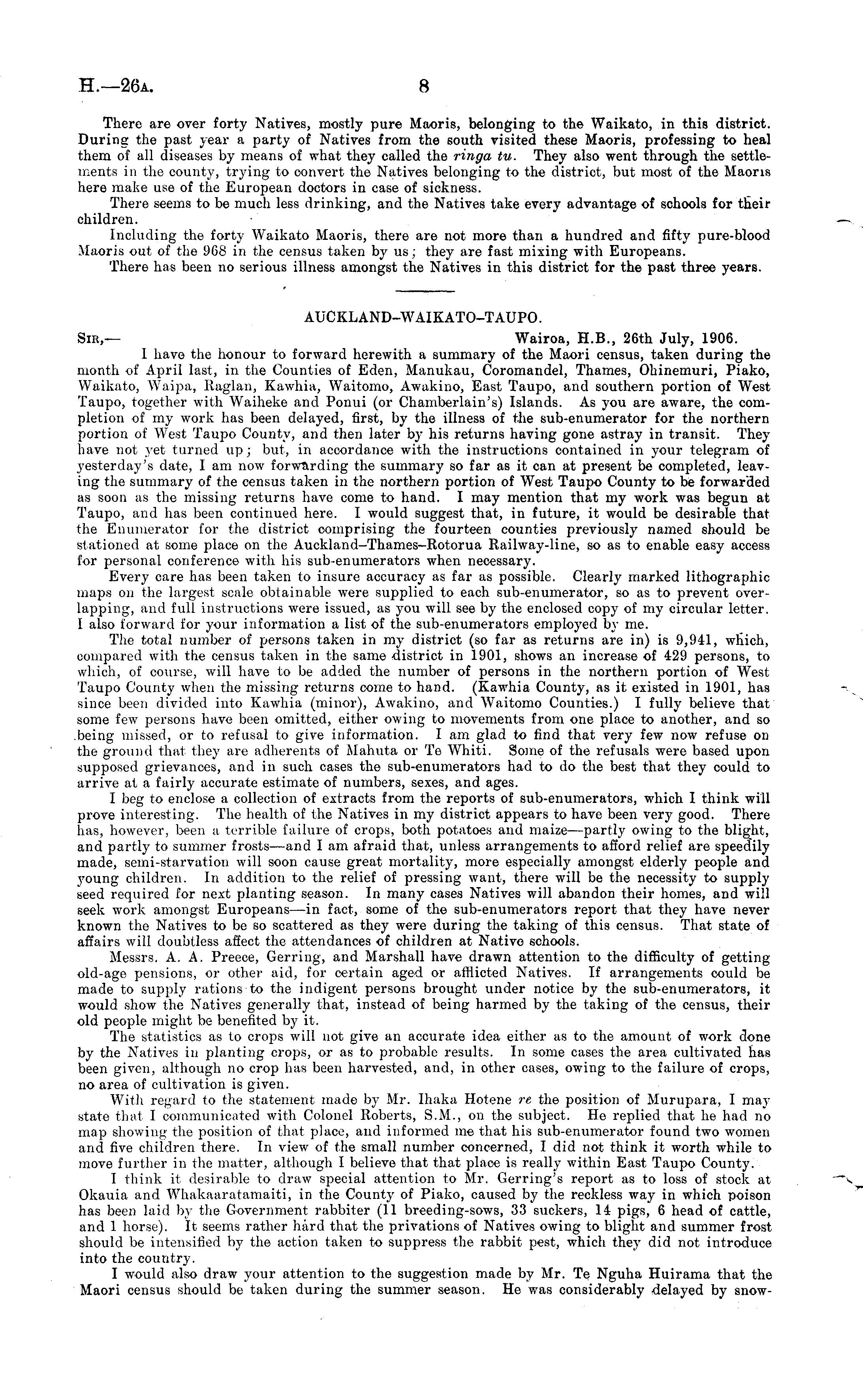 AUCKLAND-WAIKATO-TAUPO. Sir,— Wairoa, H. 8., 26th July, 1906. 1 have the honour to forward herewith a summary of the Maori census, taken during the month of April last, in the Counties of Eden, Manukau, Coromandel, Thames, Ohinemuri, Piako, Waikato, Waipa, Raglan, Kawhia, Waitomo, Awakino, East Taupo, and southern portion of West Taupo, together with Waiheke and Ponui (or Chamberlain's) Islands. As you are aware, the completion of my work has been delayed, first, by the illness of the sub-enumerator for the northern portion of West Taupo County, and then later by his returns having gone astray in transit. They have not yet turned up; but, in accordance with the instructions contained in your telegram of yesterday's date, I am now forwarding the summary so far as it can at present be completed, leaving the summary of the census taken in the northern portion of West Taupo County to be forwarded as soon as the missing returns have come to hand. I may mention that my work was begun at Taupo, and has been continued here. I would suggest that, in future, it would be desirable that the Enumerator for the district comprising the fourteen counties previously named should be stationed at some place on the Auckland-Thames-Rotorua Railway-line, so as to enable easy access for personal conference with his sub-enumerators when necessary. Every care has been taken to insure accuracy as far as possible. Clearly marked lithographic maps on the largest scale obtainable were supplied to each sub-enumerator, so as to prevent overlapping, and full instructions were issued, as you will see by the enclosed copy of my circular letter. I also forward for your information a list of the sub-enumerators employed by me. The total number of persons taken in my district (so far as returns are in) is 9,941, which, compared with the census taken in the same district in 1901, shows an increase of 429 persons, to which, of course, will have to be added the number of persons in the northern portion of West Taupo County when the missing returns come to hand. (Kawhia County, as it existed in 1901, has since been divided into Kawhia (minor), Awakino, and Waitomo Counties.) I fully believe that some few persons have been omitted, either owing to movements from one place to another, and so being missed, or to refusal to give information. lam glad to find that very few now refuse on the ground that they are adherents of Mahuta or Te Whiti. Some of the refusals were based upon supposed grievances, and in such cases the sub-enumerators had to do the best that they could to arrive at a fairly accurate estimate of numbers, sexes, and ages. I beg to enclose a collection of extracts from the reports of sub-enumerators, which I think will prove interesting. The health of the Natives in my district appears to have been very good. There has, however, been a terrible failure of crops, both potatoes and maize—parti}- owing to the blight, and partly to summer frosts—and I am afraid that, unless arrangements to afford relief are speedily made, semi-starvation will soon cause great mortality, more especially amongst elderly people and 3'oung children. In addition to the relief of pressing want, there will be the necessity to supply seed required for next planting season. In many cases Natives will abandon their homes, and will seek work amongst Europeans—in fact, some of the sub-enumerators report that they have never known the Natives to be so scattered as they were during the taking of this census. That state of affairs will doubtless affect the attendances of children at Native schools. Messrs. A. A. Preece, Gerring, and Marshall have drawn attention to the difficulty of getting old-age pensions, or other aid, for certain aged or afflicted Natives. If arrangements could be made to supply rations to the indigent persons brought under notice by the sub-enumerators, it would show the Natives generally that, instead of being harmed by the taking of the census, their old people might be benefited by it. The statistics as to crops will not give an accurate idea either as to the amount of work done by the Natives in planting crops, or as to probable results. In some cases the area cultivated has been given, although no crop has been harvested, and, in other cases, owing to the failure of crops, no area of cultivation is given. With regard to the statement made b} - Mr. Ihaka Hotene re the position of Murupara, I may state that I communicated with Colonel Roberts, S.M., on the subject. He replied that he had no map showing the position of that place, and informed me that his sub-enumerator found two women and five children there. In view of the small number concerned, I did not think it worth while to move further in the matter, although I believe that that pluce is really within East Taupo County. I think it desirable to draw special attention to Mr. Gerring's report as to loss of stock at Okauia and Whakaaratamaiti, in the County of Piako, caused by the reckless way in which poison has been laid by the Government rabbiter (11 breeding-sows, 33 suckers, 14 pigs, 6 head of cattle, and 1 horse). It seems rather hard that the privations of Natives owing to blight and summer frost should be intensified by the action taken to suppress the rabbit pest, which they did not introduce into the country. I would also draw your attention to the suggestion made by Mr. Te Nguha Huirama that the Maori census should be taken during the summer season. He was considerably delayed by snow-