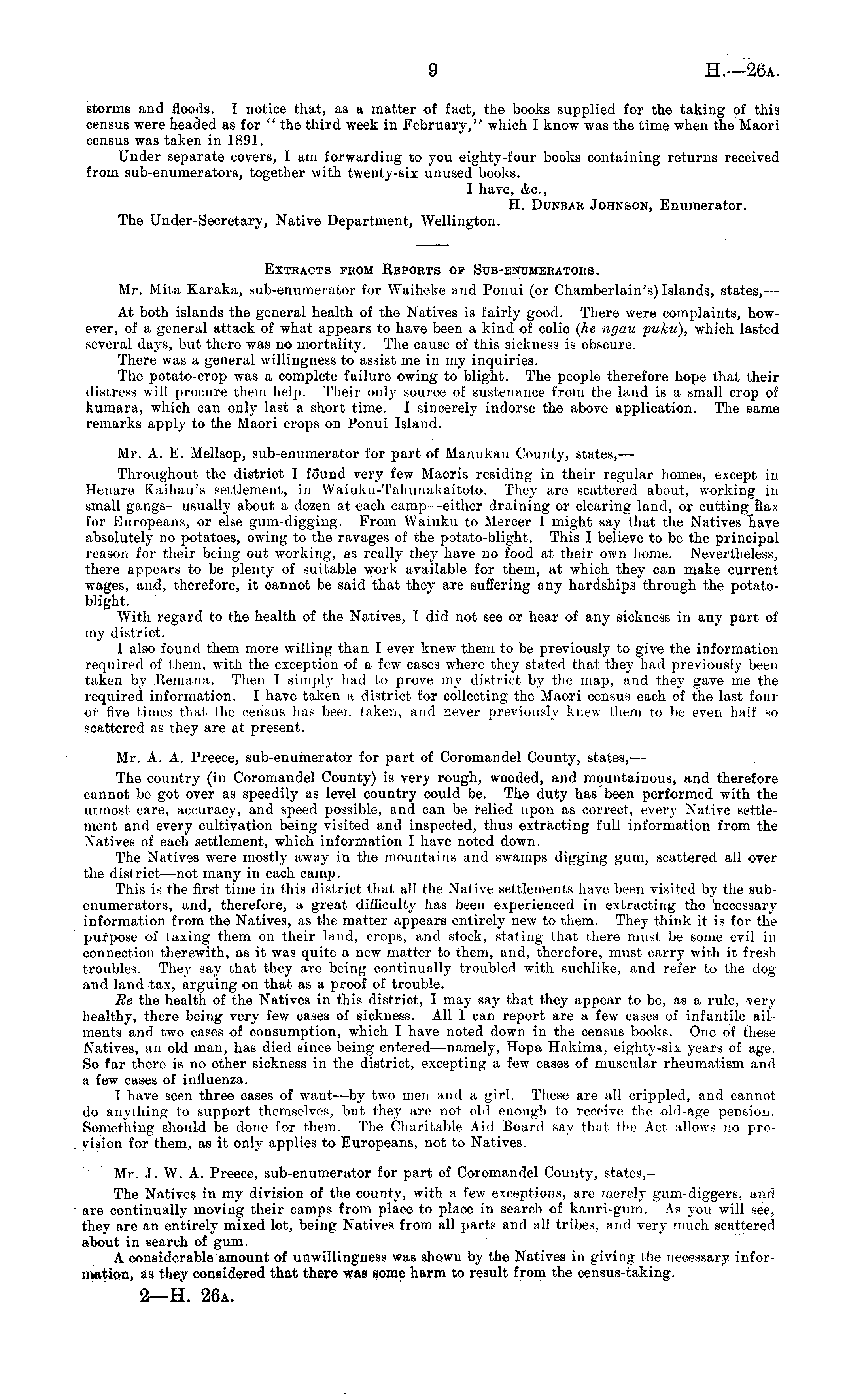Extracts from Reports op Sub-enumerators. Mr. Mita Karaka, sub-enumerator for Waiheke and Ponui (or Chamberlain's) Islands, states, — At both islands the general health of the Natives is fairly good. There were complaints, however, of a general attack of what appears to have been a kind of colic (he ngau puku), which lasted several days, but there was no mortality. The cause of this sickness is obscure. There was a general willingness to assist me in my inquiries. The potato-crop was a complete failure owing to blight. The people therefore hope that their distress will procure them help. Their only source of sustenance from the land is a small crop of kumara, which can only last a short time. I sincerely indorse the above application. The same remarks apply to the Maori crops on Ponui Island. Mr. A. E. Mellsop, sub-enumerator for part of Manukau County, states, — Throughout the district I found very few Maoris residing in their regular homes, except in Henare Kaihau's settlement, in Waiuku-Tahunakaitoto. They are scattered about, working in small gangs—usually about a dozen at each camp—either draining or clearing land, or cutting flax for Europeans, or else gum-digging. From Waiuku to Mercer I might say that the Natives have absolutely no potatoes, owing to the ravages of the potato-blight. This I believe to be the principal reason for their being out working, as really they have no food at their own home. Nevertheless, there appears to be plenty of suitable work available for them, at which they can make current wages, and, therefore, it cannot be said that they are suffering any hardships through the potatoblight, With regard to the health of the Natives, I did not see or hear of any sickness in any part of my district. I also found them more willing than I ever knew them to be previously to give the information required of them, with the exception of a few cases where they stated that they had previously been taken by Remana. Then I simply had to prove my district by the map, and they gave me the required information. I have taken n district for collecting the Maori census each of the last four or five times that the census has been taken, and never previously knew them to be even half so scattered as they are at present. Mr. A. A. Preece, sub-enumerator for part of Coromandel County, states, — The country (in Coromandel County) is very rough, wooded, and mountainous, and therefore cannot be got over as speedily as level country could be. The duty has been performed with the utmost care, accuracy, and speed possible, and can be relied upon as correct, every Native settlement and every cultivation being visited and inspected, thus extracting full information from the Natives of each settlement, which information I have noted down. The Natives were mostly away in the mountains and swamps digging gum, scattered all over the district—not many in each camp. This is the first time in this district that all the Native settlements have been visited by the subenumerators, and, therefore, a great difficulty lias been experienced in extracting the "necessary information from the Natives, as the matter appears entirely new to them. They think it is for the purpose of taxing them on their land, crops, and stock, stating that there must be some evil in connection therewith, as it was quite a new matter to them, and, therefore, must carry with it fresh troubles. The} , say that they are being continually troubled with suchlike, and refer to the dog and land tax, arguing on that as a proof of trouble. Re the health of the Natives in this district, I may say that they appear to be, as a rule, very healthy, there being very few cases of sickness. All I can report are a few cases of infantile ailments and two cases of consumption, which I have noted down in the census books. One of these Natives, an old man, has died since being entered—namely, Hopa Hakima, eighty-six years of age. So far there is no other sickness in the district, excepting a few cases of muscular rheumatism and a few cases of influenza. I have seen three cases of want—by two men and a girl. These are all crippled, and cannot do anything to support themselves, but they are not old enough to receive the old-age pension. Something should be done for them. The Charitable Aid Board say that the Act allows no provision for them, as it only applies to Europeans, not to Natives. Mr. J. W. A. Preece, sub-enumerator for part of Coromandel County, states, — The Natives in my division of the county, with a few exceptions, are merely gum-diggers, and are continually moving their camps from place to place in search of kauri-gum. As you will see, they are an entirely mixed lot, being Natives from all parts and all tribes, and very much scattered about in search of gum. A considerable amount of unwillingness was shown by the Natives in giving the necessary information, as they considered that there was some harm to result from the census-taking.