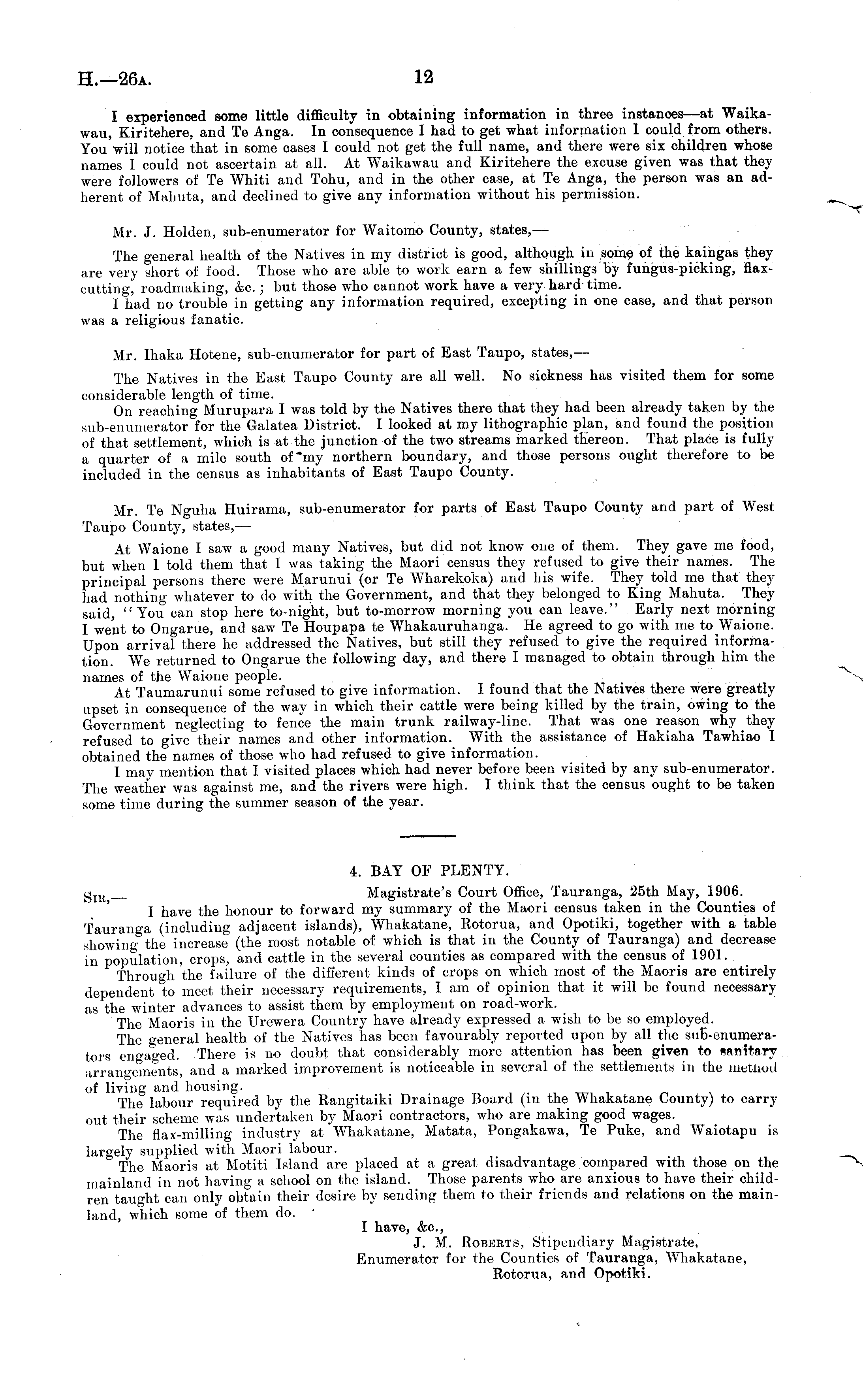 i. BAY OF PLENTY. g IK __ Magistrate's Court Office, Tauranga, 25th May, 1906. I have the honour to forward my summary of the Maori census taken in the Counties of Tauranga (including adjacent islands), Whakatane, Rotorua, and Opotiki, together with a table showing the increase (the most notable of which is that in the County of Tauranga) and decrease in population, crops, and cattle in the several counties as compared with the census of 1901. Through the failure of the different kinds of crops on which most of the Maoris are entirely dependent to meet their necessary requirements, I am of opinion that it will be found necessary as the winter advances to assist them by employment on road-work. _ The Maoris in the Urewera Country have already expressed a wish to be so employed. The general health of the Natives has been favourably reported upon by all the sub-enumerat-ors engaged. There is no doubt that considerably more attention has been given to sanitary arrangements, and a marked improvement is noticeable in several of the settlements in the method of living and housing. The labour required by the Rangitaiki Drainage Board (in the Whakatane County) to carry out their scheme was undertaken by Maori contractors, who are making good wages. The flax-milling industry at Whakatane, Matata, Pongakawa, Te Puke, and Waiotapu is largely supplied with Maori labour. The Maoris at Motiti Island are placed at a great disadvantage compared with those on the mainland in not having a school on the island. Those parents who are anxious to have their children taught can only obtain their desire by sending them to their friends and relations on the mainland, which some of them do. " I have, &c, J. M. Roberts, Stipendiary Magistrate, Enumerator for the Counties of Tauranga, Whakatane, Rotorua, and Opotiki.