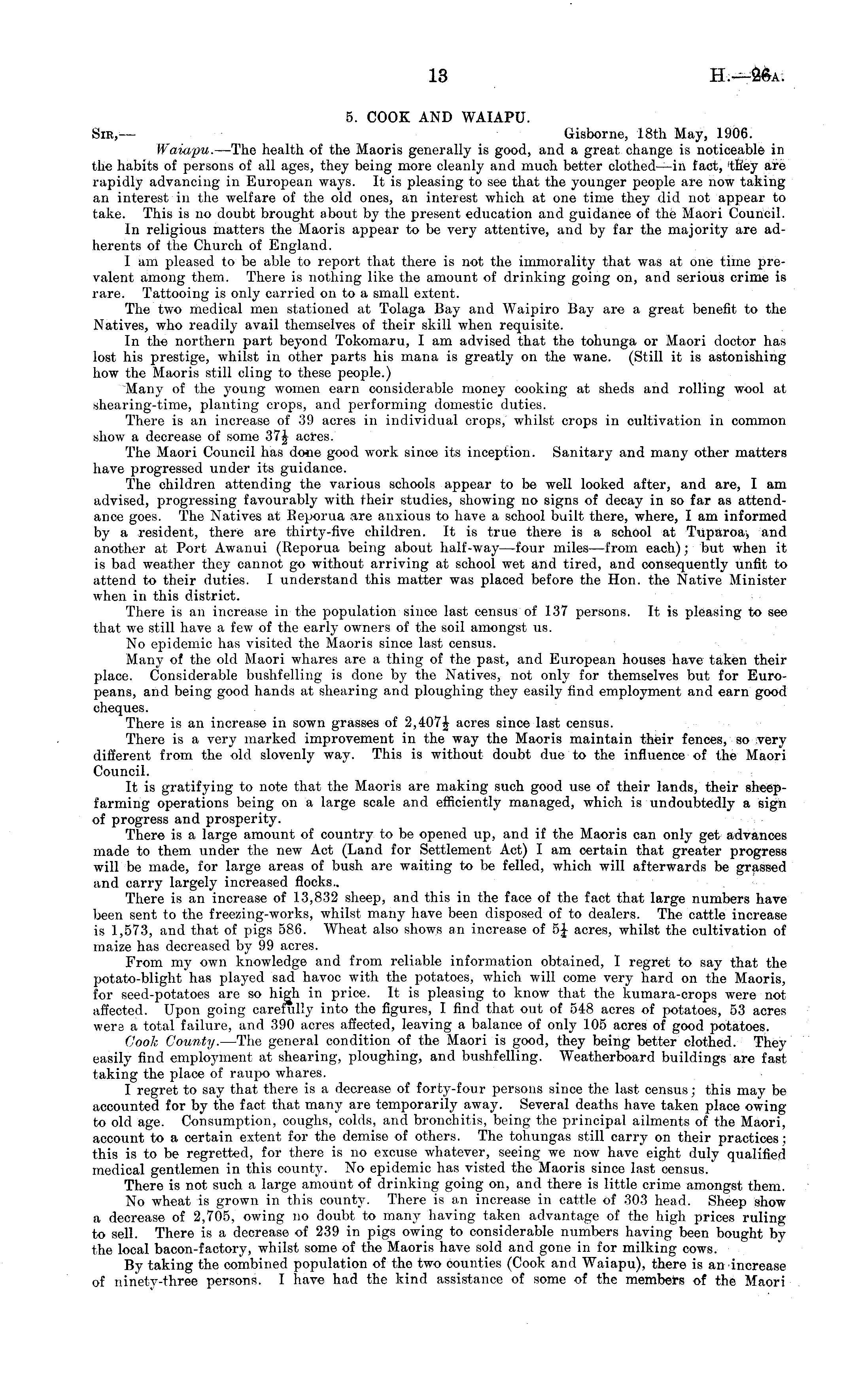 5. COOK AND WAIAPU. Sir,— (iisborne, 18th May, 1906. iVaiapu. —The health of the Maoris generally is good, and a great change is noticeable in the habits of persons of all ages, they being more cleanly and much better clothed —in fact, they are rapidly advancing in European ways. It is pleasing to see that the younger people are now taking an interest in the welfare of the old ones, an interest which at one time they did not appear to take. This is no doubt brought about by the present education and guidance of the Maori Council. In religious matters the Maoris appear to be very attentive, and by far the majority are adherents of the Church of England. I am pleased to be able to report that there is not the immorality that was at one time prevalent among them. There is nothing like the amount of drinking going on, and serious crime is rare. Tattooing is only carried on to a small extent. The two medical men stationed at Tolaga Bay and Waipiro Bay are a great benefit to the Natives, who readily avail themselves of their skill when requisite. In the northern part beyond Tokomaru, I am advised that the tohunga or Maori doctor has lost his prestige, whilst in other parts his mana is greatly on the wane. (Still it is astonishing how the Maoris still cling to these people.) Many of the young women earn considerable money cooking at sheds and rolling wool at shearing-time, planting crops, and performing domestic duties. There is an increase of 39 acres in individual crops, whilst crops in cultivation in common show a decrease of some 37J acres. The Maori Council has done good work since its inception. Sanitary and many other matters have progressed under its guidance. The children attending the various schools appear to be well looked after, and are, I am advised, progressing favourably with their studies, showing no signs of decay in so far as attendance goes. The Natives at Beporua are anxious to have a school built there, where, lam informed by a resident, there are thirty-five children. It is true there is a school at Tuparoa, and another at Port Awanui (.Reporua being about half-way—four miles—from each); but when it is bad weather they cannot go without arriving at school wet and tired, and consequently unfit to attend to their duties. I understand this matter was placed before the Hon. the Native Minister when in this district. There is an increase in the population since last census of 137 persons. It is pleasing to see that we still have a few of the early owners of the soil amongst us. No epidemic has visited the Maoris since last census. Many of the old Maori whares are a thing of the past, and European houses have taken their place. Considerable bushfelling is done by the Natives, not only for themselves but for Europeans, and being good hands at shearing and ploughing they easily find employment and earn good cheques. There is an increase in sown grasses of acres since last census. There is a very marked improvement in the way the Maoris maintain their fences, so very different from the old slovenly way. This is without doubt due to the influence of the Maori Council. It is gratifying to note that the Maoris are making such good use of their lands, their sheepfarming operations being on a large scale and efficiently managed, which is undoubtedly a sign of progress and prosperity. There is a large amount of country to be opened up, and if the Maoris can onlj- get advances made to them under the new Act (Land for Settlement Act) I am certain that greater progress will be made, for large areas of bush are waiting to be felled, which will afterwards be grassed and carry largely increased flocks.. There is an increase of 13,832 sheep, and this in the face of the fact that large numbers have been sent to the freezing-works, whilst many have been disposed of to dealers. The cattle increase is 1,573, and that of pigs 586. Wheat also shows an increase of 5J acres, whilst the cultivation of maize has decreased by 99 acres. From my own knowledge and from reliable information obtained, I regret to say that the potato-blight has played sad havoc with the potatoes, which will come very hard on the Maoris, for seed-potatoes are so high in price. It is pleasing to know that the kumara-crops were not affected. Upon going carefully into the figures, I find that out of 548 acres of potatoes, 53 acres were a total failure, and 390 acres affected, leaving a balance of only 105 acres of good potatoes. Cook County. —The general condition of the Maori is good, they being better clothed. They easily find employment at shearing, ploughing, and bushfelling. Weatherboard buildings are fast taking the place of raupo whares. I regret to say that there is a decrease of forty-four persons since the last census; this may be accounted for by the fact that many are temporarily away. Several deaths have taken place owing to old age. Consumption, coughs, colds, and bronchitis, being the principal ailments of the Maori, account to a certain extent for the demise of others. The tohungas still carry on their practices ; this is to be regretted, for there is no excuse whatever, seeing we now have eight duly qualified medical gentlemen in this county. No epidemic has visted the Maoris since last census. There is not such a large amount of drinking going on, and there is little crime amongst them. No wheat is grown in this county. There is an increase in cattle of 303 head. Sheep show a decrease of 2,705, owing no doubt to many having taken advantage of the high prices ruling to sell. There is a decrease of 239 in pigs owing to considerable numbers having been bought by the local bacon-factory, whilst some of the Maoris have sold and gone in for milking cows. By taking the combined population of the two counties (Cook and Waiapu), there is an increase of ninety-three persons. I have had the kind assistance of some of the members of the Maori