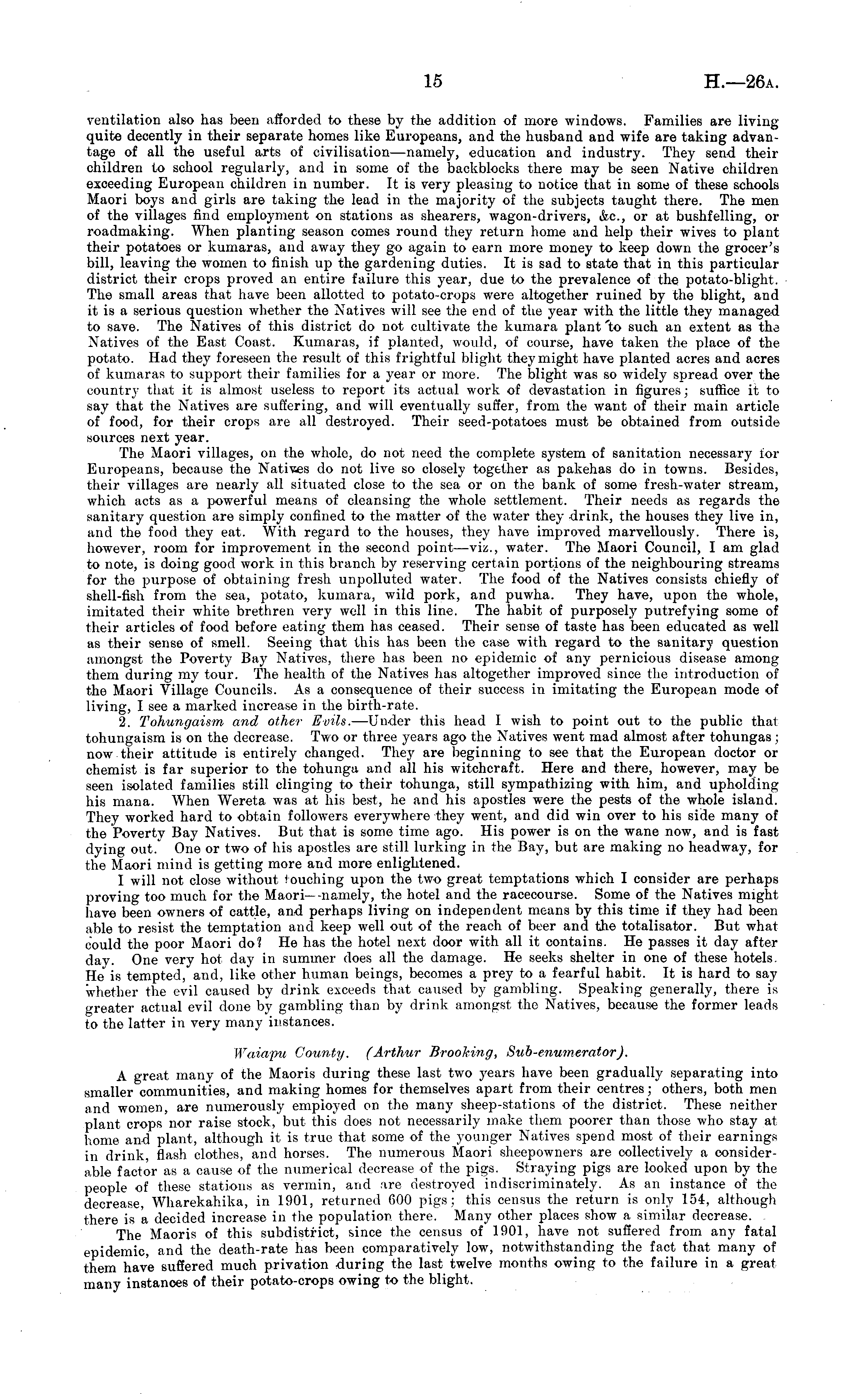 ventilation also has been afforded to these by the addition of more windows. Families are living quite decently in their separate homes like Europeans, and the husband and wife are taking advantage of all the useful arts of civilisation —namely, education and industry. They send their children to school regularly, and in some of the backblocks there may be seen Native children exceeding European children in number. It is very pleasing to notice that in some of these schools Maori boys and girls are taking the lead in the majority of the subjects taught there. The men of the villages find employment on stations as shearers, wagon-drivers, &c, or at bushfelling, or roadmaking. When planting season comes round they return home and help their wives to plant their potatoes or kumaras, and away they go again to earn more money to keep down the grocer's bill, leaving the women to finish up the gardening duties. It is sad to state that in this particular district their crops proved an entire failure this year, due to the prevalence of the potato-blight. The small areas that have been allotted to potato-crops were altogether ruined by the blight, and it is a serious question whether the Natives will see the end of the year with the little they managed to save. The Natives of this district do not cultivate the kumara plant 'to such an extent as the Natives of the East Const. Kumaras, if planted, would, of course, have taken the place of the potato. Had they foreseen the result of this frightful blight they might have planted acres and acres of kumaras to support their families for a year or more. The blight was so widely spread over the country that it is almost useless to report its actual work of devastation in figures; suffice it to say that the Natives are suffering, and will eventually suffer, from the want of their main article of food, for their crops are all destroyed. Their seed-potatoes must be obtained from outside sources next year. The Maori villages, on the whole, do not need the complete system of sanitation necessary for Europeans, because the Natives do not live so closely together as pakehas do in towns. Besides, their villages are nearly all situated close to the sea or on the bank of some fresh-water stream, which acts as a powerful means of cleansing the whole settlement. Their needs as regards the sanitary question are simply confined to the matter of the water they drink, the houses they live in, and the food they eat. With regard to the houses, they have improved marvellously. There is, however, room for improvement in the second point—viz., water. The Maori Council, lam glad to note, is doing good work in this branch by reserving certain portions of the neighbouring streams for the purpose of obtaining fresh unpolluted water. The food of the Natives consists chiefly of shell-fish from the sea, potato, kumara, wild pork, and puwha. They have, upon the whole, imitated their white brethren very well in this line. The habit of purposely putrefying some of their articles of food before eating them has ceased. Their sense of taste has been educated as well as their sense of smell. Seeing that this has been the case with regard to the sanitary question amongst the Poverty Bay Natives, there has been no epidemic of any pernicious disease among them during my tour. The health of the Natives has altogether improved since the introduction of the Maori Village Councils. As a consequence of their success in imitating the European mode of living, I see a marked increase in the birth-rate. 2. Tohungaism and other Evils. —Under this head I wish to point out to the public that tohungaism is on the decrease. Two or three years ago the Natives went mad almost after tohungas ; now their attitude is entirely changed. They are beginning to see that the European doctor or chemist is far superior to the tohunga and all his witchcraft. Here and there, however, may be seen isolated families still clinging to their tohunga, still sympathizing with him, and upholding his mana. When Wereta was at his best, he and his apostles were the pests of the whole island. They worked hard to obtain followers everywhere they went, and did win over to his side many of the Poverty Bay Natives. But that is some time ago. His power is on the wane now, and is fast dying out. One or two of his apostles are still lurking in the Bay, but are making no headway, for the Maori mind is getting more and more enlightened. I will not close without touching upon the two great temptations which I consider are perhaps proving too much for the Maori—-namely, the hotel and the racecourse. Some of the Natives might have been owners of cattle, and perhaps living on independent means by this time if they had been able to resist the temptation and keep well out of the reach of beer and the totalisator. But what could the poor Maori do? He has the hotel next door with all it contains. He passes it day after day. One very hot day in summer does all the damage. He seeks shelter in one of these hotels. He* is tempted, and, like other human beings, becomes a prey to a fearful habit. It is hard to say whether the evil caused by drink exceeds that caused by gambling. Speaking generally, there is greater actual evil done by gambling than by drink amongst the Natives, because the former leads to the latter in very many instances. Waiapu County. (Arthur Brooking, Sub-enumerator). A great many of the Maoris during these last two years have been gradually separating into smaller communities, and making homes for themselves apart from their centres; others, both men and women, are numerously employed on the many sheep-stations of the district. These neither plant crops nor raise stock, but this does not necessarily make them poorer than those who stay at home and plant, although it is true that some of the younger Natives spend most of their earnings in drink, flash clothes, and horses. The numerous Maori sheepowners are collectively a consi