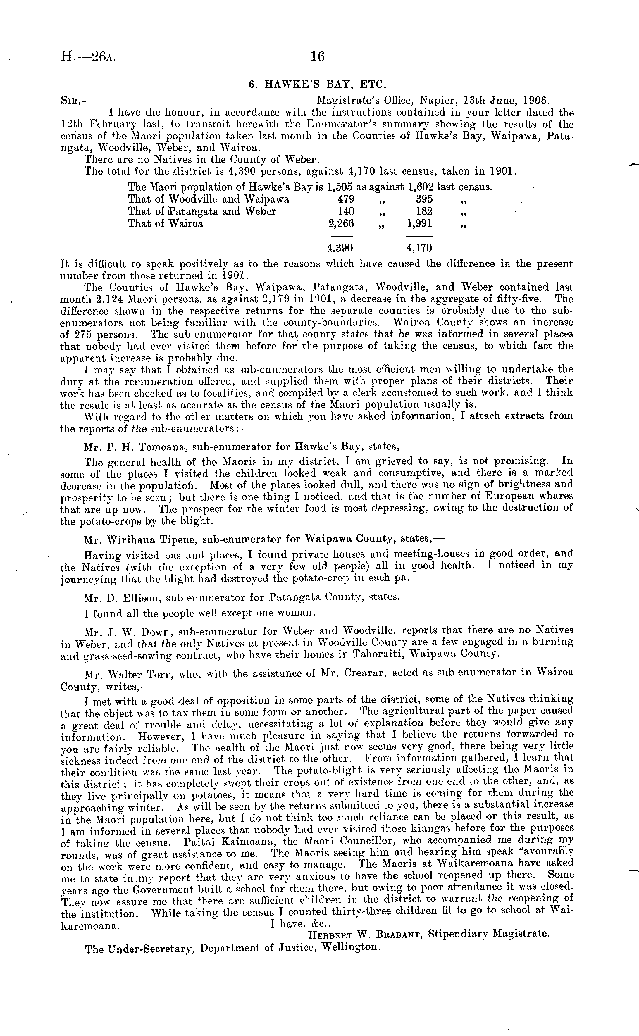 6. HAWKE'S BAY, ETC. Sir, — Magistrate's Office, Napier, 13th June, 1906. I have the honour, in accordance with the instructions contained in your letter dated the 12th February last, to transmit herewith the Enumerator's summary showing the results of the census of the Maori population taken last month in the Counties of Hawke's Bay, Waipawa, Patangata, Woodville, Weber, and Wairoa. There are no Natives in the County of Weber. The total for the district is 4,390 persons, against 4,170 last census, taken in 1901. The Maori population of Hawke's Bay is 1,505 as against 1,602 last census. That of Woodville and Waipawa 479 „ 395 That of jPatangata and Weber 140 „ 182 That of Wairoa 2,266 „ 1,991 4,390 4,170 It is difficult to speak positively as to the reasons which have caused the difference in the present number from those returned in 1901. The Counties of Hawke's Bay, Waipawa, Patangata, Woodville, and Weber contained last month 2,124 Maori persons, as against 2,179 in 1901, a decrease in the aggregate of fifty-five. The difference shown in the respective returns for the separate counties is probably due to the subenumerators not being familiar with the county-boundaries. Wairoa County shows an increase of 275 persons. The sub-enumerator for that county states that he was informed in several place* that nobody had ever visited them before for the purpose of taking the census, to which fact the apparent increase is probably due. I may say that I obtained as sub-enumerators the most efficient men willing to undertake the duty at the remuneration offered, and supplied them with proper plans of their districts. Their work has been checked as to localities, and compiled by a clerk accustomed to such work, and I think the result is at, least as accurate as the census of the Maori population usually is. With regard to the other matters on which you have asked information, I attach extracts from the reports of the sub-enumerators : — Mr. P. H. Tomoana, sub-enumerator for Hawke's Bay, states, — The general health of the Maoris in my district, I am grieved to say, is not promising. In some of the places I visited the children looked weak and consumptive, and there is a marked decrease in the populatioft. Most of the places looked dull, and there was no sign of brightness and prosperity to be seen ; but there is one thing I noticed, and that is the number of European whares that are up now. The prospect for the winter food is most depressing, owing to the destruction of the potato-crops by the blight. Mr. Wirihana Tipene, sub-enumerator for Waipawa County, states, — Having visited pas and places, I found private houses and meeting-houses in good order, and the Natives (with the exception of a very few old people) all in good health. I noticed in my journeying that the blight had destroyed the potato-crop in each pa. Mr. D. Ellison, sub-enumerator for Patangata County, states, — I found all the people well except one woman. Mr. J. W. Down, sub-enumerator for Weber and Woodville, reports that there are no Natives in Weber, and that the only Natives at present in Woodville County are a few engaged in a burning and grass-seed-sowing contract, who have their homes in Tahoraiti, Waipawa County. Mr. Walter Torr, who, with the assistance of Mr. Crearar, acted as sub-enumerator in Wairoa County, writes, — I met with a good deal of opposition in some parts of the district, some of the Natives thinking that the object was to tax them in some form or another. The agricultural part of the paper caused a great deal of trouble and delay, necessitating a lot of explanation before they would give any information. However, I have much pleasure in saying that I believe the returns forwarded to you are fairly reliable. The health of the Maori just now seems very good, there being very little sickness indeed from one end of the district to the other. From information gathered, I learn that their condition was the same last year. The potato-blight is very seriously affecting the Maoris in this district; it has completely swept their crops out of existence from one end to the other, and, as they live principally on potatoes, it means that a very hard time is coming for them during the approaching winter. As will be seen by the returns submitted to you, there is a substantial increase in the Maori population here, but I do not think too much reliance can be placed on this result, as I am informed in several places that nobody had ever visited those kiangas before for the purposes of taking the census. Paitai Kaimoana, the Maori Councillor, who accompanied me during my rounds, was of great assistance to me. The Maoris seeing him and hearing him speak favourably on the work were more confident, and easy to manage. The Maoris at Waikaremoana have asked me to state in my report that they are very anxious to have the school reopened up there. Some years ago the Government built a school for them there, but owing to poor attendance it was closed. They now assure me that there are sufficient children in the district to warrant the reopening of the institution. While taking the census I counted thirty-three children fit to go to school at Waikaremoana. I have, &c, _ Herbert W. Brabant, Stipendiary Magistrate. The Under-Secretary, Department of Justice, Wellington.