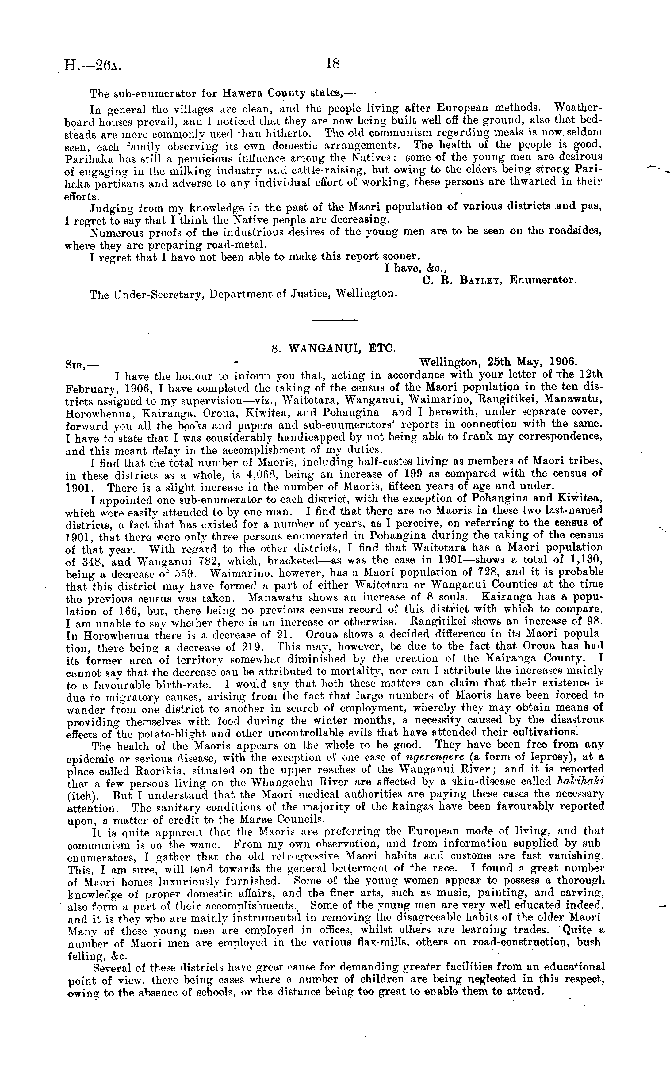The sub-enumerator for Hawera County states, — In general the villages are clean, and the people living after European methods. Weatherboard houses prevail, and I noticed that they are now being built well off the ground, also that bedsteads are more commonly used than hitherto. The old communism regarding meals is now seldom seen, each family observing its own domestic arrangements. The health of the people is good. Parihaka has still a pernicious influence among the Natives: some of the young men are desirous of engaging in the milking industry and cattle-raising, but owing to the elders being strong Parihaka partisans and adverse to any individual effort of working, these persons are thwarted in their efforts. Judging from my knowledge in the past of the Maori population of various districts and pas, I regret to say that I think the Native people are decreasing. Numerous proofs of the industrious desires of the young men are to be seen on the roadsides, where they are preparing road-metal. I regret that I have not been able to make this report sooner. I have, &c, C. R. Bayley, Enumerator. The Under-Secretary, Department of Justice, Wellington.