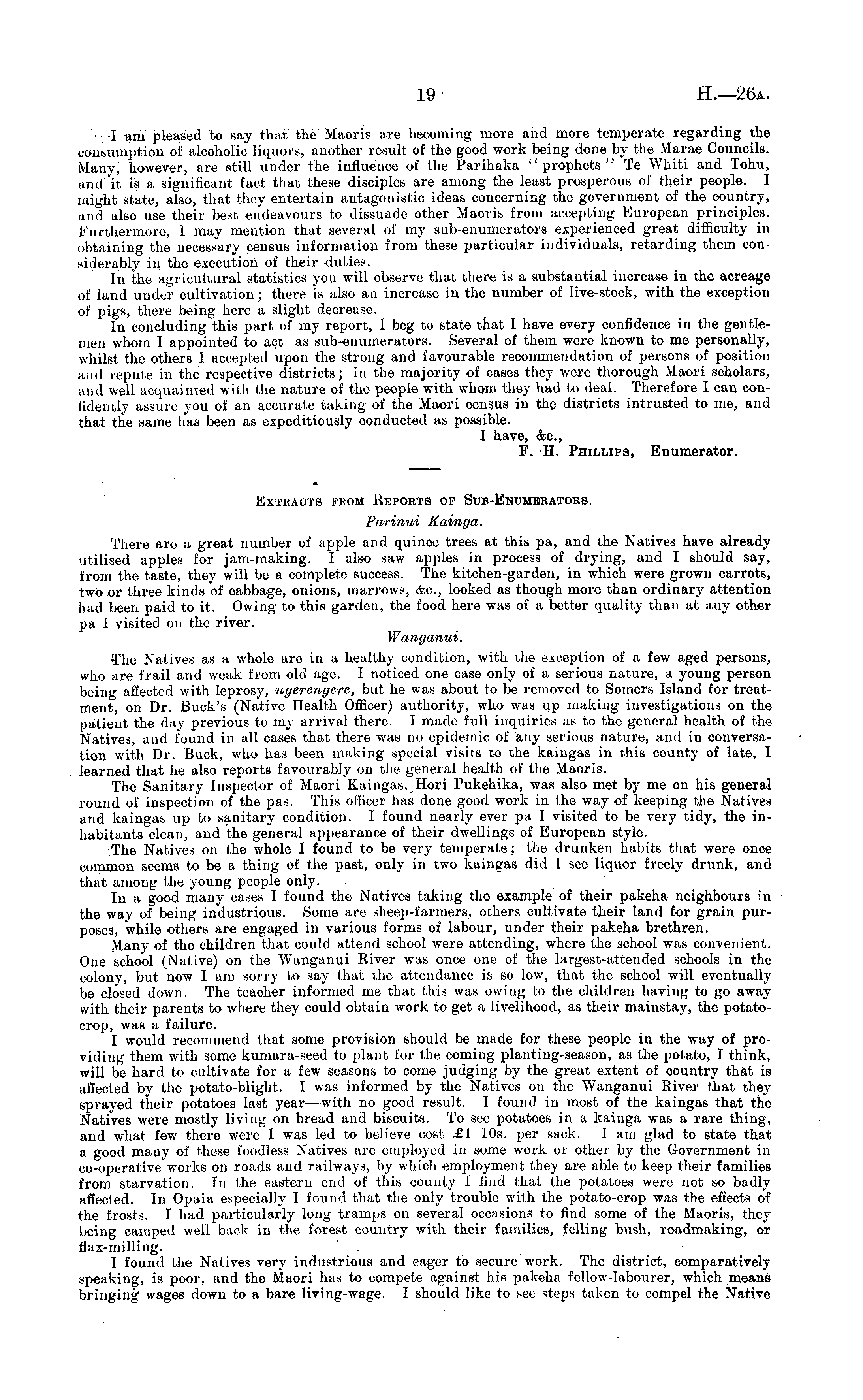 I am pleased to say that the Maoris are becoming more and more temperate regarding the consumption of alcoholic liquors, another result of the good work being done by the Marae Councils. Many, however, are still under the influence of the Parihaka "prophets" Te Whiti and Tohu, and it is a significant fact that these disciples are among the least prosperous of their people. I might state, also, that they entertain antagonistic ideas concerning the government of the country, and also use their best endeavours to dissuade other Maoris from accepting European principles. Furthermore, 1 may mention that several of my sub-enumerators experienced great difficulty in obtaining the necessary census information from these particular individuals, retarding them considerably in the execution of their duties. In the agricultural statistics you will observe that there is a substantial increase in the acreage of land under cultivation; there is also an increase in the number of live-stock, with the exception of pigs, there being here a slight decrease. In concluding this part of my report, I beg to state that I have every confidence in the gentlemen whom I appointed to act as sub-enumerators. Several of them were known to me personally, whilst the others I accepted upon the strong and favourable recommendation of persons of position and repute in the respective districts; in the majority of cases they were thorough Maori scholars, and well acquainted with the nature of the people with whom they had to deal. Therefore I can confidently assure you of an accurate taking of the Maori census in the districts intrusted to me, and that the same has been as expeditiously conducted as possible. I have, &c, F. -H. Phillips, Enumerator.