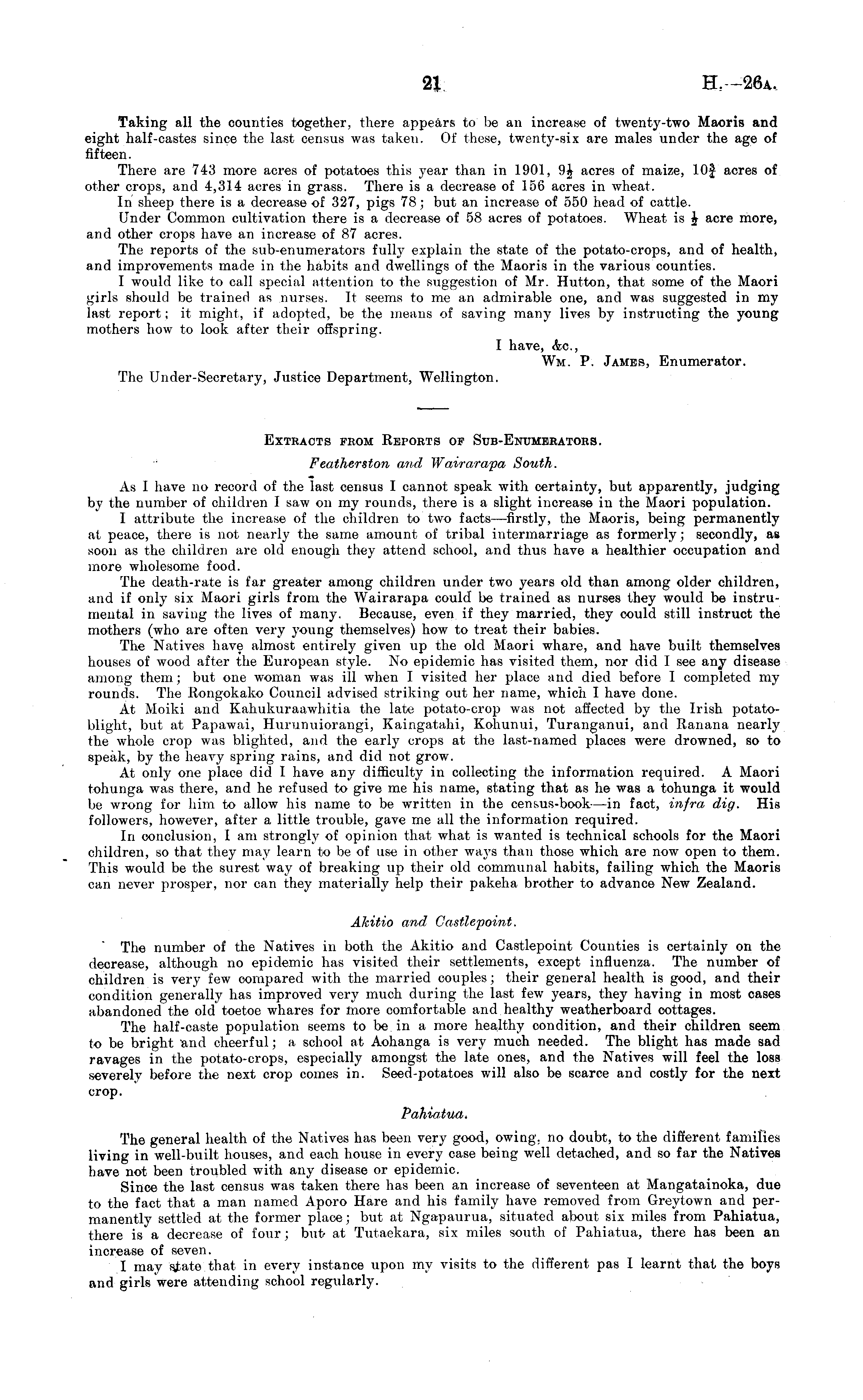 Extracts from Reports of Sub-Enumerators. Featherston and Wairarapa South. As I have no record of the last census I cannot speak with certainty, but apparently, judging by the number of children I saw on my rounds, there is a slight increase in the Maori population. 1 attribute the increase of the children to two facts—firstly, the Maoris, being permanently at peace, there is not nearly the same amount of tribal intermarriage as formerly; secondly, as soon as the children are old enough they attend school, and thus have a healthier occupation and more wholesome food. The death-rate is far greater among children under two years old than among older children, and if only six Maori girls from the Wairarapa could be trained as nurses they would be instrumental in saving the lives of many. Because, even if they married, they could still instruct the mothers (who are often very young themselves) how to treat their babies. The Natives have almost entirely given up the old Maori whare, and have built themselves houses of wood after the European style. No epidemic has visited them, nor did I see any disease among them; but one woman was ill when I visited her place and died before I completed my rounds. The Rougokako Council advised striking out her name, which I have done. At Moiki and Kahukuraawhitia the late potato-crop was not affected by the Irish potatoblight, but at Papawai, Hurunuiorangi, Kaingatahi, Kohunui, Turanganui, and Ranana nearly the whole crop was blighted, and the early crops at the last-named places were drowned, so to speak, by the heavy spring rains, and did not grow. At only one place did I have any difficulty in collecting the information required. A Maori tohunga was there, and he refused to give me his name, stating that as he was a tohunga it would be wrong for him to allow his name to be written in the census-book-—in fact, infra dig. His followers, however, after a little trouble, gave me all the information required. In conclusion, I am strongly of opinion that what is wanted is technical schools for the Maori children, so that they may learn to be of rise in other ways than those which are now open to them. This would be the surest way of breaking up their old communal habits, failing which the Maoris can never prosper, nor can they materially help their pakeha brother to advance New Zealand. Akitio and Castlepoint. The number of the Natives in both the Akitio and Castlepoint Counties is certainly on the decrease, although no epidemic has visited their settlements, except influenza. The number of children is very few compared with the married couples; their general health is good, and their condition generally has improved very much during the last few years, they having in most cases abandoned the old toetoe whares for more comfortable and healthy weatherboard cottages. The half-caste population seems to be in a more healthy condition, and their children seem to be bright and cheerful; a school at Aohanga is very much needed. The blight has made sad ravages in the potato-crops, especially amongst the late ones, and the Natives will feel the loss severely before the next crop comes in. Seed-potatoes will also be scarce and costly for the next crop. Pahiatua. The general health of the Natives has been very good, owing, no doubt, to the different families living in well-built houses, and each house in every case being well detached, and so far the Natives have not been troubled with any disease or epidemic. Since the last census was taken there lias been an increase of seventeen at Mangatainoka, due to the fact that a man named Aporo Hare and his family have removed from Greytown and permanently settled at the former place; but at Ngapaurua, situated about six miles from Pahiatua, there is a decrease of four; but at Tutaekara, six miles south of Pahiatua, there has been an increase of seven. I may sj;ate that in every instance upon my visits to the different pas I learnt that the boys and girls were attending school regularly.