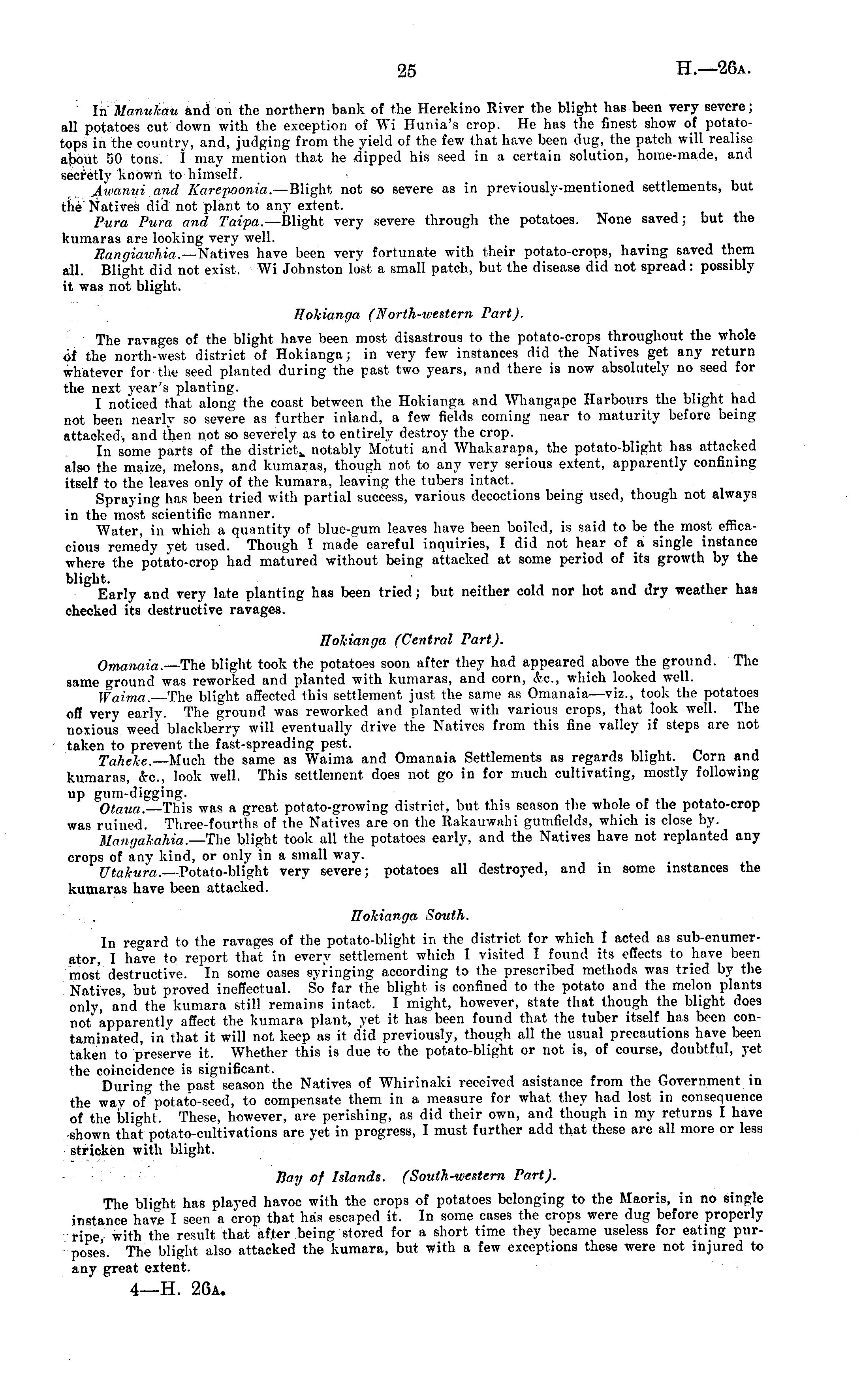 In Manuhau and on the northern bank of the Herekino River the blight has been very severe; all potatoes cut down with the exception of Wi Hunia's crop. He has the finest show of potatotops in the country, and, judging from the yield of the few that have been dug, the patch will realise about 50 tons. I may mention that he dipped his seed in a certain solution, home-made, and secretly known to himself. Awanui and Karepoonia. —Blight not so severe as in previously-mentioned settlements, but the' Natives did not plant to any extent. Pura Pura and Taipa. —Blight very severe through the potatoes. None saved; but the kumaras are looking very well. Eangiawhia. —Natives have been very fortunate with their potato-crops, having saved them all. Blight did not exist. Wi Johnston lost a small patch, but the disease did not spread: possibly it was not blight. Hokianga (North-western Part). The ravages of the blight have been most disastrous to the potato-crops throughout the whole of the north-west district of Hokianga; in very few instances did the Natives get any return whatever for the seed planted during the past two years, and there is now absolutely no seed for the next year's planting. • • I noticed that along the coast between the Hokianga and Whangape Harbours the blight had not been nearly so severe as further inland, a few fields coining near to maturity before being attacked, and then not so severely as to entirely destroy the crop. In some parts of the district,, notably Motuti and Whakarapa, the potato-blight has attacked also the maize, melons, and kumaras, though not to any very serious extent, apparently confining itself to the leaves only of the kumara, leaving the tubers intact. Spraying has been tried with partial success, various decoctions being used, though not always in the most scientific manner. Water, in which a quantity of blue-gum leaves have been boiled, is said to be the most efficacious remedy yet used. Though I made careful inquiries, I did not hear of a single instance where the potato-crop had matured without being attacked at some period of its growth by the blight. Early and very late planting has been tried; but neither cold nor hot and dry weather has checked its destructive ravages. Tloldanga (Central Part). Omanaia.— The blight took the potatoes soon after they had appeared above the ground. The same ground was reworked and planted with kumaras, and corn, <fee, which looked well. Waima. —The blight affected this settlement just the same as Omanaia—viz., took the potatoes off very early. The ground was reworked and planted with various crops, that look well. The noxious weed blackberry will eventually drive the Natives from this fine valley if steps are not taken to prevent the fast-spreading pest. Tahelce. —Much the same as Waima and Omanaia Settlements as regards blight. Corn and kumaras, dtc, look well. This settlement does not go in for much cultivating, mostly following up gum-digging. Otaua.—This was a great potato-growing district, but this season the whole of the potato-crop was ruined. Three-fourths of the Natives are on the Rakauwahi gumfields, which is close by. Mangakahia. —The blight took all the potatoes early, and the Natives have not replanted any crops of any kind, or only in a small way. UtaJcura. —Potato-blight very severe; potatoes all destroyed, and in some instances the kumaras have been attacked. Ilohianga South. In regard to the ravages of the potato-blight in the district for which I acted as sub-enumer-ator, I have to report that in every settlement which I visited I found its effects to have been most destructive. In some cases syringing according to the prescribed methods was tried by the Natives, but proved ineffectual. So far the blight is confined to the potato and the melon plants only, and the kumara still remains intact. I might, however, state that though the blight does not apparently affect the kumara plant, yet it has been found that the tuber itself has been contaminated, in that it will not keep as it did previously, though all the usual precautions have been taken to preserve it. Whether this is due to the potato-blight or not is, of course, doubtful, yet the coincidence is significant. During the past season the Natives of Whirinaki received asistance from the Government in the way of potato-seed, to compensate them in a measure for what they had lost in consequence of the blight. These, however, are perishing, as did their own, and though in my returns I have •shown that potato-cultivations are yet in progress, I must further add that these are all more or less stricken with blight. Bay of Islands. (South-western Part). The blight has played havoc with the crops of potatoes belonging to the Maoris, in no single instance have I seen a crop that has escaped it. In some cases the crops were dug before properly ripe, with the result that after being stored for a short time they became useless for eating purposes. The blight also attacked the kumara, but with a few exceptions these were not injured to any great extent.