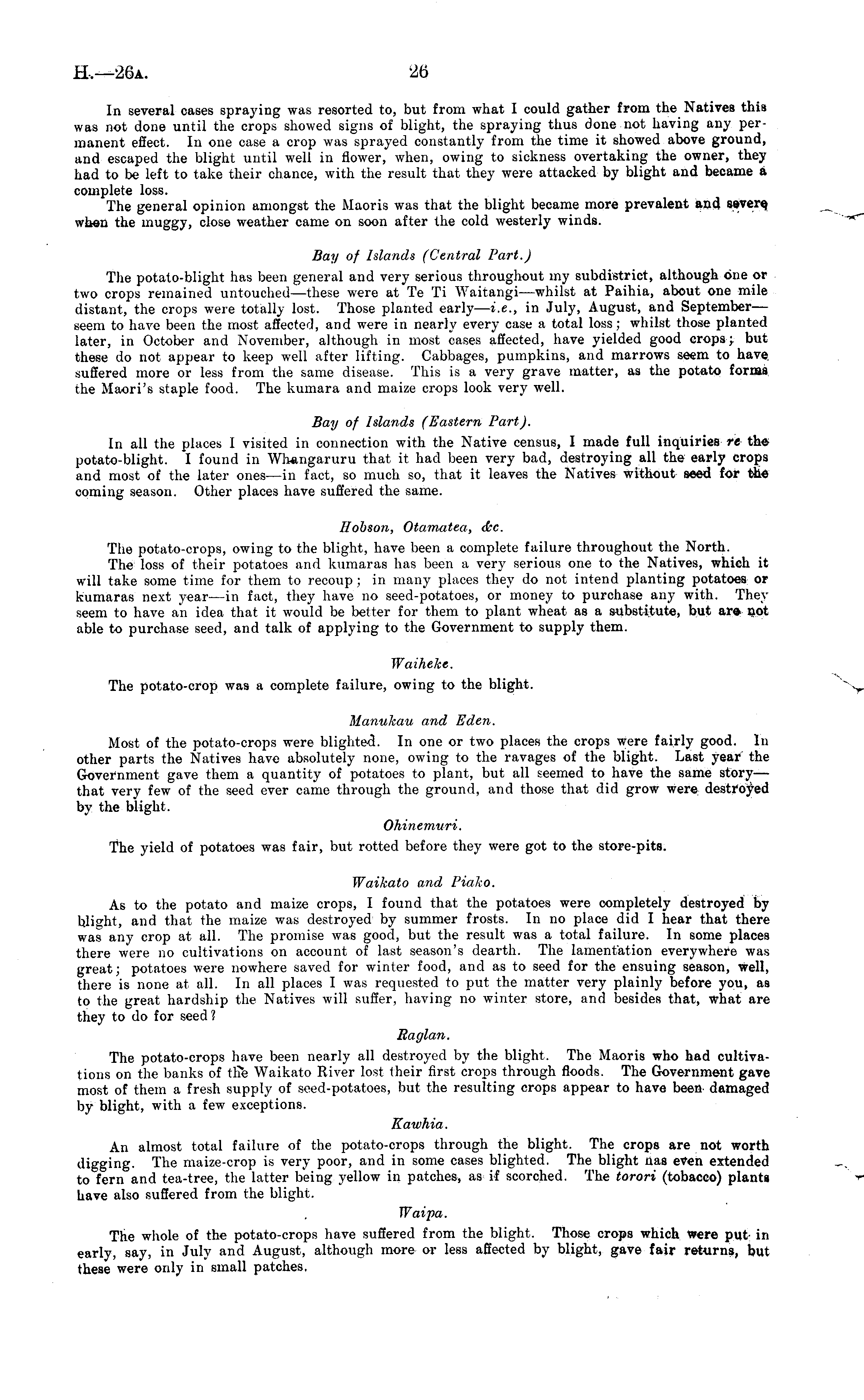 In several cases spraying was resorted to, but from what I could gather from the Natives this was not done until the crops showed signs of blight, the spraying thus done not having any permanent effect. In one case a crop was sprayed constantly from the time it showed above ground, and escaped the blight until well in flower, when, owing to sickness overtaking the owner, they had to be left to take their chance, with the result that they were attacked by blight and became a complete loss. The general opinion amongst the Maoris was that the blight became more prevalent and severe when the muggy, close weather came on soon after the cold westerly winds. Bay of Islands (Central Part.) The potato-blight has been general and very serious throughout my subdistrict, although one or two crops remained untouched —these were at Te Ti Waitangi—whilst at Paihia, about one mile distant, the crops were totally lost. Those planted early— i.e., in July, August, and September— seem to have been the most affected, and were in nearly every case a total loss; whilst those planted later, in October and November, although in most cases affected, have yielded good crops; but these do not appear to keep well after lifting. Cabbages, pumpkins, and marrows seem to have suffered more or less from the same disease. This is a very grave matter, as the potato forms the Maori's staple food. The kumara and maize crops look very well. Bay of Islands (Eastern Part). In all the places I visited in connection with the Native census, I made full inquiries re the potato-blight. I found in Wh*ngaruru that it had been very bad, destroying all the early crops and most of the later ones—in fact, so much so, that it leaves the Natives without seed for the coming season. Other places have suffered the same. Hobson, Otamatea, <kc. The potato-crops, owing to the blight, have been a complete failure throughout the North. The loss of their potatoes and kumaras has been a very serious one to the Natives, which it will take some time for them to recoup; in many places they do not intend planting potatoes or kumaras next year—in fact, they have no seed-potatoes, or money to purchase any with. They seem to have an idea that it would be better for them to plant wheat as a substitute, but are not able to purchase seed, and talk of applying to the Government to supply them. Waiheke. The potato-crop was a complete failure, owing to the blight. Manuhau and Eden. Most of the potato-crops were blighte-d. In one or two places the crops were fairly good. In other parts the Natives have absolutely none, owing to the ravages of the blight. Last year the Government gave them a quantity of potatoes to plant, but all seemed to have the same story — that very few of the seed ever came through the ground, and those that did grow were destroyed by the blight. Ohinemuri. The yield of potatoes was fair, but rotted before they were got to the store-pits. Waikato and Piako. As to the potato and maize crops, I found that the potatoes were completely destroyed by blight, and that the maize was destroyed by summer frosts. In no place did I hear that there was any crop at all. The promise was good, but the result was a total failure. In some places there were no cultivations on account of last season's dearth. The lamentation everywhere was great; potatoes were nowhere saved for winter food, and as to seed for the ensuing season, well, there is none at all. In all places I was requested to put the matter very plainly before you, as to the great hardship the Natives will suffer, having no winter store, and besides that, what are they to do for seed? Raglan. The potato-crops have been nearly all destroyed by the blight. The Maoris who had cultivations on the banks of tK"e Waikato River lost their first crops through floods. The Government gave most of them a fresh supply of seed-potatoes, but the resulting crops appear to have been damaged by blight, with a few exceptions. Kawhia. An almost total failure of the potato-crops through the blight. The crops are not worth digging. The maize-crop is very poor, and in some cases blighted. The blight nas even extended to fern and tea-tree, the latter being yellow in patches, as if scorched. The torori (tobacco) plants have also suffered from the blight. Waipa. The whole of the potato-crops have suffered from the blight. Those crops which were put in early, say, in July and August, although more or less affected by blight, gave fair returns, but these were only in small patches.