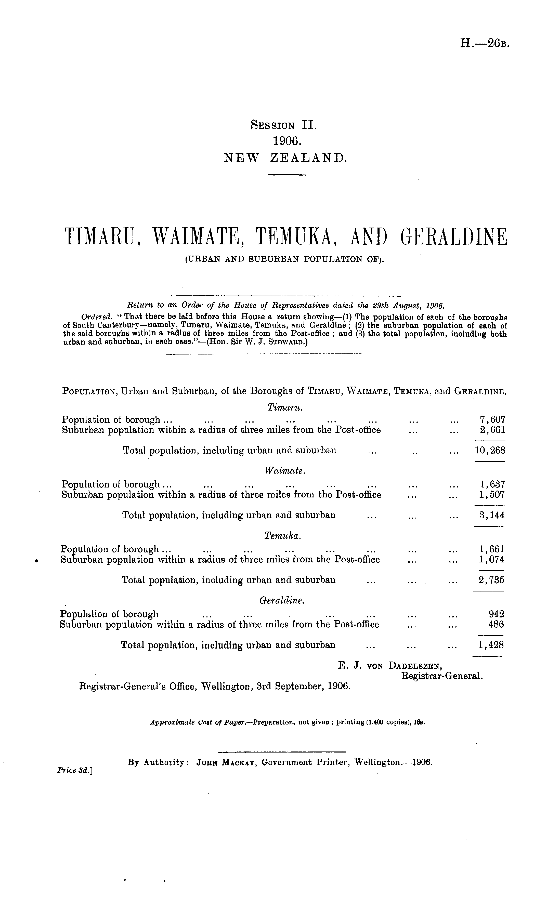 Return to an Order of the House of Representatives dated the H9th August, 1906. Ordered, " That there be laid before this House a return showing—(l) The population of each of the boroughs of South Canterbury—namely, Timaru, Waimate, Temuka, and Geraldine ; (2) the suburban population of each of the said boroughs within a radius of three miles from the Post-office ; and (3) the total population, inoluding both urban and suburban, in eaoh case."—(Hon. Sir W. J. Stewabd.)