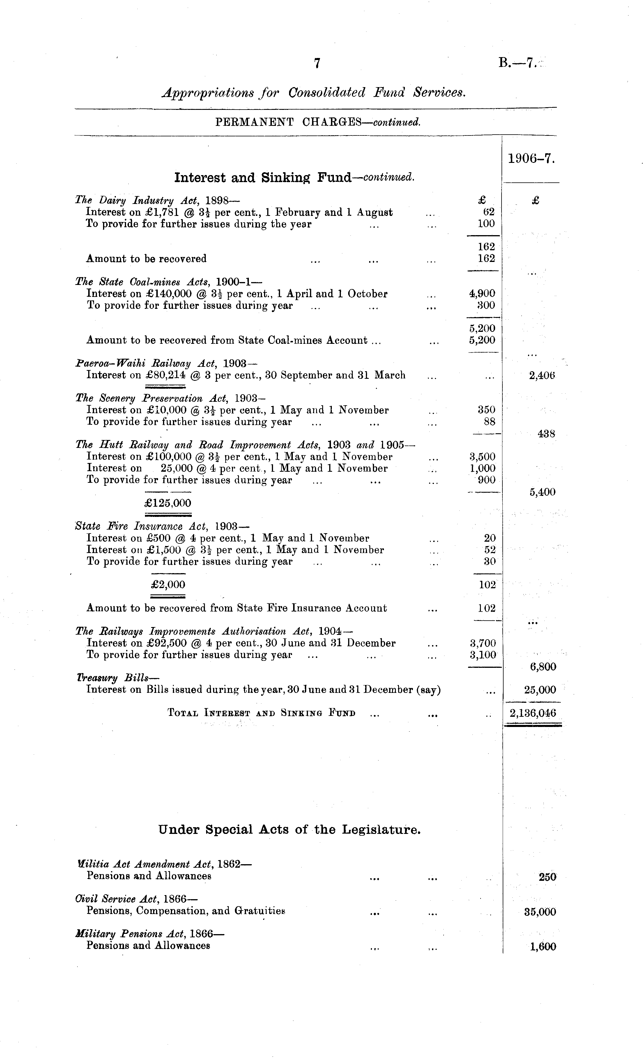 1906-7. Interest and Sinking Fund— continued. The Dairy Industry Act, 1898 —- Interest on £1,781 @ 34 per cent., 1 February and 1 August To provide for further issues during the year £ 62 100 £ Amount to be recovered 162 162 The State Coal-mines Acts, 1900-1— Interest on £140,000 @ 3| per cent., 1 April and 1 October To provide for further issues during year 4,900 300 Amount to be recovered from State Coal-mines Account ... 5,200 5,200 Paeroa-Waihi Railway Act, 1903— Interest on £80,214 @ 3 per cent., 30 September and 31 March 2,406 The Scenery Preservation Act, 1903— Interest on £10,000 @ 3|- per cent., 1 May and 1 November To provide for further issues during year 350 88 438 The Hutt Railway and Road Improvement Acts, 1903 and 1905 — Interest on £100,000 @ 3f per cent., 1 May and 1 November Interest on 25,000 @ 4 per cent, 1 May and 1 November To provide for further issues during year 3,500 1,000 900 5,400 £125,000 State Fire Insurance Act, 1903— Interest on £500 @ 4 per cent., 1 May and 1 November Interest on £1,500 @ 3| per cent., 1 May and 1 November To provide for further issues during year 20 52 30 £2,000 102 Amount to be recovered from State Fire Insurance Account 102 The Railways Improvements Authorisation Act, 1904— Interest on £92,500 @ 4 per cent., 30 June and 31 December To provide for further issues during year ... ... 3,700 3,100 6,800 Treasury Bills — Interest on Bills issued during the year, 30 June and 31 December (say) 25,000 Total Intebest and Sinking Fund 2,136,046 Under Special Acts of the Legislature. Wilitia Act Amendment Act, 1862— Pensions and Allowances 250 Civil Service Act, 1866— Pensions, Compensation, and Gratuities ... 35,000 Military Pensions Act, 1866 — Pensions and Allowances