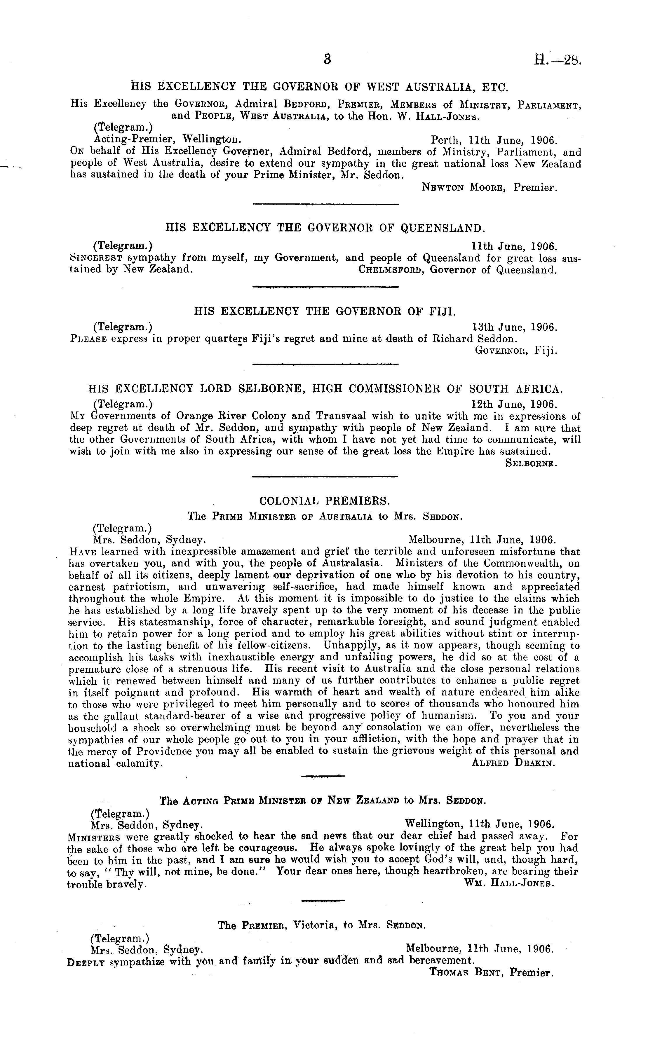 HIS EXCELLENCY THE GOVERNOR OF WEST AUSTRALIA, ETC. His Excellency the Governor, Admiral Bedford, Premier, Members of Ministry, Parliament, and People, West Australia, to the Hon. W. Hall-Jones. (Telegram.) Acting-Premier, Wellington. Perth, 11th June, 1906. On behalf of His Excellency Governor, Admiral Bedford, members of Ministry, Parliament, and people of West Australia, desire to extend our sympathy in the great national loss New Zealand has sustained in the death of your Prime Minister, Mr. Seddon. Newton Moore, Premier. HIS EXCELLENCY THE GOVERNOR OF QUEENSLAND. (Telegram.) 11th June, 1906. Sincerest sympathy from myself, my Government, and people of Queensland for great loss sustained by New Zealand. Chelmsford, Governor of Queensland. HIS EXCELLENCY THE GOVERNOR OF FIJI. (Telegram.) 13th June, 1906. Please express in proper quarters Fiji's regret and mine at death of Richard Seddon. Governor, Fiji. HIS EXCELLENCY LORD SELBORNE, HIGH COMMISSIONER OF SOUTH AFRICA. (Telegram.) 12th June, 1906. i\ly Governments of Orange River Colony and Transvaal wish to unite with me in expressions of deep regret at death of Mr. Seddon, and sympathy with people of New Zealand. lam sure that the other Governments of South Africa, with whom I have not yet had time to communicate, will wish to join with me also in expressing our sense of the great loss the Empire has sustained. Selborne . COLONIAL PREMIERS. The Prime Minister of Australia to Mrs. Seddon. (Telegram.) Mrs. Seddon, Sydney. Melbourne, 11th June, 1906. Have learned with inexpressible amazement and grief the terrible and unforeseen misfortune that has overtaken you, and with you, the people of Australasia. Ministers of the Commonwealth, on behalf of all its citizens, deeply lament our deprivation of one who by his devotion to his country, earnest patriotism, and unwavering self-sacrifice, had made himself known and appreciated throughout the whole Empire. At this moment it is impossible to do justice to the claims which he has established by a long life bravely spent up to the very moment of his decease in the public service. His statesmanship, force of character, remarkable foresight, and sound judgment enabled him to retain power for a long period and to employ his great abilities without stint or interruption to the lasting benefit of his fellow-citizens. Unhappily, as it now appears, though seeming to accomplish his tasks with inexhaustible energy and unfailing powers, he did so at the cost of a premature close of a strenuous life. His recent visit to Australia and the close personal relations which it renewed between himself and many of us further contributes to enhance a public regret in itself poignant and profound. His warmth of heart and wealth of nature endeared him alike to those who were privileged to meet him personally and to scores of thousands who honoured him as the gallant standard-bearer of a wise and progressive policy of humanism. To you and your household a shock so overwhelming must be beyond any' consolation we can offer, nevertheless the sympathies of our whole people go out to you in your affliction, with the hope and prayer that in the mercy of Providence you may all be enabled to sustain the grievous weight of this personal and national calamity. Alfred Deakin. The Acting Prime Minister of New Zealand to Mrs. Seddon. (Telegram.) Mrs. Seddon, Sydney. Wellington, 11th June, 1906. Ministers were greatly shocked to hear the sad news that our dear chief had passed away. For the sake of those who are left be courageous. He always spoke lovingly of the great help you had been to him in the past, and I am sure he would wish you to accept God's will, and, though hard, to say, " Thy will, not mine, be done." Your dear ones here, though heartbroken, are bearing their trouble bravely. Wm. Hall-Jones. The Premier, Victoria, to Mrs. Seddon. (Telegram.) Mrs. Seddon, Sydney. Melbourne, 11th June, 1906. Deeply sympathize with you and family in your sudden and sad bereavement. Thomas Bent, Premier.