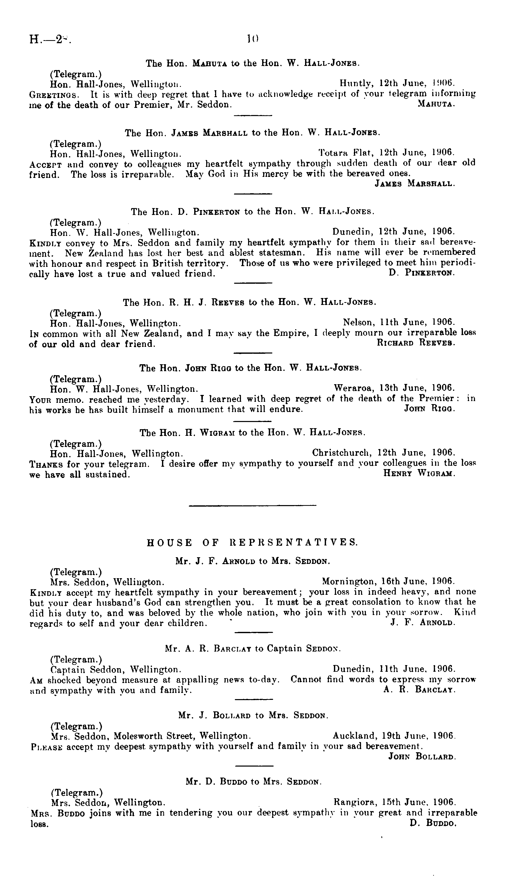 HOUSE OF REPRSENTATIVES. Mr. J. F. Arnold to Mrs. Seddon. (Telegram.) Mrs. Seddon, Wellington. Mornington, 16th June, 1906. Kindly accept my heartfelt sympathy in your bereavement; your loss in indeed heavy, and none but your dear husband's God can strengthen you. It must be a great consolation to know that he did his duty to, and was beloved by the whole nation, who join with you in your sorrow. Kind regards to self and your dear children. J. F. Arnold. Mr. A. R. Barclay to Captain Seddon. (Telegram.) Captain Seddon, Wellington. Dunedin, 11th June. 1906. Am shocked beyond measure at appalling news to-day. Cannot find words to express my sorrow and sympathy with you and family. A. R. Barclay. Mr. J. Bollard to Mrs. Seddon. (Telegram.) Mrs. Seddon, Molesworth Street, Wellington. Auckland, 19th June, 1906. Please accept my deepest sympathy with yourself and family in your sad bereavement. John Bollard. Mr. D. Buddo to Mrs. Seddon. (Telegram.) Mrs. Seddon, Wellington. Rangiora, 15th June, 1906. Mrs. Buddo joins with me in tendering you our deepest sympathy in your great and irreparable loss. D. Buddo,