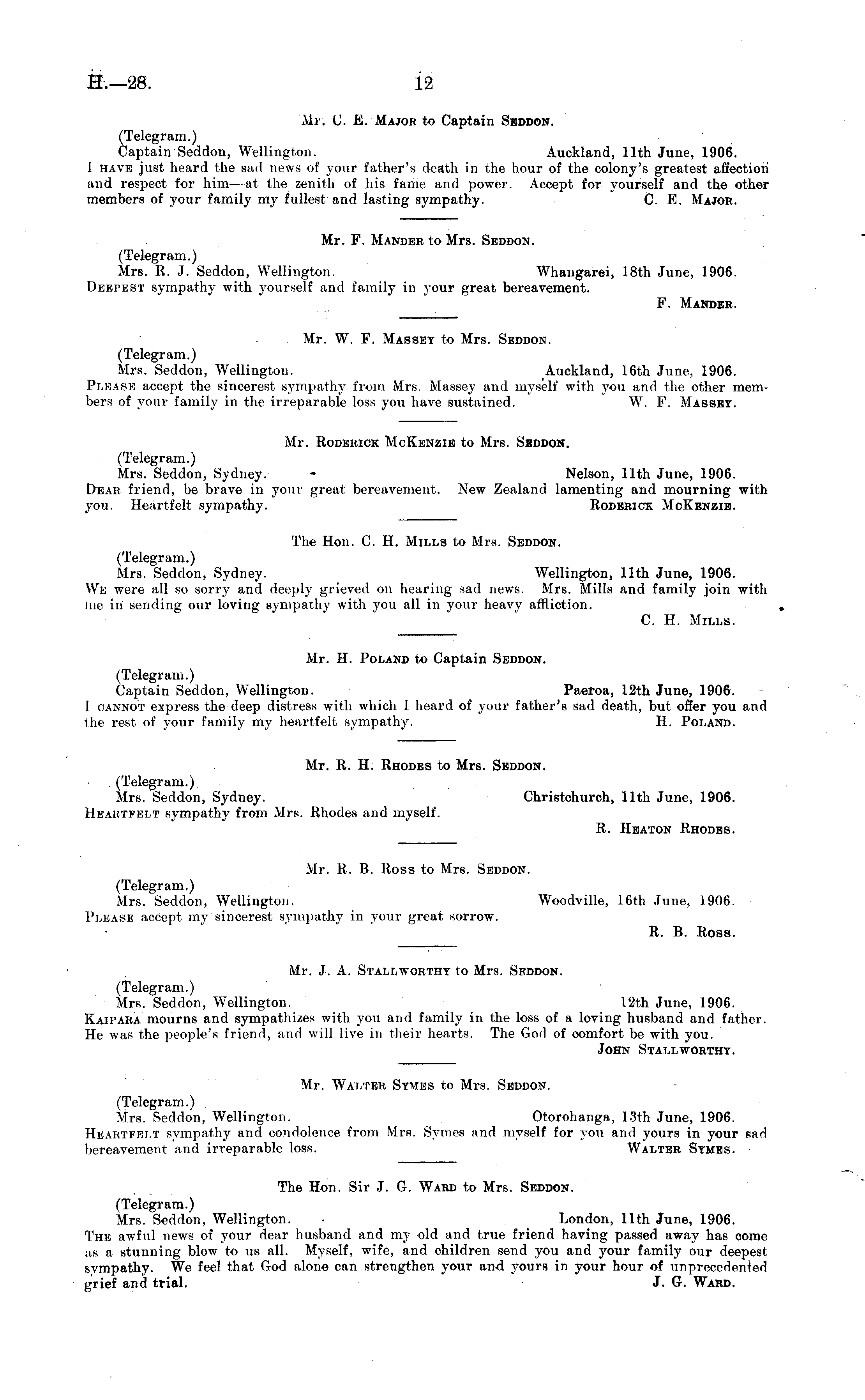 Mr. C. E. Major to Captain Seddon. (Telegram.) Captain Seddon, Wellington. Auckland, 11th June, 1906. 1 have just heard the sad news of your father's death in the hour of the colony's greatest affection and respect for him—at the zenith of his fame and power. Accept for yourself and the other members of your family my fullest and lasting sympathy. C. E. .Major. Mr. F. Mander to Mrs. Seddon. (Telegram.) 4Mrs. R. J. Seddon, Wellington. Whangarei, 18th June, 1906. Deepest sympathy with yourself and family in your great bereavement. F. Mander. v Mr. W. F. .Massey to Mrs. Seddon. (Telegram.) Mrs. Seddon, Wellington. Auckland, 16th June, 1906. Please accept the sincerest sympathy from Mrs. Massey and myself with you and the other members of your family in the irreparable loss you have sustained. W. F. Massey. Mr. Roderick McKenzie to Mrs. Seddon. (Telegram.) Mrs. Seddon, Sydney. - Nelson, 11th June, 1906. Dear friend, be brave in your great bereavement. New Zealand lamenting and mourning with you. Heartfelt sympathy. Roderick McKenzie. The Hon. C. H. Mills to Mrs. Seddon. (Telegram.) Mrs. Seddon, Sydney. Wellington, 11th June, 1906. We were all so sorry and deeply grieved on hearing sad news. Mrs. Mills and family join with me in Sending our loving sympathy with you all in your heavy affliction. C. H. Mills. Mr. H. Poland to Captain Seddon. (Telegram.) Captain Seddon, Wellington. Paeroa, 12th June, 1906. 1 cannot express the deep distress with which I heard of your father's sad death, but offer you and the rest of your family my heartfelt sympathy. H. Poland. Mr. R. H. Rhodes to Mrs. Seddon. (Telegram.) Mrs. Seddon, Sydney. Christchurch, 11th June, 1906. Heartfelt sympathy from Mrs. Rhodes and myself. R. Heaton Rhodes. Mr. R. B. Ross to Mrs. Seddon. (Telegram.) Mrs. Seddon, Wellington. Woodville, 16th June, 1906. Please accept my sincerest sympathy in your great sorrow. R. B. Ross. Mr. J. A. Stallworthy to Mrs. Seddon. (Telegram.) Mrs. Seddon, Wellington. 12th June, 1906. Kaipara mourns and sympathizes with you and family in the loss of a loving husband and father. He was the people's friend, and will live in their hearts. The God of comfort be with you. John Stallworthy. Mr. Walter Symes to Mrs. Seddon. (Telegram.) Mrs. Seddon, Wellington. Otorohanga, 13th June, 1906. Heartfelt sympathy and condolence from Mrs. Symes and myself for you and yours in your sad bereavement and irreparable loss. Walter Symes. The Hon. Sir J. G. Ward to Mrs. Seddon. (Telegram.) Mrs. Seddon, Wellington. ■ London, 11th June, 1906. The awful news of your dear husband and my old and true friend having passed away has come as a stunning blow to us all. Myself, wife, and children send you and your family our deepest sympathy. We feel that God alone can strengthen your and yours in your hour of unprecedented grief and trial. J. G. Ward.