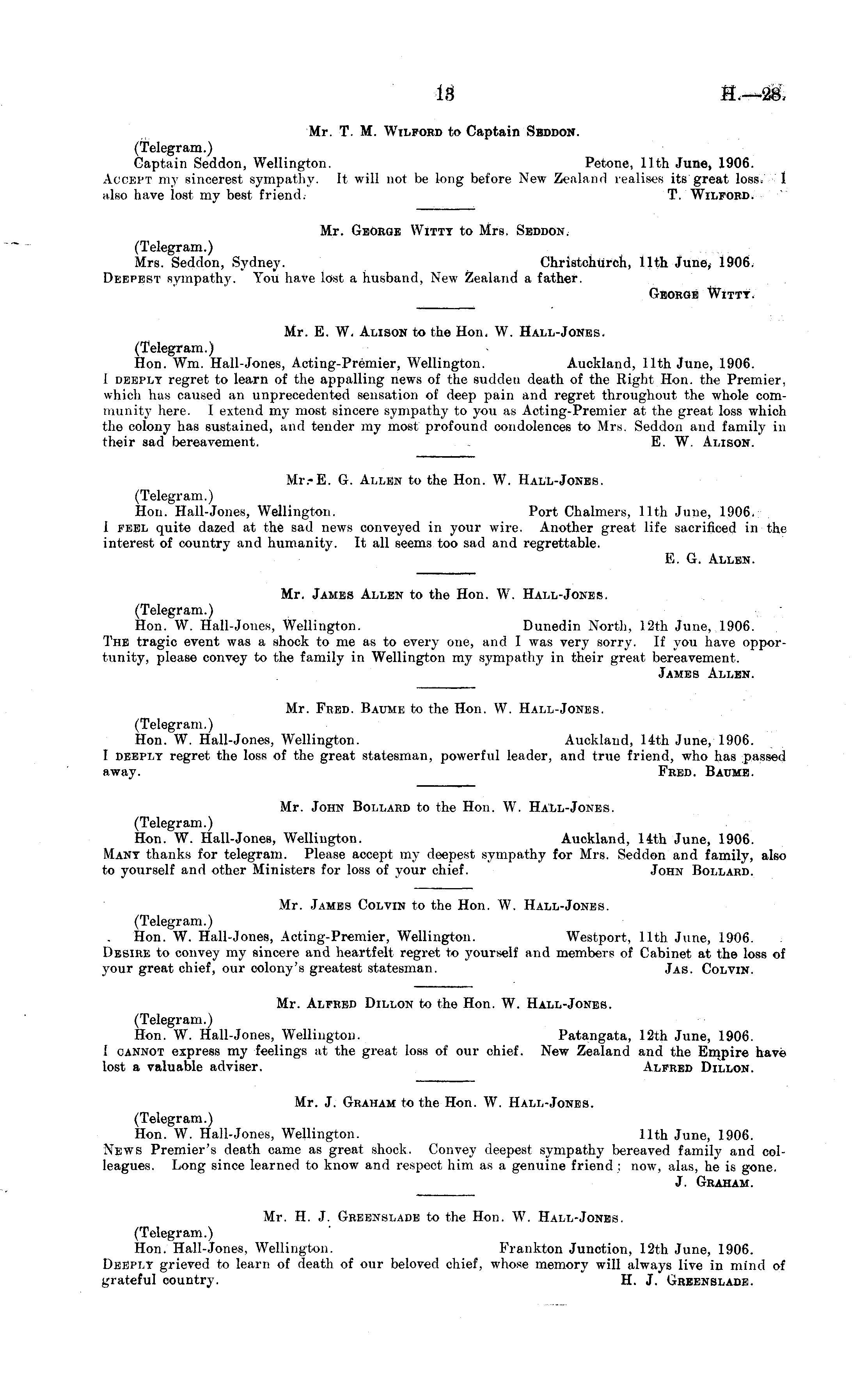 Mr. T. M. Wilford to Captain Seddon. (Telegram.) Captain Seddon, Wellington. Petone, 11th June, 1906. Accept my sincerest sympathy. It will not be long before New Zealand realises its great loss. 1 also have lost my best friend. T. Wilford. Mr. George Witty to Mrs. Seddon. (Telegram.) Mrs. Seddon, Sydney. Christchurch, 11th June, 1906. Deepest sympathy. You have lost a husband, New Zealand a father. George Wittt. Mr. E. W. Alison to the Hon. W. Hall-Jones. (Telegram.) Hon. Wm. Hall-Jones, Acting-Premier, Wellington. Auckland, 11th June, 1906. I deeply regret to learn of the appalling news of the sudden death of the Right Hon. the Premier, which has caused an unprecedented sensation of deep pain and regret throughout the whole community here. I extend my most sincere sympathy to you as Acting-Premier at the great loss which the colony has sustained, and tender my most profound condolences to Mrs. Seddon and family in their sad bereavement. E. W. Alison. Mr.-E. G Allen to the Hon. W. Hall-Jones. (Telegram.) Hon. Hall-Jones, Wellington. Port Chalmers, 11th June, 1906. I feel quite dazed at the sad news conveyed in your wire. Another great life sacrificed in the interest of country and humanity. It all seems too sad and regrettable. E. G. Allen. Mr. James Allen to the Hon. W. Hall-Jones. (Telegram.) Hon. W. Hall-Jones, Wellington. Dunedin North, 12th June, 1906. The tragic event was a shock to me as to every one, and I was very sorry. If you have opportunity, please convey to the family in Wellington my sympathy in their great bereavement. James Allen. Mr. Fred. Baume to the Hon. W. Hall-Jones. (Telegram.) Hon. W. Hall-Jones, Wellington. Auckland, 14th June, 1906. I deeply regret the loss of the great statesman, powerful leader, and true friend, who has passed away. Fred. Baume. Mr. John Bollard to the Hon. W. Hall-Jones. (Telegram.) Hon. W. Hall-Jones, Wellington. Auckland, 14th June, 1906. Many thanks for telegram. Please accept my deepest sympathy for Mrs. Seddon and family, also to yourself and other Ministers for loss of your chief. John Bollard. Mr. James Colvin to the Hon. W. Hall-Jones. (Telegram.) Hon. W. Hall-Jones, Acting-Premier, Wellington. Westport, 11th June, 1906. Desire to convey my sincere and heartfelt regret to yourself and members of Cabinet at the loss of your great chief, our colony's greatest statesman. Jas. Colvin. Mr. Alfred Dillon to the Hon. W. Hall-Jones. (Telegram.) Hon. W. Hall-Jones, Wellington. Patangata, 12th June, 1906. 1 cannot express my feelings at the great loss of our chief. New Zealand and the Empire have lost a valuable adviser. Alfred Dillon. Mr. J. Graham to the Hon. W. Hall-Jones. (Telegram.) Hon. W. Hall-Jones, Wellington. 11th June, 1906. News Premier's death came as great shock. Convey deepest sympathy bereaved family and colleagues. Long since learned to know and respect him as a genuine friend : now. alas, he is gone. J. Gr__ham. Mr. H. J. Greenslade to the Hon. W. Hall-Jones. (Telegram.) Hon. Hall-Jones, Wellington. Frankton Junction, 12th June, 1906. Deeply grieved to learn of death of our beloved chief, whose memory will always live in mind of grateful country. H. J. Greenslade.