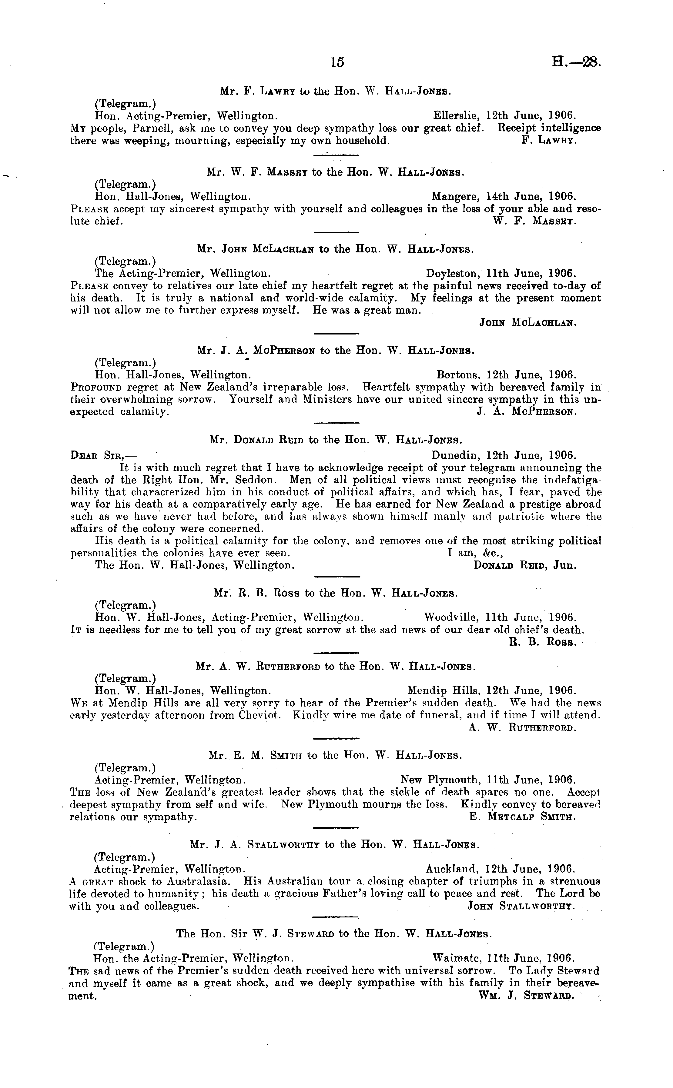 Mr. F. Lawry to the Hon. W. Hall-Jones. (Telegram.) Hon. Acting-Premier, Wellington. Ellerslie, 12th June, 1906. .My people, Parnell, ask me to convey you deep sympathy loss our great chief. Receipt intelligence there was weeping, mourning, especially my own household. F. Lawry. Mr. W. F. Massey to the Hon. W. Hall-Jones. (Telegram.) Hon. Hall-Jones, Wellington. Mangere, 14th June, 1906. Please accept my sincerest sympathy with yourself and colleagues in the loss of your able and resolute chief. W. F. Massey. Mr. John McLachlan to the Hon. W. Hall-Jones. (Telegram.) The Acting-Premier, Wellington. Doyleston, 11th June, 1906. Please convey to relatives our late chief my heartfelt regret at the painful news received to-day of his death. It is truly a national and world-wide calamity. My feelings at the present moment will not allow me to further express myself. He was a great man. John McLachlan. Mr. J. A. McPherson to the Hon. W. Hall-Jones. (Telegram.) Hon. Hall-Jones, Wellington. Bortons, 12th June, 1906. Profound regret at New Zealand's irreparable loss. Heartfelt sympathy with bereaved family in their overwhelming sorrow. Yourself and Ministers have our united sincere sympathy in this unexpected calamity. J. A. McPherson. Mr. Donald Reid to the Hon. W. Hall-Jones. Dear Sir, — Dunedin, 12th June, 1906. It is with much regret that I have to acknowledge receipt of your telegram announcing the death of the Right Hon. Mr. Seddon. Men of all political views must recognise the indefatigability that characterized him in his conduct of political affairs, and which has, I fear, paved the way for his death at a comparatively early age. He has earned for New Zealand a prestige abroad such as we have never had before, and has always shown himself manly and patriotic where the affairs of the colony were concerned. His death is a political calamity for the colony, and removes one of the most striking political personalities the colonies have ever seen. I am, &c, The Hon. W. Hall-Jones, Wellington. Donald Reid, Jun. Mr. R. B. Ross to the Hon. W. Hall-Jones. (Telegram.) Hon. W. Hall-Jones, Acting-Premier, Wellington. Woodville, 11th June, 1906. It is needless for me to tell you of my great sorrow at the sad news of our dear old chief's death. R. B. Ross. Mr. A. W. Rutherford to the Hon. W. Hall-Jones. (Telegram.) Hon. W. Hall-Jones, Wellington. Mendip Hills, 12th June, 1906. We at Mendip Hills are all very sorry to hear of the Premier's sudden death. We had the news early yesterday afternoon from Cheviot. Kindly wire me date of funeral, and if time I will attend. A. W. Rutherford. Mr. E. M. Smith to the Hon. W. Hall-Jones. (Telegram.) Acting-Premier, Wellington. New Plymouth, 11th June, 1906. The loss of New Zealand's greatest leader shows that the sickle of death spares no one. Accept deepest sympathy from self and wife. New Plymouth mourns the loss. Kindly convey to bereaved relations our sympathy. E. Metcalf Smith. Mr. J. A. Stallworthy to the Hon. W. Hall-Jones. (Telegram.) Acting-Premier, Wellington. Auckland, 12th June, 1906. A great shock to Australasia. His Australian tour a closing chapter of triumphs in a strenuous life devoted to humanity ; his death a gracious Fiither's loving call to peace and rest. The Lord be with you and colleagues. John Stallworthy. The Hon. Sir W. J. Steward to the Hon. W. Hall-Jones. ("Telegram.) Hon. the Acting-Premier, Wellington. Waimate, 11th June, 1906. The sad news of the Premier's sudden death received here with universal sorrow. To Lady Steward and myself it came as a great shock, and we deeply sympathise with his family in their bereavement, Wm. J, Steward.