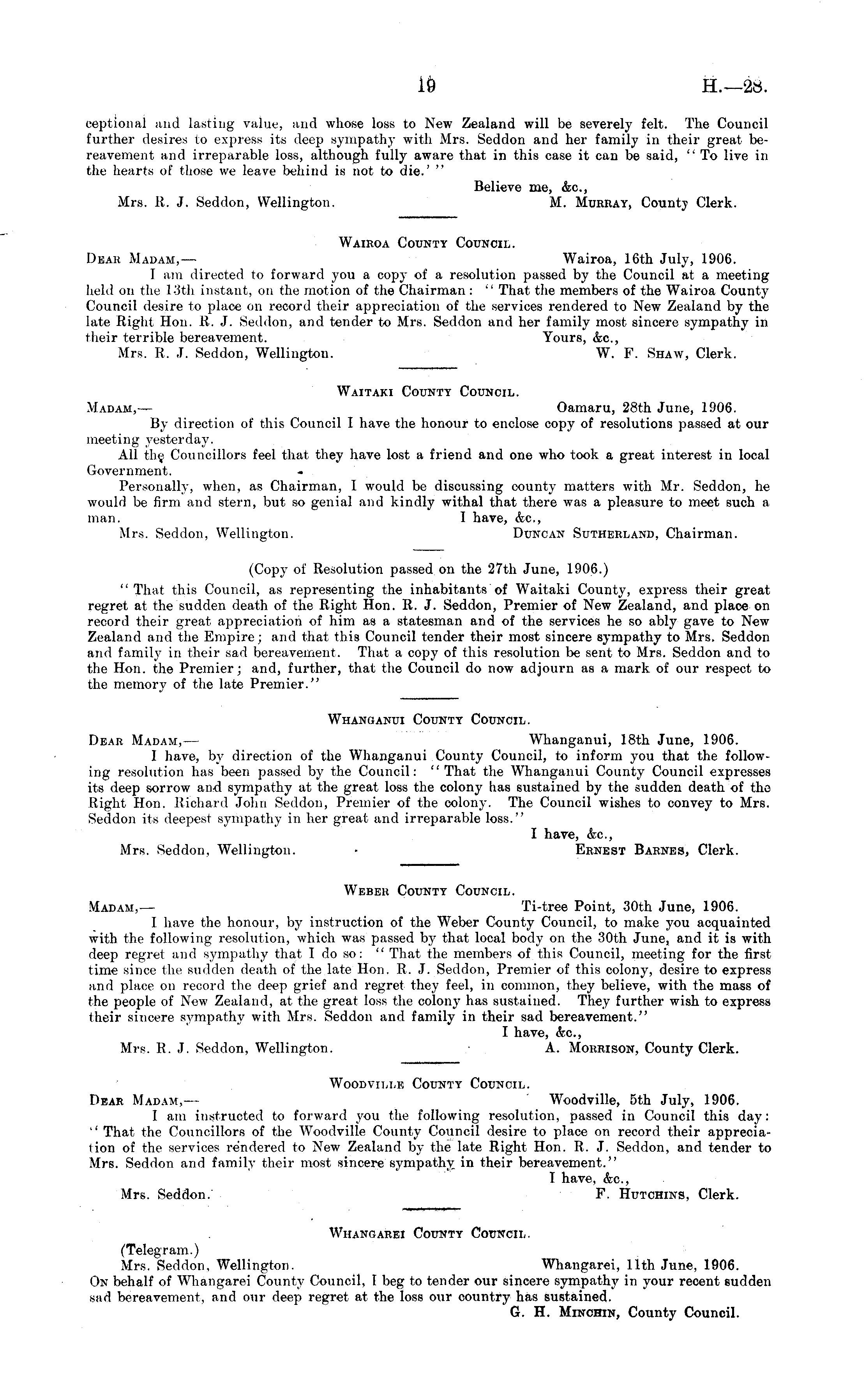 eeptlonal and lasting value, and whose loss to New Zealand will be severely felt. The Council further desires to express its deep sympathy with Mrs. Seddon and her family in their great bereavement and irreparable loss, although fully aware that in this case it can be said, " To live in the hearts of those we leave behind is not to die.' " Believe me, &c, Mrs. R. J. Seddon, Wellington. M. Murray, County Clerk. Wairoa County Council. Dear Madam, — Wairoa, 16th July, 1906. I am directed to forward you a copy of a resolution passed by the Council at a meeting held on the 13th instant, on the motion of the Chairman : " That the members of the Wairoa County Council desire to place on record their appreciation of the services rendered to New Zealand by the late Right Hon. R. J. Seddon, and tender to Mrs. Seddon and her family most sincere sympathy in their terrible bereavement. Yours, &c, Mrs. R. J. Seddon, Wellington. W. F. Shaw, Clerk. Waitaki County Council. Madam, — Oamaru, 28th June, 1906. By direction of this Council I have the honour to enclose copy of resolutions passed at our meeting yesterday. All th§ Councillors feel that they have lost a friend and one who took a great interest in local Government. Personally, when, as Chairman, I would be discussing county matters with Mr. Seddon, he would be firm and stern, but so genial and kindly withal that there was a pleasure to meet such a man. I have, &c, Mrs. Seddon, Wellington. Duncan Sutherland, Chairman. (Copy of Resolution passed on the 27th June, 1906.) " That this Council, as representing the inhabitants of Waitaki County, express their great regret at the sudden death of the Right Hon. R. J. Seddon, Premier of New Zealand, and place on record their great appreciation of him as a statesman and of the services he so ably gave to New Zealand and the Empire; and that this Council tender their most sincere sympathy to Mrs. Seddon and family in their sad bereavement. That a copy of this resolution be sent to Mrs. Seddon and to the Hon. the Premier; and, further, that the Council do now adjourn as a mark of our respect to the memory of the late Premier." Whanganui County Council. Dear Madam, — Whanganui, 18th June, 1906. I have, by direction of the Whanganui County Council, to inform you that the following resolution has been passed by the Council: "That the Whanganui County Council expresses its deep sorrow and sympathy at the great loss the colony has sustained by the sudden death of the Right Hon. Richard John Seddon, Premier of the colony. The Council wishes to convey to Mrs. Seddon its deepest sympathy in her great and irreparable loss." I have, <fee, 4 Mrs. Seddon, Wellington. • Ernest Barnes, Clerk. Weber County Council. Madam,— Ti-tree Point, 30th June, 1906. I have the honour, by instruction of the Weber County Council, to make you acquainted with the following resolution, which was passed by that local body on the 30th June, and it is with deep regret and sympathy that Ido so: " That the members of this Council, meeting for the first time since the sudden death of the late Hon. R. J. Seddon, Premier of this colony, desire to express and place on record the deep grief and regret they feel, in common, they believe, with the mass of the people of New Zealand, at the great loss the colony has sustained. They further wish to express their sincere sympathy with Mrs. Seddon and family in their sad bereavement." I have, &c, Mrs. R. J. Seddon, Wellington. A. Morrison, County Clerk. Woodville County Council. Dear Madam,— Woodville, sth July, 1906. I am instructed to forward you the following resolution, passed in Council this day: " That the Councillors of the Woodville County Council desire to place on record their appreciation of the services rendered to New Zealand by the late Right Hon. R. J. Seddon, and tender to Mrs. Seddon and family their most sincere sympathy in their bereavement." I have, &c, Mrs. Seddon. F. Hutchins, Clerk. Whangarei County Council. (Telegram.) Mrs. Seddon, Wellington. Whangarei, 11th June, 1906. On behalf of Whangarei County Council, I beg to tender our sincere sympathy in your recent sudden sad bereavement, and our deep regret at the loss our country has sustained. G. H. Minchin, County Council.