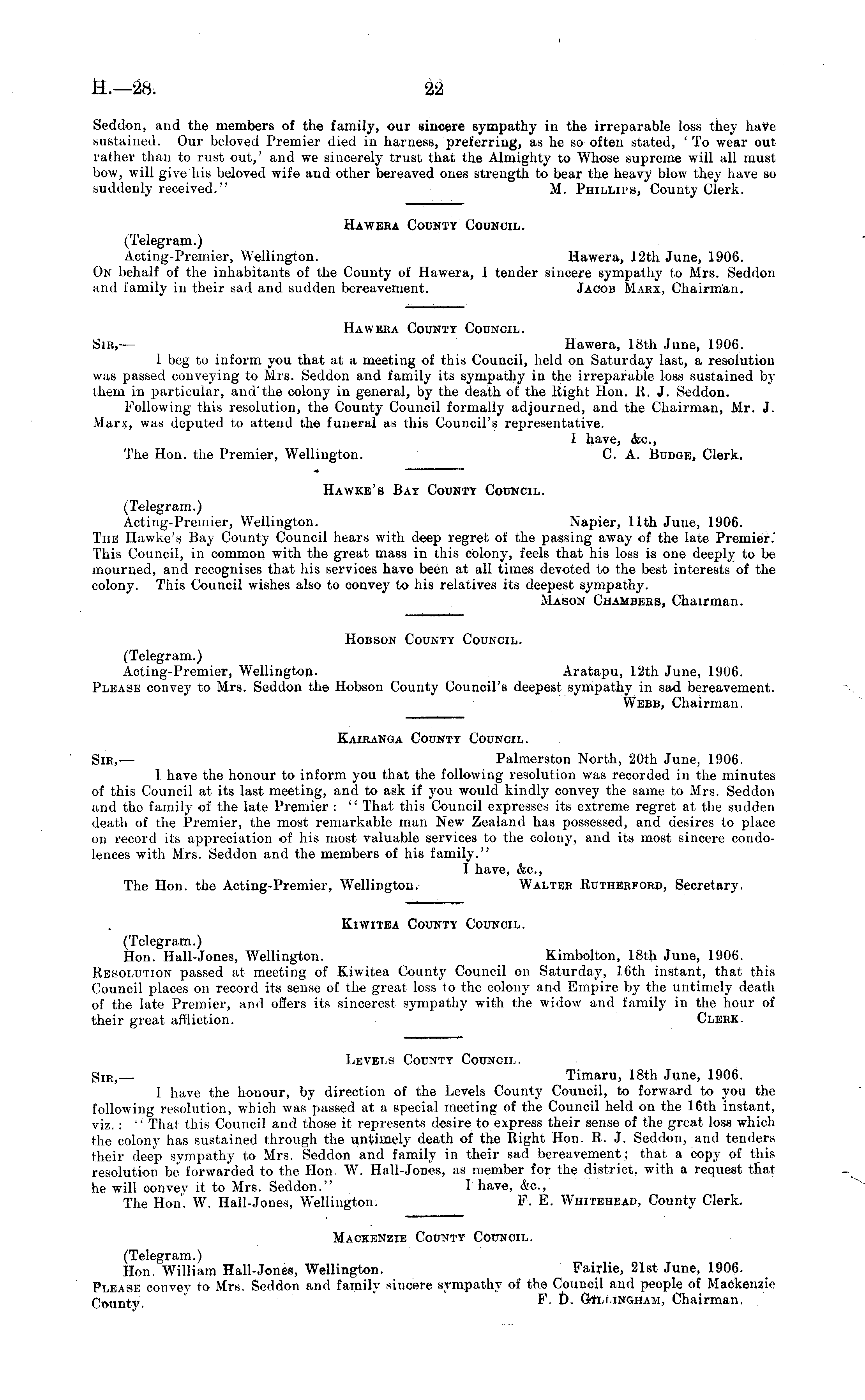 Seddon, and the members of the family, our sincere sympathy in the irreparable loss they have sustained. Our beloved Premier died in harness, preferring, as he so often stated, 'To wear out rather than to rust out,' and we sincerely trust that the Almighty to Whose supreme will all must bow, will give his beloved wife and other bereaved ones strength to bear the heavy blow they have so suddenly received." M. Phillips, County Clerk. Hawera County Council. (Telegram.) Acting-Premier, Wellington. Hawera, 12th June, 1906. On behalf of the inhabitants of the County of Hawera, I tender sincere sympathy to Mrs. Seddon and family in their sad and sudden bereavement. Jacob Marx, Chairman. Hawera County Council. Sir, — Hawera, 18th June, 1906. 1 beg to inform you that at a meeting of this Council, held on Saturday last, a resolution was passed conveying to Mrs. Seddon and family its sympathy in the irreparable loss sustained by them in particular, and'the colony in general, by the death of the Right Hon. R. J. Seddon. Following this resolution, the County Council formally adjourned, and the Chairman, Mr. J. Marx, was deputed to attend the funeral as this Council's representative. I have, &c, The Hon. the Premier, Wellington. C. A. Budge, Clerk. Hawke's Bay County Council. (Telegram.) Acting-Premier, Wellington. Napier, 11th June, 1906. The Hawke's Bay County Council hears with deep regret of the passing away of the late Premier.' This Council, in common with the great mass in this colony, feels that his loss is one deeply to be mourned, and recognises that his services have been at all times devoted to the best interests of the colony. This Council wishes also to convey to his relatives its deepest sympathy. Mason Chambers, Chairman. Hobson County Council. (Telegram.) Acting-Premier, Wellington. Aratapu, 12th June, 1906. Please convey to Mrs. Seddon the Hobson County Council's deepest sympathy in sad bereavement. Webb, Chairman. Kairanga County Council. Sir, — Palmerston North, 20th June, 1906. 1 have the honour to inform you that the following resolution was recorded in the minutes of this Council at its last meeting, and to ask if you would kindly convey the same to Mrs. Seddon and the family of the late Premier : " That this Council expresses its extreme regret at the sudden death of the Premier, the most remarkable man New Zealand has possessed, and desires to place on record its appreciation of his most valuable services to the colony, and its most sincere condolences with Mrs. Seddon and the members of his family." I have, &c, The Hon. the Acting-Premier, Wellington. Walter Rutherford, Secretary. Kiwitea County Council. (Telegram.) Hon. Hall-Jones, Wellington. Kimbolton, 18th June, 1906. Resolution passed at meeting of Kiwitea County Council on Saturday, 16th instant, that this Council places on record its sense of the great loss to the colony and Empire by the untimely death of the late Premier, and offers its sincerest sympathy with the widow and family in the hour of their great affliction. Clerk. Levels County Council. S IR) — Timaru, 18th June, 1906. I have the honour, by direction of the Levels County Council, to forward to you the following resolution, which was passed at a special meeting of the Council held on the 16th instant, viz. : " That this Council and those it represents desire to express their sense of the great loss which the colony has sustained through the untimely death of the Right Hon. R. J. Seddon, and tenders their deep sympathy to Mrs. Seddon and family in their sad bereavement; that a copy of this resolution be forwarded to the Hon. W. Hall-Jones, as member for the district, with a request that he will oonvev it to Mrs. Seddon." I have, (fee, The Hon. W. Hall-Jones, Wellington. F. E. Whitehead, County Clerk. Mackenzie County Council. (Telegram.) Hon. William Hall-Jones, Wellington. Fairlie, 21st June, 1906. Please convey to Mrs. Seddon and family sincere sympathy of the Council and people of Mackenzie County. F. D. Gilmngham, Chairman.