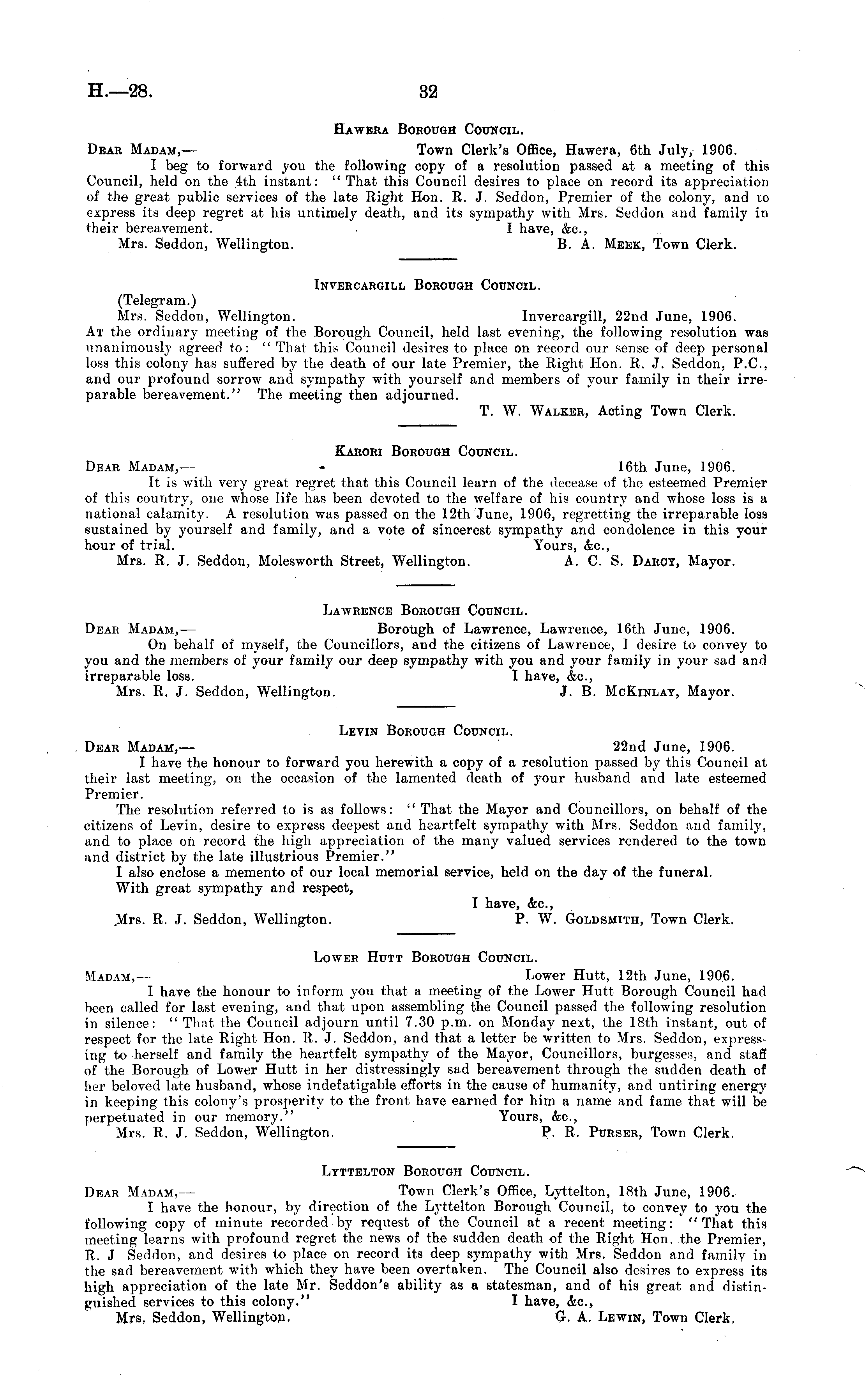 Hawera Borough Council. Dear Madam,— Town Clerk's Office, Hawera, 6th July, 1906. I beg to forward you the following copy of a resolution passed at a meeting of this Council, held on the 4th instant: "That this Council desires to place on record its appreciation of the great public services of the late Right Hon. R. J. Seddon, Premier of the colony, and to express its deep regret at his untimely death, and its sympathy with Mrs. Seddon and family in their bereavement. I have, &c, Mrs. Seddon, Wellington. B. A. Meek, Town Clerk. Invercargill Borough Council. (Telegram.) Mrs. Seddon, Wellington. Invercargill, 22nd June, 1906. At the ordinary meeting of the Borough Council, held last evening, the following resolution was unanimously agreed to: " That this Council desires to place on record our sense of deep personal loss this colony has suffered by the death of our late Premier, the Right Hon. R. J. Seddon, P.C., and our profound sorrow and sympathy with yourself and members of your family in their irreparable bereavement." The meeting then adjourned. T. W. Walker, Acting Town Clerk. Karori Borough Council. Dear Madam, — - 16th June, 1906. It is with very great regret that this Council learn of the decease of the esteemed Premier of this country, one whose life has been devoted to the welfare of his country and whose loss is a national calamity. A resolution was passed on the 12th June, 1906, regretting the irreparable loss sustained by yourself and family, and a vote of sincerest sympathy and condolence in this your hour of trial. Yours, &c, Mrs. R. J. Seddon, Molesworth Street, Wellington. A. C. S. Darcy, Mayor. Lawrence Borough Council. Dear Madam, — Borough of Lawrence, Lawrence, 16th June, 1906. On behalf of myself, the Councillors, and the citizens of Lawrence, 1 desire to convey to you and the members of your family our deep sympathy with you and your family in your sad and irreparable loss. I have, &c, Mrs. R. J. Seddon, Wellington. J. B. McKinlay, Mayor. Levin Borough Council. Dear Madam, — 22nd June, 1906. I have the honour to forward you herewith a copy of a resolution passed by this Council at their last meeting, on the occasion of the lamented death of your husband and late esteemed Premier. The resolution referred to is as follows: " That the Mayor and Councillors, on behalf of the citizens of Levin, desire to express deepest and heartfelt sympathy with Mrs. Seddon and family, and to place on record the high appreciation of the many valued services rendered to the town and district by the late illustrious Premier." I also enclose a memento of our local memorial service, held on the day of the funeral. With great sympathy and respect, I have, (fee, Mrs. R. J. Seddon, Wellington. P. W. Goldsmith, Town Clerk. Lower Hutt Borough Council. Madam,— Lower Hutt, 12th June, 1906. I have the honour to inform you that a meeting of the Lower Hutt Borough Council had been called for last evening, and that upon assembling the Council passed the following resolution in silence: " That the Council adjourn until 7.30 p.m. on Monday next, the 18th instant, out of respect for the late Right Hon. R. J. Seddon, and that a letter be written to Mrs. Seddon, expressing to herself and family the heartfelt sympathy of the Mayor, Councillors, burgesses, and staff of the Borough of Lower Hutt in her distressingly sad bereavement through the sudden death of her beloved late husband, whose indefatigable efforts in the cause of humanity, and untiring energy in keeping this colony's prosperity to the front have earned for him a name and fame that will be perpetuated in our memory." Yours, &c, Mrs. R. J. Seddon, Wellington. P. R. Purser, Town Clerk. Lyttelton Borough Council. Dear Madam,— Town Clerk's Office, Lyttelton, 18th June, 1906. I have the honour, by direction of the Lyttelton Borough Council, to convey to you the following copy of minute recorded by request of the Council at a recent meeting: "That this meeting learns with profound regret the news of the sudden death of the Right Hon. the Premier, R. J Seddon, and desires to place on record its deep sympathy with Mrs. Seddon and family in the sad bereavement with which they have been overtaken. The Council also desires to express its high appreciation of the late Mr. Seddon's ability as a statesman, and of his great and distinguished services to this colony." I have, <fee, Mrs. Seddon, Wellington. G, A. Lewin, Town Clerk,