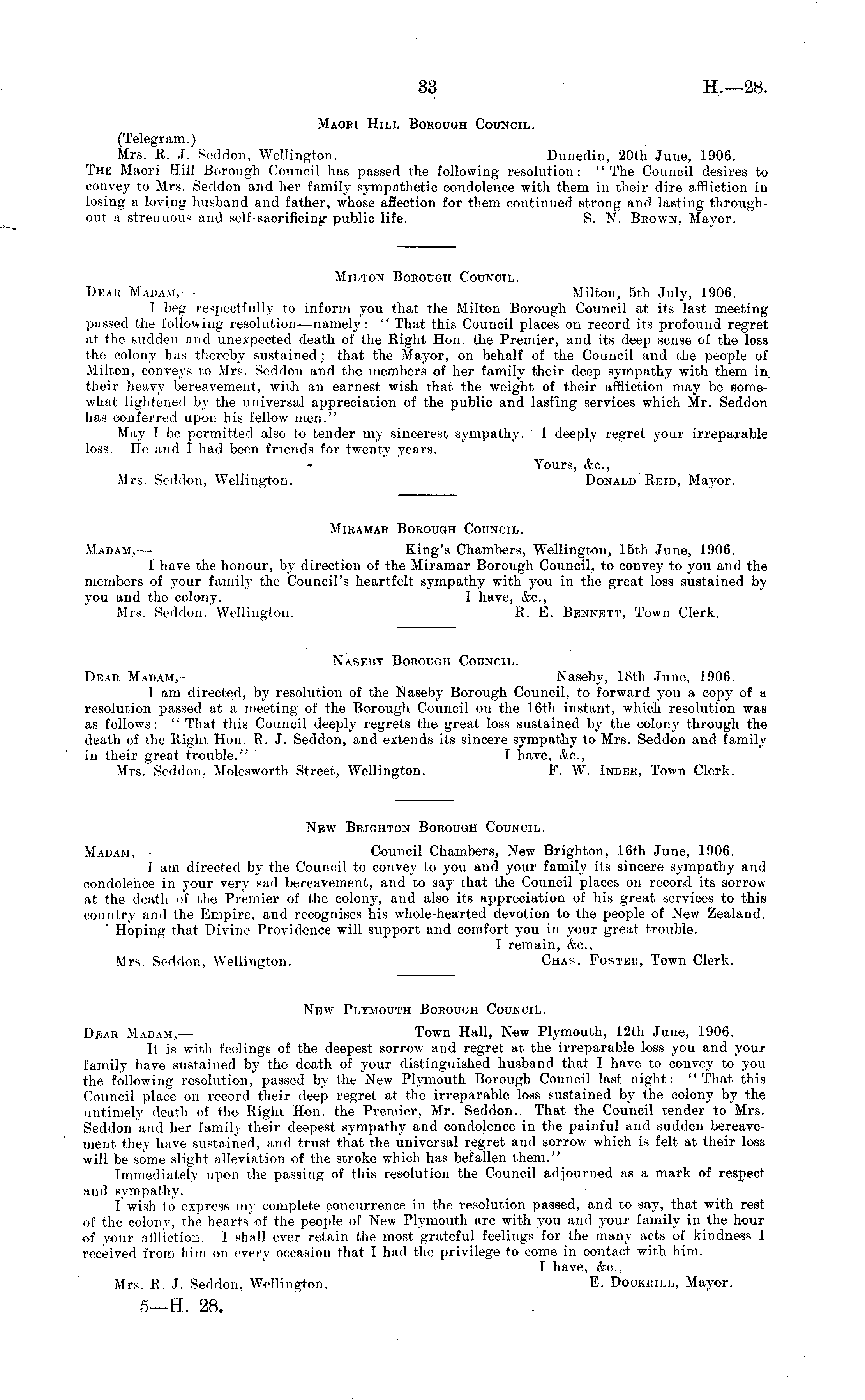 Maori Hill Borough Council. (Telegram.) Mrs. R. J. Seddon, Wellington. Dunedin, 20th June, 1906. The Maori Hill Borough Council has passed the following resolution: "The Council desires to convey to Mrs. Seddon and her family sympathetic condolence with them in their dire affliction in losing a loving husband and father, whose affection for them continued strong and lasting throughout a strenuous and self-sacrificing public life. S. N. Brown, Mayor. Milton Borough Council. Dear Madam,— Milton, sth July, 1906. I beg respectfully to inform you that the Milton Borough Council at its last meeting passed the following resolution—namely: " That this Council places on record its profound regret at the sudden and unexpected death of the Right Hon. the Premier, and its deep sense of the loss the colony has thereby sustained; that the Mayor, on behalf of the Council and the people of Milton, conveys to Mrs. Seddon and the members of her family their deep sympathy with them in their heavy bereavement, with an earnest wish that the weight of their affliction may be somewhat lightened by the universal appreciation of the public and lasting services which Mr. Seddon has conferred upon his fellow men." May Ibe permitted also to tender my sincerest sympathy. I deeply regret your irreparable loss. He and I had been friends for twenty years. Yours, &c, Mrs. Seddon, Wellington. Donald Reid, Mayor. MiRAMAR Borough Council. Madam, — King's Chambers, Wellington, 15th June, 1906. I have the honour, by direction of the Miramar Borough Council, to convey to you and the members of your family the Council's heartfelt sympathy with you in the great loss sustained by you and the colony. I have, &c, Mrs. Seddon, Wellington. R. E. Bennett, Town Clerk. Naseby Borough Council. Dear Madam, — Naseby, 18th June, 1906. I am directed, by resolution of the Naseby Borough Council, to forward you a copy of a resolution passed at a meeting of the Borough Council on the 16th instant, which resolution was as follows: " That this Council deeply regrets the great loss sustained by the colony through the death of the Right Hon. R. J. Seddon, and extends its sincere sympathy to Mrs. Seddon and family in their great trouble." ' I have, (fee, Mrs. Seddon, Molesworth Street, Wellington. F. W. Inder, Town Clerk. New Brighton Borough Council. Madam, — Council Chambers, New Brighton, 16th June, 1906. I am directed by the Council to convey to you and your family its sincere sympathy and condolence in your very sad bereavement, and to say that the Council places on record its sorrow at the death of the Premier of the colony, and also its appreciation of his great services to this country and the Empire, and recognises his whole-hearted devotion to the people of New Zealand. Hoping that Divine Providence will support and comfort you in your great trouble. I remain, &c, Mrs. Seddon, Wellington. Chas. Foster, Town Clerk. New Plymouth Borough Council. Dear Madam,— Town Hall, New Plymouth, 12th June, 1906. It is with feelings of the deepest sorrow and regret at the irreparable loss you and your family have sustained by the death of your distinguished husband that I have to convey to you the following resolution, passed by the New Plymouth Borough Council last night: "That this Council place on record their deep regret at the irreparable loss sustained by the colony by the untimely death of the Right Hon. the Premier, Mr. Seddon. That the Council tender to Mrs. Seddon "and her family their deepest sympathy and condolence in the painful and sudden bereavement they have sustained, and trust that the universal regret and sorrow which is felt at their loss will be some slight alleviation of the stroke which has befallen them." Immediately upon the passing of this resolution the Council adjourned as a mark of respect and sympathy. I wish to express my complete concurrence in the resolution passed, and to say, that with rest of the colony, the hearts of the people of New Plymouth are with you and your family in the hour of your affliction. I shall ever retain the most grateful feelings for the many acts of kindness I received from him on every occasion that I had the privilege to come in contact with him. I have, (fee, Mrs. R. J. Seddon, Wellington. E. Dockrill, Mayor,