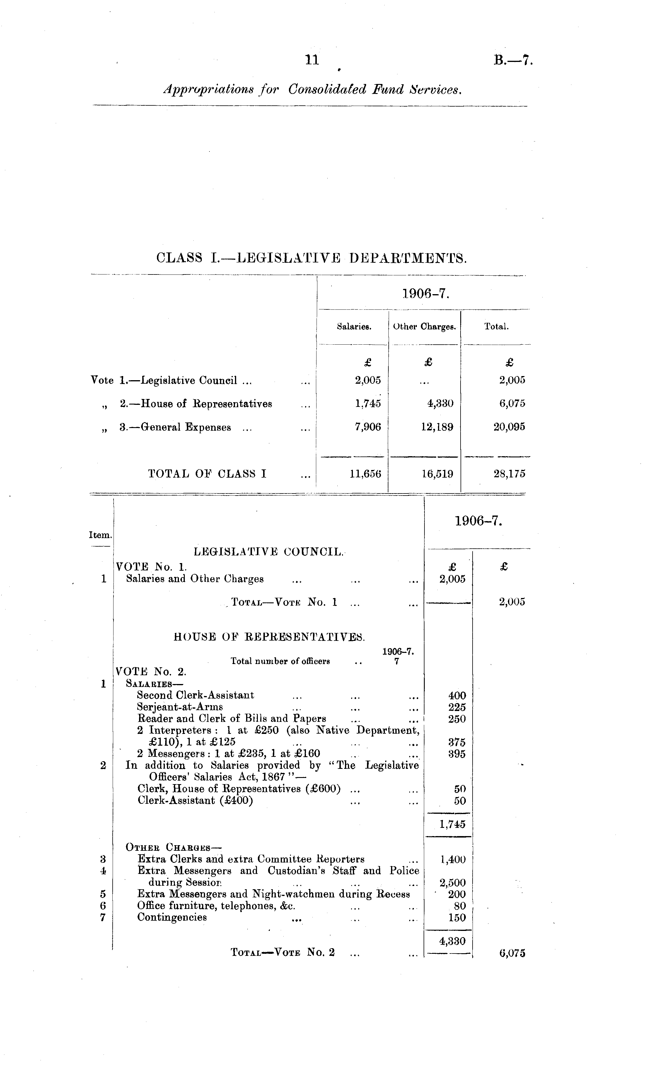 1906-7. Salaries. Other Charges. Total. £ £ £ Vote 1.—Legislative Council ... „ 2. —House of Representatives 2,005 1,745 2,005 4,330 6,075 „ 3. —General Expenses ... 7,906 12,189 20,095 TOTAL OF CLASS I 11,656 11,656 6,519 28,175 19 i6-7. ttem. LEGISLATIVE COUNCIL. VOTE No. 1. Salaries and Other Charges £ 2,005 £ Total —Vote No. 1 ... 2,005 HOUSE OF REPRESENTATIVES. 1906-7. Total number of officers .. 7 VOTE No. 2. Salaries— Second Clerk-Assistant Serjeant-at-Arms Reader and Clerk of Bills and Papers 2 Interpreters : 1 at £250 (also Native Department, £110), 1 at £125 2 Messengers : 1 at £235, 1 at £160 In addition to Salaries provided by " The Legislative Officers' Salaries Act, 1867 "— Clerk, House of Representatives (£600) ... Clerk-Assistant (£400) 400 225 250 375 395 50 50 Other Charges— Extra Clerks and extra Committee Reporters Extra Messengers and Custodian's Staff and Police during Session Extra Messengers and Night-watchmen during Recess Office furniture, telephones, &c. Contingencies 1,745 3 4 1,400 5 6 7 2,500 ' 200 80 150 Total—Vote No. 2 4,330 6,075