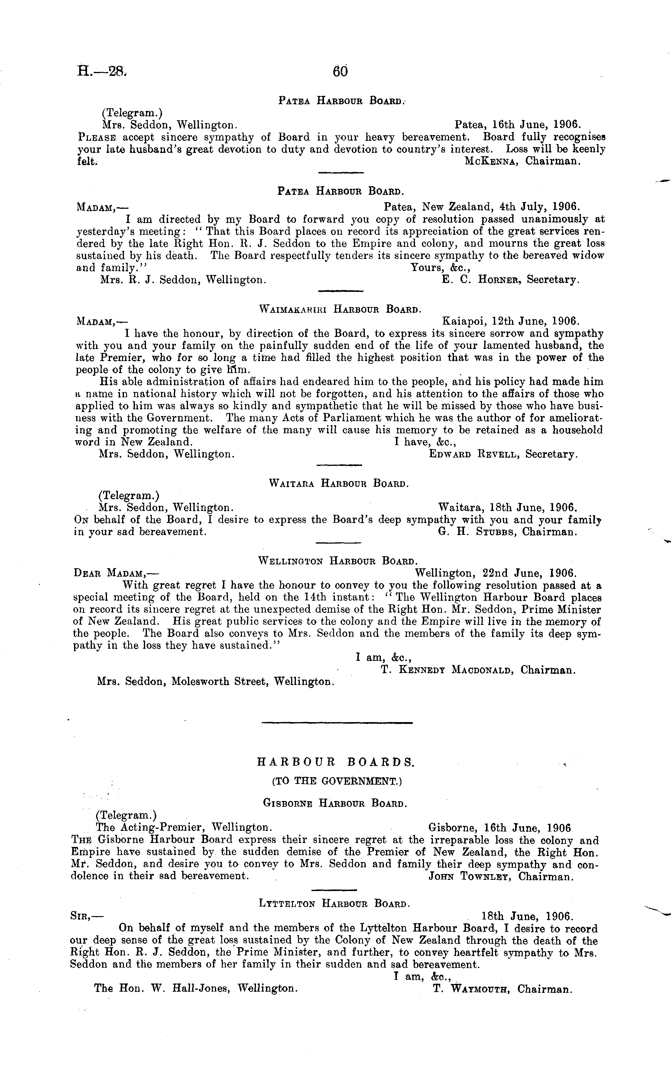 HARBOURBOARDS. (TO THE GOVERNMENT.) Gisborne Harbour Board. (Telegram.) The Acting-Premier, Wellington. Gisborne, 16th June, 1906 The Gisborne Harbour Board express their sincere regret at the irreparable loss the colony and Empire have sustained by the sudden demise of the Premier of New Zealand, the Right Hon. Mr. Seddon, and desire you to convey to Mrs. Seddon and family their deep sympathy and condolence in their sad bereavement. John Townley, Chairman. Lyttelton Harbour Board. Sir,— 18th June, 1906. On behalf of myself and the members of the Lyttelton Harbour Board, I desire to record our deep sense of the great loss sustained by the Colony of New Zealand through the death of the Right Hon. R. J. Seddon, the Prime Minister, and further, to convey heartfelt sympathy to Mrs. Seddon and the members of her family in their sudden and sad bereavement. I am, (fee, The Hon. W. Hall-Jones, Wellington. T. Waymouth, Chairman.