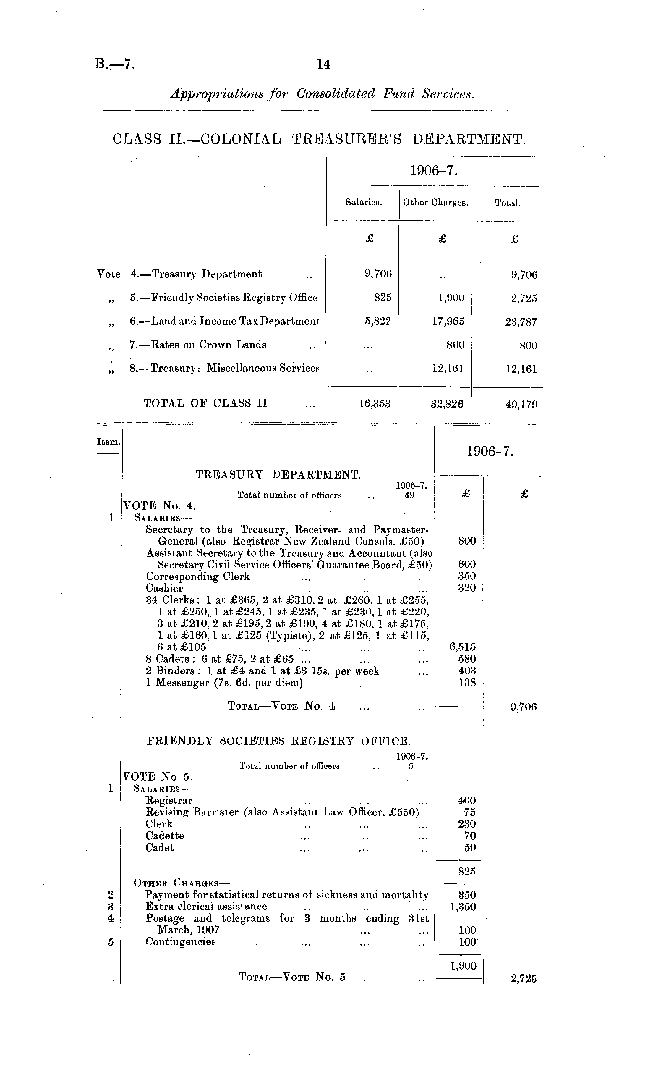 1906-7. Salaries. Other Charges Total. £ £ £ £ ote 4.—Treasury Department 9,706 9,706 3 9,706 )i 5.—Friendly Societies Registry Office 825 825 5 1,900 2,725 ») 6.—Land and Income Tax Department 5,822 5,822 i 17,965 23,787 7. —Rates on Crown Lands 800 800 »» 8.—Treasury: Miscellaneous Services12,161 12,161 TOTAL OF CLASS II 49,179 16,353 12,826 item. i6-7. TREASURY DEPARTMENT. 1906-7. Total number of officers .. 49 £ VOTE No. 4. Salaries — Secretary to the Treasury, Receiver- and PaymasterGeneral (also Registrar New Zealand Consols, £50) Assistant Secretary to the Treasury and Accountant (also Secretary Civil Service Officers' Guarantee Board, £50) Corresponding Clerk Cashier 34 Clerks: 1 at £365, 2 at £310. 2 at £260, 1 at £255, 1 at £250, 1 at £245,1 at £235, 1 at £230,1 at £220, 3 at £210, 2 at £195, 2 at £190, 4 at £180,1 at £175, 1 at £160,1 at £125 (Typiste), 2 at £125, 1 at £115, 6at£105 8 Cadets : 6 at £75, 2 at £65 ... 2 Binders : 1 at £4 and 1 at £3 15s. per week 1 Messenger (7s. 6d. per diem) 800 600 350 320 6,515 580 403 138 Total —Vote No. 4 9,706 FRIENDLY SOCIETIES REGISTRY OFFICE. 1906-7. Total number of officers .. 5 VOTE No. 5. Salaries— Registrar Revising Barrister (also Assistant Law Officer. £550) Clerk Cadette Cadet ... .:. 400 75 230 70 50 Other Charges— Payment for statistical returns of sickness and mortality Extra clerical assistance Postage and telegrams for 3 months ending 31st March, 1907 Contingencies 825 2 3 4 350 1,350 5 100 100 Total—Vote No. 5 1,900 2,725