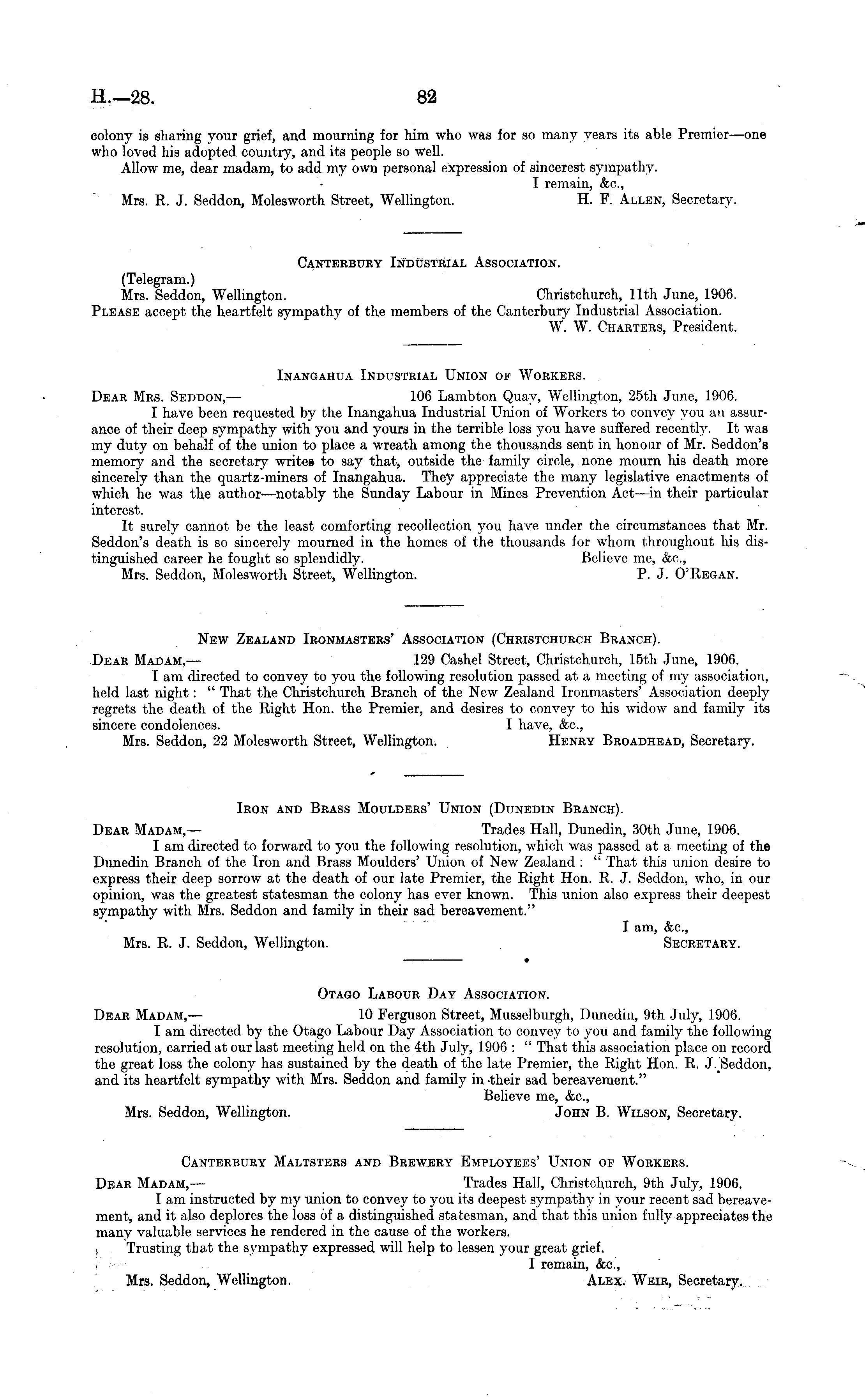colony is sharing your grief, and mourning for him who was for so many years its able Premier—one who loved his adopted country, and its people so well. Allow me, dear madam, to add my own personal expression of sincerest sympathy. I remain, &c, Mrs. R. J. Seddon, Molesworth Street, Wellington. H. F. Allen, Secretary. Canterbury Industrial Association. (Telegram.) Mrs. Seddon, Wellington. Christchurch, 11th June, 1906. Please accept the heartfelt sympathy of the members of the Canterbury Industrial Association. W. W. Charters, President. Inangahua Industrial Union of Workers. Dear Mrs. Seddon, — 106 Lambton Quay, Wellington, 25th June, 1906. I have been requested by the Inangahua Industrial Union of Workers to convey you an assurance of their deep sympathy with you and yours in the terrible loss you have suffered recently. It was my duty on behalf of the union to place a wreath among the thousands sent in honour of Mr. Seddon's memory and the secretary writes to say that, outside the family circle, none mourn his death more sincerely than the quartz-miners of Inangahua. They appreciate the many legislative enactments of which he was the author —notably the Sunday Labour in Mines Prevention Act—in their particular interest. It surely cannot be the least comforting recollection you have under the circumstances that Mr. Seddon's death is so sincerely mourned in the homes of the thousands for whom throughout his distinguished career he fought so splendidly. Believe me, &c, Mrs. Seddon, Molesworth Street, Wellington. P. J. O'Regan. New Zealand Ironmasters' Association (Christchurch Branch). Dear Madam, — 129 Cashel Street, Christchurch, 15th June, 1906. I am directed to convey to you the following resolution passed at a meeting of my association, held last night: " That the Christchurch Branch of the New Zealand Ironmasters' Association deeply regrets the death of the Right Hon. the Premier, and desires to convey to his widow and family its sincere condolences. I have, &c, Mrs. Seddon, 22 Molesworth Street, Wellington. Henry Broadhead, Secretary. Iron and Brass Moulders' Union (Dunedin Branch). Dear Madam, — Trades Hall, Dunedin, 30th June, 1906. I am directed to forward to you the following resolution, which was passed at a meeting of the Dunedin Branch of the Iron and Brass Moulders' Union of New Zealand : " That this union desire to express their deep sorrow at the death of our late Premier, the Right Hon. R. J. Seddon, who, in our opinion, was the greatest statesman the colony has ever known. This union also express their deepest sympathy with Mrs. Seddon and family in their sad bereavement." I am, &c, Mrs. R. J. Seddon, Wellington. Secretary. • Otago Labour Day Association. Dear Madam, — 10 Ferguson Street, Musselburgh, Dunedin, 9th July, 1906. I am directed by the Otago Labour Day Association to convey to you and family the following resolution, carried at our last meeting held on the 4th July, 1906 : " That this association place on record the great loss the colony has sustained by the death of the late Premier, the Right Hon. R. J. Seddon, and its heartfelt sympathy with Mrs. Seddon and family in -their sad bereavement." Believe me, &c, Mrs. Seddon, Wellington. John B. Wilson, Secretary. Canterbury Maltsters and Brewery Employees' Union of Workers. Dear Madam, — Trades Hall, Christchurch, 9th July, 1906. I am instructed by my union to convey to you its deepest sympathy in your recent sad bereavement, and it also deplores the loss of a distinguished statesman, and that this union fully appreciates the many valuable services he rendered in the cause of the workers. , Trusting that the sympathy expressed will help to lessen your great grief. I remain, &c, Mrs. Seddon, Wellington. Alex. Weir, Secretary.