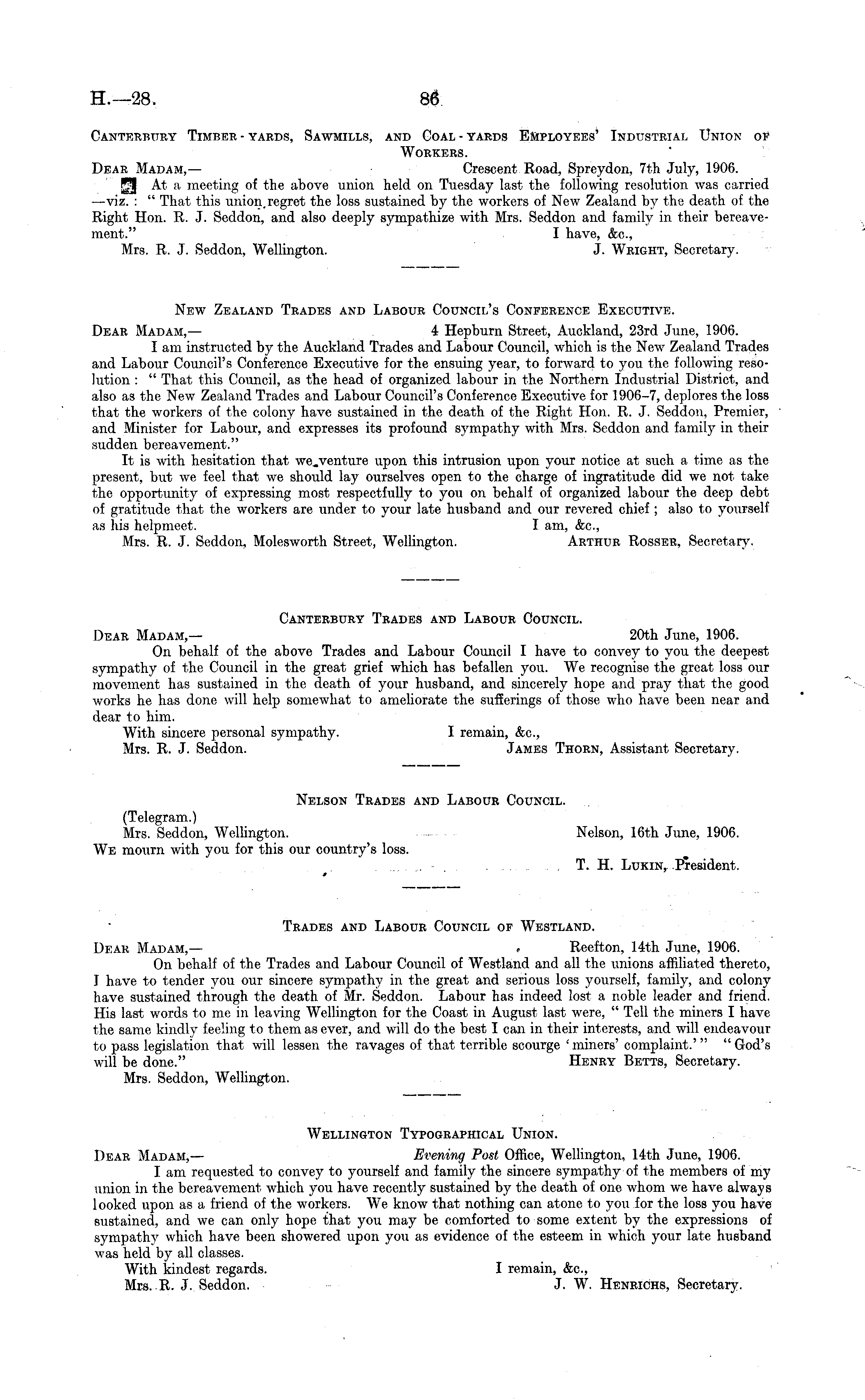 Canterbury Timber-yards, Sawmills, and Coal-yards Employees' Industrial Union of Workers. Dear Madam, — Crescent Road, Spreydon, 7th July, 1906. At a meeting of the above union held on Tuesday last the following resolution was carried —viz. : " That this union, regret the loss sustained by the workers of New Zealand by the death of the Right Hon. R. J. Seddon, and also deeply sympathize with Mrs. Seddon and family in their bereavement." I have, &c, Mrs. R. J. Seddon, Wellington. J. Wright, Secretary. New Zealand Trades and Labour Council's Conference Executive. Dear Madam, — 4 Hepburn Street, Auckland, 23rd June, 1906. I am instructed by the Auckland Trades and Labour Council, which is the New Zealand Trades and Labour Council's Conference Executive for the ensuing year, to forward to you the following resolution : " That this Council, as the head of organized labour in the Northern Industrial District, and also as the New Zealand Trades and Labour Council's Conference Executive for 1906-7, deplores the loss that the workers of the colony have sustained in the death of the Right Hon. R. J. Seddon, Premier, and Minister for Labour, and expresses its profound sympathy with Mrs. Seddon and family in their sudden bereavement." It is with hesitation that we_venture upon this intrusion upon your notice at such a time as the present, but we feel that we should lay ourselves open to the charge of ingratitude did we not take the opportunity of expressing most respectfully to you on behalf of organized labour the deep debt of gratitude that the workers are under to your late husband and our revered chief ; also to yourself as his helpmeet. I am, &c, Mrs. R. J. Seddon, Molesworth Street, Wellington. Arthur Rosser, SecretaryCanterbury Trades and Labour Council. Dear Madam,— 20th June, 1906. On behalf of the above Trades and Labour Council I have to convey to you the deepest sympathy of the Council in the great grief which has befallen you. We recognise the great loss our movement has sustained in the death of your husband, and sincerely hope and pray that the good works he has done will help somewhat to ameliorate the sufferings of those who have been near and dear to him. With sincere personal sympathy. I remain, &c, Mrs. R. J. Seddon. James Thorn, Assistant Secretary. Nelson Trades and Labour Council. (Telegram.) Mrs. Seddon, Wellington. Nelson, 16th June, 1906. We mourn with you for this our country's loss. - T. H. Lukin, President. 0 Trades and Labour Council of Westland. Dear Madam, — . Reefton, 14th June, 1906. On behalf of the Trades and Labour Council of Westland and all the unions affiliated thereto, I have to tender you our sincere sympathy in the great and serious loss yourself, family, and colony have sustained through the death of Mr. Seddon. Labour has indeed lost a noble leader and friend. His last words to me in leaving Wellington for the Coast in August last were, " Tell the miners I have the same kindly feeling to them as ever, and will do the best I can in their interests, and will endeavour to pass legislation that will lessen the ravages of that terrible scourge ' miners' complaint.' " " God's will be done." Henry Betts, Secretary. Mrs. Seddon, Wellington. Wellington Typographical Union. Dear Madam,— Evening Post Office, Wellington, 14th June, 1906. I am requested to convey to yourself and family the sincere sympathy of the members of my union in the bereavement which you have recently sustained by the death of one whom we have always looked upon as a friend of the workers. We know that nothing can atone to you for the loss you have sustained, and we can only hope that you may be comforted to some extent by the expressions of sympathy which have been showered upon you as evidence of the esteem in which your late husband was held by all classes. With kindest regards. I remain, &c, Mrs. R. J. Seddon. J. W. Henrichs, Secretary.