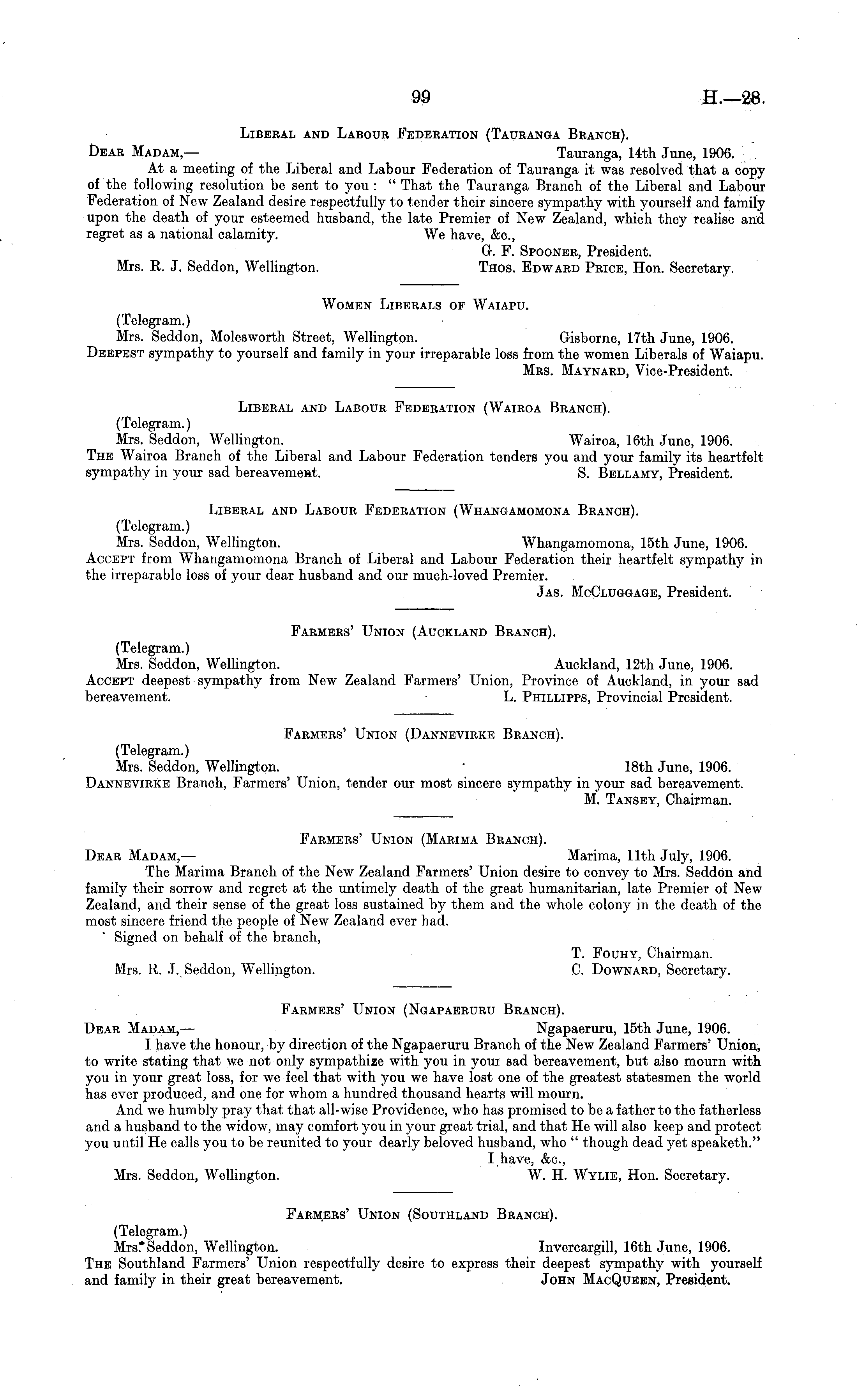 Liberal and Labour Federation (Tauranga Branch). Dear Madam,— Tauranga, 14th June, 1906. At a meeting of the Liberal and Labour Federation of Tauranga it was resolved that a copy Of the following resolution be sent to you : " That the Tauranga Branch of the Liberal and Labour Federation of New Zealand desire respectfully to tender their sincere sympathy with yourself and family upon the death of your esteemed husband, the late Premier of New Zealand, which they realise and regret as a national calamity. We have, &c, G. F. Spooner, President. Mrs. R. J. Seddon, Wellington. Thos. Edward Price, Hon. Secretary. Women Liberals of Waiapu. (Telegram.) Mrs. Seddon, Molesworth Street, Wellington. Gisborne, 17th June, 1906. Deepest sympathy to yourself and family in your irreparable loss from the women Liberals of Waiapu. Mrs. Maynard, Vice-President. Liberal and Labour Federation (Wairoa Branch). (Telegram.) Mrs. Seddon, Wellington. Wairoa, 16th June, 1906. The Wairoa Branch of the Liberal and Labour Federation tenders you and your family its heartfelt sympathy in your sad bereavemeat. S. Bellamy, President. Liberal and Labour Federation (Whangamomona Branch). (Telegram.) Mrs. Seddon, Wellington. Whangamomona, 15th June, 1906. Accept from Whangamomona Branch of Liberal and Labour Federation their heartfelt sympathy in the irreparable loss of your dear husband and our much-loved Premier. J as. McCluggage, President. Farmers' Union (Auckland Branch). (Telegram.) Mrs. Seddon, Wellington. Auckland, 12th June, 1906. Accept deepest sympathy from New Zealand Farmers' Union, Province of Auckland, in your sad bereavement. L. Phillipps, Provincial President. Farmers' Union (Dannevirke Branch). (Telegram.) Mrs. Seddon, Wellington. ' 18th June, 1906. Dannevirke Branch, Farmers' Union, tender our most sincere sympathy in your sad bereavement. M. Tansey, Chairman. Farmers' Union (Marima Branch). Dear Madam, — Marima, 11th July, 1906. The Marima Branch of the New Zealand Farmers' Union desire to convey to Mrs. Seddon and family their sorrow and regret at the untimely death of the great humanitarian, late Premier of New Zealand, and their sense of the great loss sustained by them and the whole colony in the death of the most sincere friend the people of New Zealand ever had. Signed on behalf of the branch, T. Fouhy, Chairman. Mrs. R. J. Seddon, Wellington. C. Downard, Secretary. Farmers' Union (Ngapaeruru Branch). Dear Madam, — Ngapaeruru, 15th June, 1906. I have the honour, by direction of the Ngapaeruru Branch of the New Zealand Farmers' Union, to write stating that we not only sympathize with you in your sad bereavement, but also mourn with you in your great loss, for we feel that with you we have lost one of the greatest statesmen the world has ever produced, and one for whom a hundred thousand hearts will mourn. And we humbly pray that that all-wise Providence, who has promised to be a father to the fatherless and a husband to the widow, may comfort you in your great trial, and that He will also keep and protect you until He calls you to be reunited to your dearly beloved husband, who " though dead yet speaketh." I have, &c, Mrs. Seddon, Wellington. W. H. Wylie, Hon. Secretary. Farmers' Union (Southland Branch). (Telegram.) MrsT Seddon, Wellington. Invercargill, 16th June, 1906. The Southland Farmers' Union respectfully desire to express their deepest sympathy with yourself and family in their great bereavement. John Mac Queen, President.