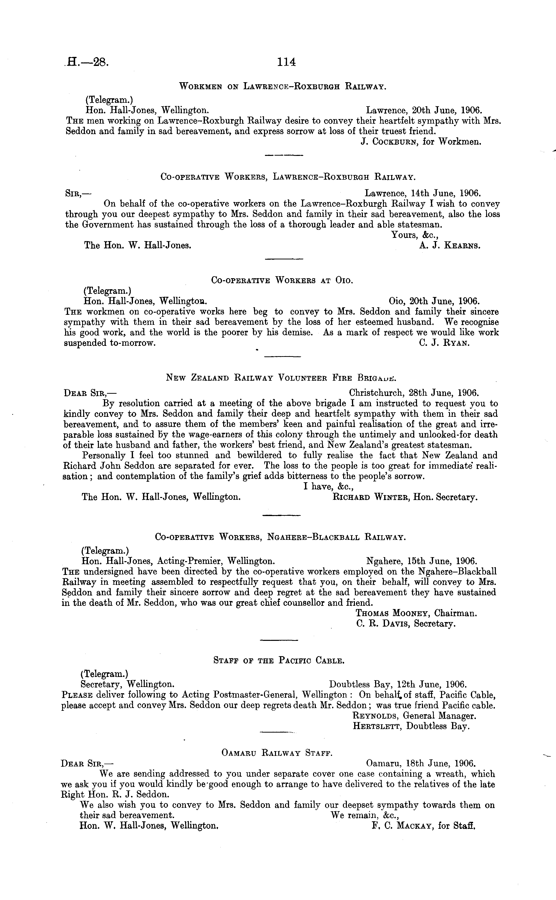 Workmen on Lawrence-Roxburgh Railway. (Telegram.) Hon. Hall-Jones, Wellington. Lawrence, 20th June, 1906. The men working on Lawrence-Roxburgh Railway desire to convey their heartfelt sympathy with Mrs. Seddon and family in sad bereavement, and express sorrow at loss of their truest friend. J. Cockburn, for Workmen. Co-operative Workers, Lawrence-Roxburgh Railway. Sir, — Lawrence, 14th June, 1906. On behalf of the co-operative workers on the Lawrence-Roxburgh Railway I wish to convey through you our deepest sympathy to Mrs. Seddon and family in their sad bereavement, also the loss the Government has sustained through the loss of a thorough leader and able statesman. Yours, &c, The Hon. W. Hall-Jones. A. J. Kearns. Co-operative Workers at Oio. (Telegram.) Hon. Hall-Jones, Wellington. Oio, 20th June, 1906. The workmen on co-operative works here beg to convey to Mrs. Seddon and family their sincere sympathy with them in their sad bereavement by the loss of her esteemed husband. We recognise his good work, and the world is the poorer by his demise. As a mark of respect we would like work suspended to-morrow. C. J. Ryan. New Zealand Railway Volunteer Fire BrigauE. Dear Sir, — Christchurch, 28th June, 1906. By resolution carried at a meeting of the above brigade I am instructed to request you to kindly convey to Mrs. Seddon and family their deep and heartfelt sympathy with them in their sad bereavement, and to assure them of the members' keen and painful realisation of the great and irreparable loss sustained by the wage-earners of this colony through the untimely and unlooked-for death of their late husband and father, the workers' best friend, and New Zealand's greatest statesman. Personally I feel too stunned and bewildered to fully realise the fact that New Zealand and Richard John Seddon are separated for ever. The loss to the people is too great for immediate' realisation ; and contemplation of the family's grief adds bitterness to the people's sorrow. I have, &c, The Hon. W. Hall-Jones, Wellington. Richard Winter, Hon. Secretary. Co-operative Workers, Ngahere-Blackball Railway. (Telegram.) Hon. Hall-Jones, Acting-Premier, Wellington. Ngahere, 15th June, 1906. The undersigned have been directed by the co-operative workers employed on the Ngahere-Blackball Railway in meeting assembled to respectfully request that you, on their behalf, will convey to Mrs. Seddon and family their sincere sorrow and deep regret at the sad bereavement they have sustained in the death of Mr. Seddon, who was our great chief counsellor and friend. Thomas Mooney, Chairman. C. R. Davis, Secretary. Staff of the Pacific Cable. (Telegram.) Secretary, Wellington. Doubtless Bay, 12th June, 1906. Please deliver following to Acting Postmaster-General, Wellington : On behalf, of staff, Pacific Cable, please accept and convey Mrs. Seddon our deep regrets death Mr. Seddon; was true friend Pacific cable. Reynolds, General Manager. Hertslett, Doubtless Bay. Oamaru Railway Staff. Dear Sir, — Oamaru, 18th June, 1906. We are sending addressed to you under separate cover one case containing a wreath, which we ask you if you would kindly be good enough to arrange to have delivered to the relatives of the late Right Hon. R. J. Seddon. We also wish you to convey to Mrs. Seddon and family our deepset sympathy towards them on their sad bereavement. We remain, &c, Hon. W, Hall-Jones, Wellington. F, C. Mackay, for Staff.