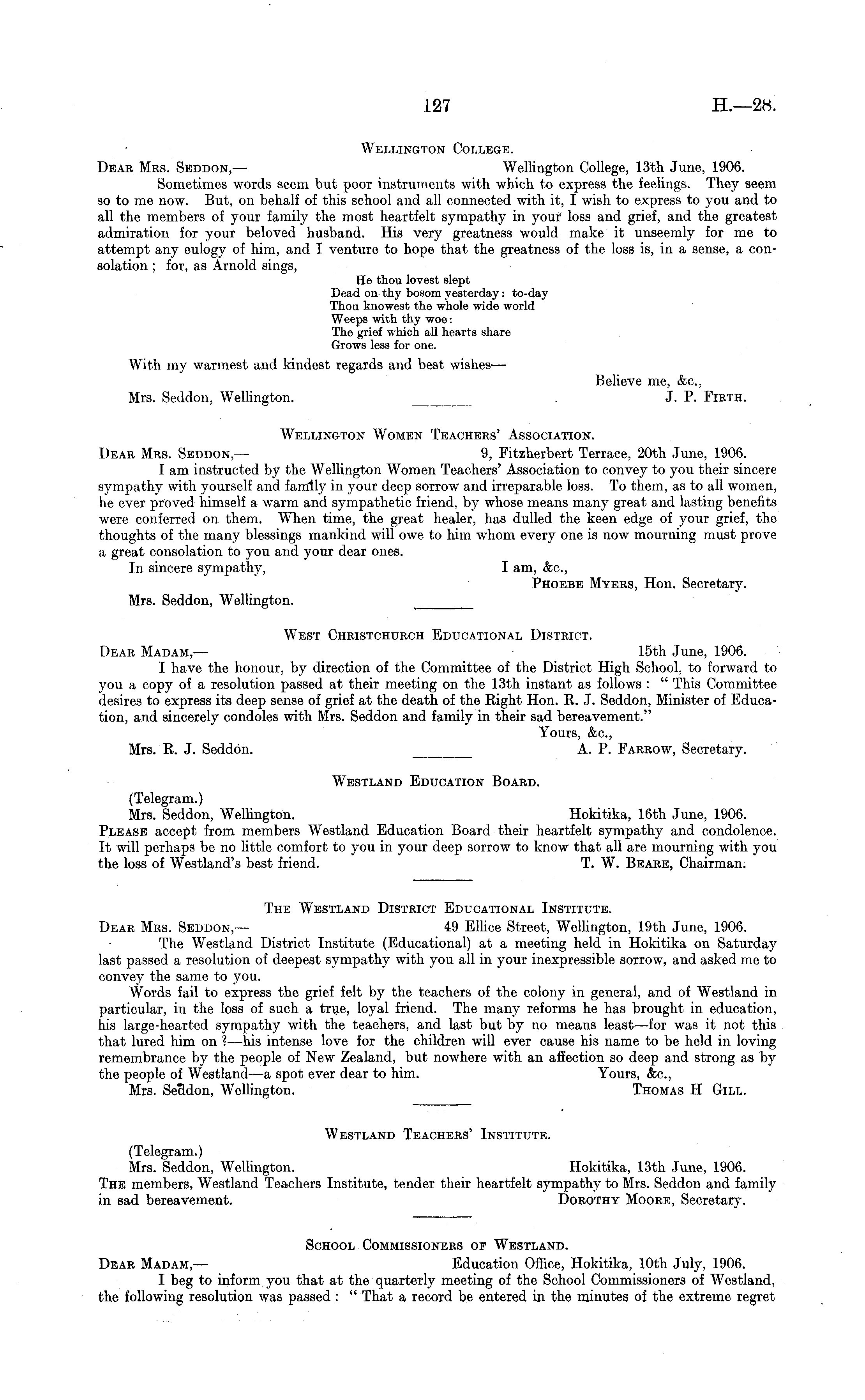 Wellington College. Dear Mrs. Seddon, — Wellington College, 13th June, 1906. Sometimes words seem but poor instruments with which to express the feelings. They seem so to me now. But, on behalf of this school and all connected with it, I wish to express to you and to all the members of your family the most heartfelt sympathy in your loss and grief, and the greatest admiration for your beloved husband. His very greatness would make it unseemly for me to attempt any eulogy of him, and I venture to hope that the greatness of the loss is, in a sense, a consolation ; for, as Arnold sings, He thou lovest slept Dead on thy bosom yesterday: to-day Thou knowest the whole wide world Weeps with thy woe: The grief which all hearts share Grows less for one. With my warmest and kindest regards and best wishes — Believe me, &c, Mrs. Seddon, Wellington. . J. P. Firth. Wellington Women Teachers' Association. Dear Mrs. Seddon, — 9, Fitzherbert Terrace, 20th June, 1906. I am instructed by the Wellington Women Teachers' Association to convey to you their sincere sympathy with yourself and family in your deep sorrow and irreparable loss. To them, as to all women, he ever proved himself a warm and sympathetic friend, by whose means many great and lasting benefits were conferred on them. When time, the great healer, has dulled the keen edge of your grief, the thoughts of the many blessings mankind will owe to him whom every one is now mourning must prove a great consolation to you and your dear ones. In sincere sympathy, I am, &c, Phoebe Myers, Hon. Secretary. Mrs. Seddon, Wellington. West Christchurch Educational District. Dear Madam, — 15th June, 1906. I have the honour, by direction of the Committee of the District High School, to forward to you a copy of a resolution passed at their meeting on the 13th instant as follows : " This Committee desires to express its deep sense of grief at the death of the Right Hon. R. J. Seddon, Minister of Education, and sincerely condoles with Mrs. Seddon and family in their sad bereavement." Yours, &c, Mrs. R. J. Seddon. A. P. Farrow, Secretary. Westland Education Board. (Telegram.) Mrs. Seddon, Wellington. Hokitika, 16th June, 1906. Please accept from members Westland Education Board their heartfelt sympathy and condolence. It will perhaps be no little comfort to you in your deep sorrow to know that all are mourning with you the loss of Westland's best friend. T. W. Beare, Chairman. The Westland District Educational Institute. Dear Mrs. Seddon,— 49 Ellice Street, Wellington, 19th June, 1906. The Westland District Institute (Educational) at a meeting held in Hokitika on Saturday last passed a resolution of deepest sympathy with you all in your inexpressible sorrow, and asked me to convey the same to you. Words fail to express the grief felt by the teachers of the colony in general, and of Westland in particular, in the loss of such a true, loyal friend. The many reforms he has brought in education, his large-hearted sympathy with the teachers, and last but by no means least—for was it not this that lured him on % —his intense love for the children will ever cause his name to be held in loving remembrance by the people of New Zealand, but nowhere with an affection so deep and strong as by the people of Westland —a spot ever dear to him. Yours, &c, Mrs. Secldon, Wellington. Thomas H Gill. Westland Teachers' Institute. (Telegram.) Mrs. Seddon, Wellington. Hokitika, 13th June, 1906. The members, Westland Teachers Institute, tender their heartfelt sympathy to Mrs. Seddon and family in sad bereavement. Dorothy Moore, Secretary. School Commissioners of Westland. Dear Madam, — Education Office, Hokitika, 10th July, 1906. I beg to inform you that at the quarterly meeting of the School Commissioners of Westland, the following resolution was passed : " That a record be entered in the minutes of the extreme regret