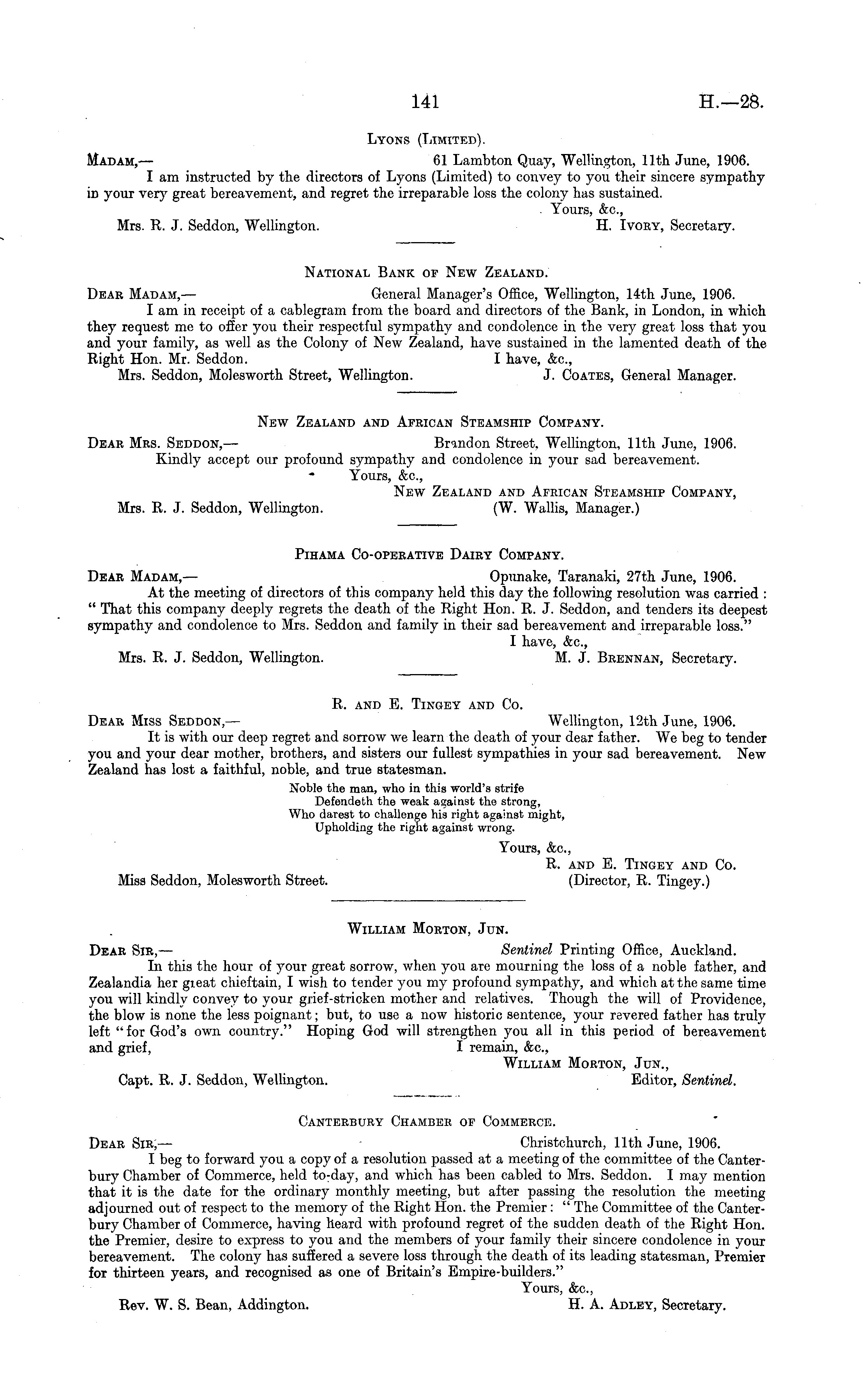 Lyons (Limited). Madam, — 61 Lambton Quay, Wellington, 11th June, 1906. I am instructed by the directors of Lyons (Limited) to convey to you their sincere sympathy in your very great bereavement, and regret the irreparable loss the colony has sustained. . Yours, &c, Mrs. R. J. Seddon, Wellington. H. Ivory, Secretary. National Bank of New Zealand. Dear Madam,— General Manager's Office, Wellington, 14th June, 1906. I am in receipt of a cablegram from the board and directors of the Bank, in London, in which they request me to offer you their respectful sympathy and condolence in the very great loss that you and your family, as yvell as the Colony of New Zealand, have sustained in the lamented death of the Right Hon. Mr. Seddon. I have, &c, Mrs. Seddon, Molesworth Street, Wellington. J. Coates, General Manager. New Zealand and African Steamship Company. Dear Mrs. Seddon, — Brandon Street. Wellington, 11th June, 1906. Kindly accept our profound sympathy and condolence in your sad bereavement. Yours, &c, New Zealand and African Steamship Company, Mrs. R. J. Seddon, Wellington. (W. Wallis, Manager.) Pihama Co-operative Dairy Company. Dear Madam, — Opunake, Taranaki, 27th June, 1906. At the meeting of directors of this company held this day the following resolution was carried : " That this company deeply regrets the death of the Right Hon. R. J. Seddon, and tenders its deepest sympathy and condolence to Mrs. Seddon and family in their sad bereavement and irreparable loss." I have, &c, Mrs. R. J. Seddon, Wellington. M. J. Brennan, Secretary. R. and E. Tingey and Co. Dear Miss Seddon, — Wellington, 12th June, 1906. It is with our deep regret and sorrow we learn the death of your dear father. We beg to tender you and your dear mother, brothers, and sisters our fullest sympathies in your sad bereavement. New Zealand has lost a faithful, noble, and true statesman. Noble the man, who in this world's strife Defendeth the weak against the strong, Who darest to challenge his right against might, Upholding the right against wrong. Yours, &c, R. and E. Tingey and Co. Miss Seddon, Molesworth Street. (Director, R. Tingey.) William Morton, Jun. Dear Sir, — Sentinel Printing Office, Auckland. In this the hour of your great sorrow, when you are mourning the loss of a noble father, and Zealandia her gieat chieftain, I wish to tender you my profound sympathy, and which at the same time you will kindly convey to your grief-stricken mother and relatives. Though the will of Providence, the blow is none the less poignant; but, to use a now historic sentence, your revered father has truly left " for God's own country." Hoping God will strengthen you all in this period of bereavement and grief, I remain, &c, William Morton, Jun., Capt. R. J. Seddon, Wellington. Editor, Sentinel. Canterbury Chamber of Commerce. Dear Sir,— Christchurch, 11th June, 1906. I beg to forward you a copy of a resolution passed at a meeting of the committee of the Canterbury Chamber of Commerce, held to : day, and which has been cabled to Mrs. Seddon. I may mention that it is the date for the ordinary monthly meeting, but after passing the resolution the meeting adjourned out of respect to the memory of the Right Hon. the Premier : " The Committee of the Canterbury Chamber of Commerce, having heard with profound regret of the sudden death of the Right Hon. the Premier, desire to express to you and the members of your family their sincere condolence in your bereavement. The colony has suffered a severe loss through the death of its leading statesman, Premier for thirteen years, and recognised as one of Britain's Empire-builders." Yours, &c, Rev. W. S. Bean, Addington. H. A. Adley, Secretary.