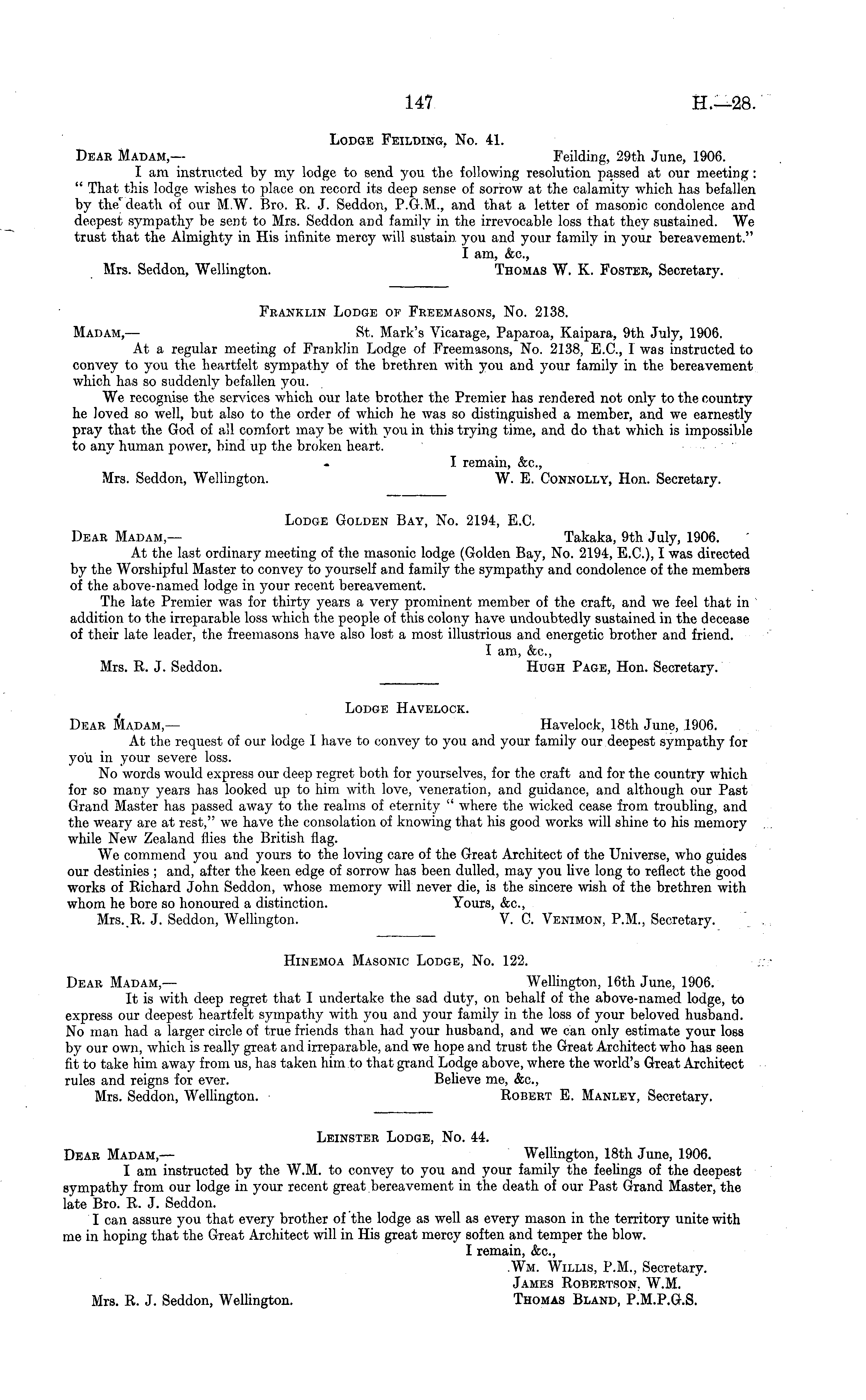 Lodge Feilding, No. 41. Dear Madam,— Feilding, 29th June, 1906. I am instructed by my lodge to send you the following resolution passed at our meeting : " That this lodge wishes to place on record its deep sense of sorrow at the calamity which has befallen by the' death of our M.W. Bro. R. J. Seddon, P.G.M., and that a letter of masonic condolence and deepest sympathy be sent to Mrs. Seddon and family in the irrevocable loss that they sustained. We trust that the Almighty in His infinite mercy will sustain you and your family in your bereavement." I am, &c, Mrs. Seddon, Wellington. Thomas W. K. Foster, Secretary. Franklin Lodge of Freemasons, No. 2138. Madam, — St. Mark's Vicarage, Paparoa, Kaipara, 9th July, 1906. At a regular meeting of Franklin Lodge of Freemasons, No. 2138, E.C., I was instructed to convey to you the heartfelt sympathy of the brethren with you and your family in the bereavement which has so suddenly befallen you. We recognise the services which our late brother the Premier has rendered not only to the country he loved so well, but also to the order of which he yvas so distinguished a member, and we earnestly pray that the God of all comfort may be with you in this trying time, and do that which is impossible to any human power, bind up the broken heart. I remain, &c, Mrs. Seddon, Wellington. W. E. Connolly, Hon. Secretary. Lodge Golden Bay, No. 2194, E.C. Dear Madam,— Takaka, 9th July, 1906. At the last ordinary meeting of the masonic lodge (Golden Bay, No. 2194, E.C), I was directed by the Worshipful Master to convey to yourself and family the sympathy and condolence of the members of the above-named lodge in your recent bereavement. The late Premier was for thirty years a very prominent member of the craft, and we feel that in addition to the irreparable loss which the people of this colony have undoubtedly sustained in the decease of their late leader, the freemasons have also lost a most illustrious and energetic brother and friend. I am, &c., Mrs. R. J. Seddon. Hugh Page, Hon. Secretary. Lodge Havelock. Dear Madam, — Havelock, 18th June, 1906. At the request of our lodge I have to convey to you and your family our deepest sympathy for you in your severe loss. No words would express our deep regret both for yourselves, for the craft and for the country which for so many years has looked up to him with love, veneration, and guidance, and although our Past Grand Master has passed away to the realms of eternity " where the wicked cease from troubling, and the weary are at rest," we have the consolation of knowing that his good works will shine to his memory while New Zealand flies the British flag. We commend you and yours to the loving care of the Great Architect of the Universe, who guides our destinies ; and, after the keen edge of sorrow has been dulled, may you live long to reflect the good works of Richard John Seddon, whose memory will never die, is the sincere wish of the brethren with whom he bore so honoured a distinction. Yours, &c, Mrs. R. J. Seddon, Wellington. V. C. Venimon, P.M., Secretary. Hinemoa Masonic Lodge, No. 122. Dear Madam, — Wellington, 16th June, 1906. It is with deep regret that I undertake the sad duty, on behalf of the above-named lodge, to express our deepest heartfelt sympathy with you and your family in the loss of your beloved husband. No man had a larger circle of true friends than had your husband, and we can only estimate your loss by our own, which is really great and irreparable, and we hope and trust the Great Architect who has seen fit to take him away from us, has taken him to that grand Lodge above, where the world's Great Architect rules and reigns for ever. Believe me, &c, Mrs. Seddon, Wellington. Robert E. Manley, Secretary. Leinster Lodge, No. 44. Dear Madam, — Wellington, 18th June, 1906. I am instructed by the W.M. to convey to you and your family the feelings of the deepest sympathy from our lodge in your recent great bereavement in the death of our Past Grand Master, the late Bro. R. J. Seddon. I can assure you that every brother of the lodge as well as every mason in the territory unite with me in hoping that the Great Architect will in His great mercy soften and temper the blow. I remain, &c, Wm. Willis, P.M., Secretary. James Robertson. W.M. Mrs. R. J. Seddon, Wellington. Thomas Bland, P.M.P.G.S.