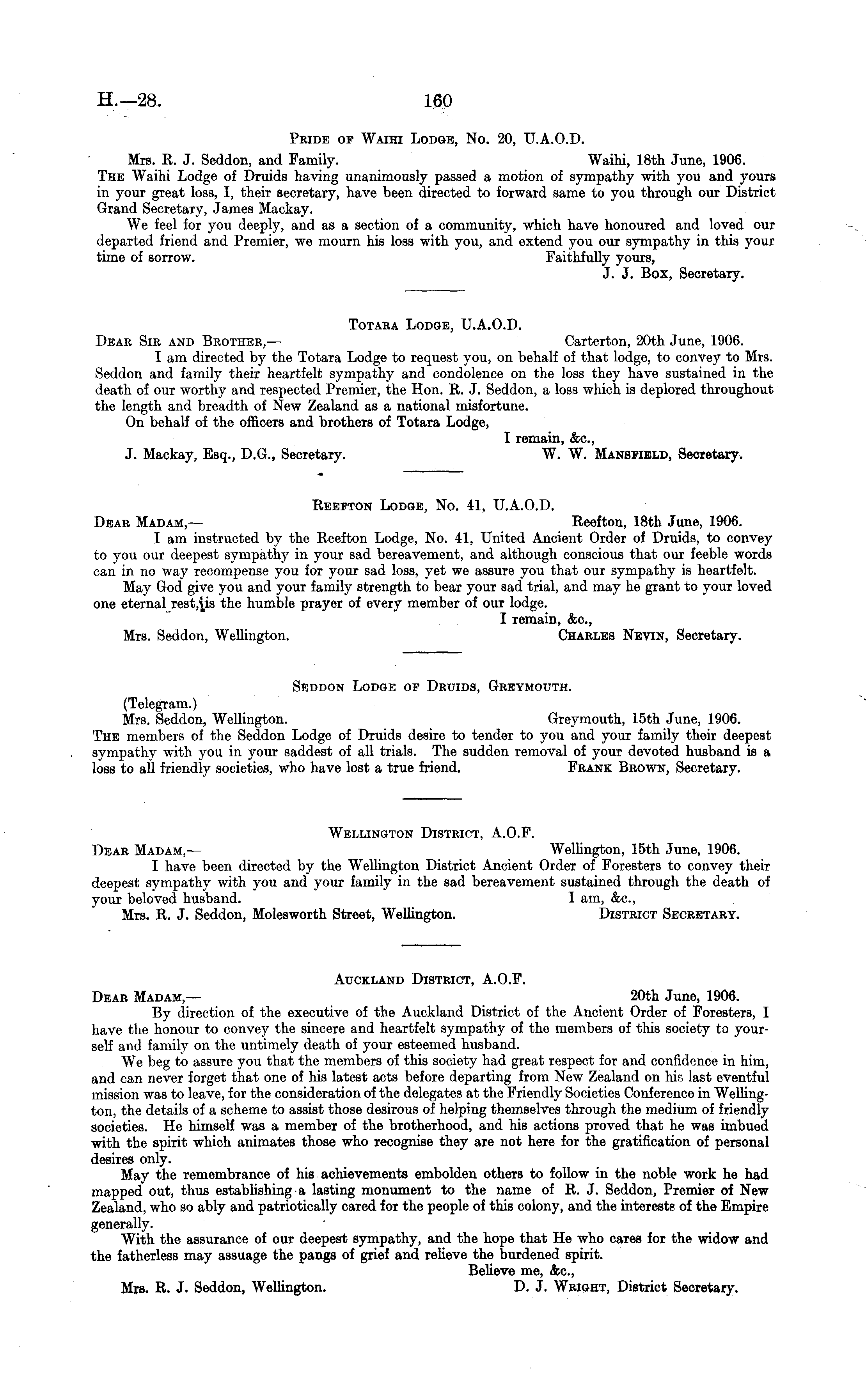 Pride of Waihi Lodge, No. 20, U.A.O.D. Mrs. R. J. Seddon, and Family. Waihi, 18th June, 1906. The Waihi Lodge of Druids having unanimously passed a motion of sympathy with you and yours in your great loss, I, their secretary, have been directed to forward same to you through our District Grand Secretary, James Mackay. We feel for you deeply, and as a section of a community, which have honoured and loved our departed friend and Premier, we mourn his loss with you, and extend you our sympathy in this your time of sorrow. Faithfully yours, J. J. Box, Secretary. Totara Lodge, U.A.O.D. Dear Sir and Brother, — Carterton, 20th June, 1906. I am directed by the Totara Lodge to request you, on behalf of that lodge, to convey to Mrs. Seddon and family their heartfelt sympathy and condolence on the loss they have sustained in the death of our worthy and respected Premier, the Hon. R. J. Seddon, a loss which is deplored throughout the length and breadth of New Zealand as a national misfortune. On behalf of the officers and brothers of Totara Lodge, I remain, &c, J. Mackay, Esq., D.G., Secretary. W. W. Mansfield, Secretary. Reefton Lodge, No. 41, U.A.O.D. Dear Madam, — Reefton, 18th June, 1906. I am instructed by the Reefton Lodge, No. 41, United Ancient Order of Druids, to convey to you our deepest sympathy in your sad bereavement, and although conscious that our feeble words can in no way recompense you for your sad loss, yet we assure you that our sympathy is heartfelt. May God give you and your family strength to bear your sad trial, and may he grant to your loved one eternal rest,ys the humble prayer of every membeT of our lodge. I remain, &c, Mrs. Seddon, Wellington. Charles Nevin, Secretary. Seddon Lodge of Druids, Greymouth. (Telegram.) Mrs. Seddon, Wellington. Greymouth, 15th June, 1906. The members of the Seddon Lodge of Druids desire to tender to you and your family their deepest sympathy with you in your saddest of all trials. The sudden removal of your devoted husband is a loss to all friendly societies, who have lost a true friend. Frank Brown, Secretary. Wellington District, A.O.F. Dear Madam, — Wellington, 15th June, 1906. I have been directed by the Wellington District Ancient Order of Foresters to convey their deepest sympathy with you and your family in the sad bereavement sustained through the death of your beloved husband. I am, &c, Mrs. R. J. Seddon, Molesworth Street, Wellington. District Secretary. Auckland District, A.O.F. Dear Madam,— 20th June, 1906. By direction of the executive of the Auckland District of the Ancient Order of Foresters, I have the honour to convey the sincere and heartfelt sympathy of the members of this society to yourself and family on the untimely death of your esteemed husband. We beg to assure you that the members of this society had great respect for and confidence in him, and can never forget that one of his latest acts before departing from New Zealand on his last eventful mission was to leave, for the consideration of the delegates at the Friendly Societies Conference in Wellington, the details of a scheme to assist those desirous of helping themselves through the medium of friendly societies. He himself was a member of the brotherhood, and his actions proved that he was imbued with the spirit which animates those who recognise they are not here for the gratification of personal desires only. May the remembrance of his achievements embolden others to follow in the noble work he had mapped out, thus establishing a lasting monument to the name of R. J. Seddon, Premier of New Zealand, who so ably and patriotically cared for the people of this colony, and the interests of the Empire generally. With the assurance of our deepest sympathy, and the hope that He who cares for the widow and the fatherless may assuage the pangs of grief and relieve the burdened spirit. Believe me, &c, Mrs. R. J. Seddon, Wellington. D. J. Wright, District Secretary.