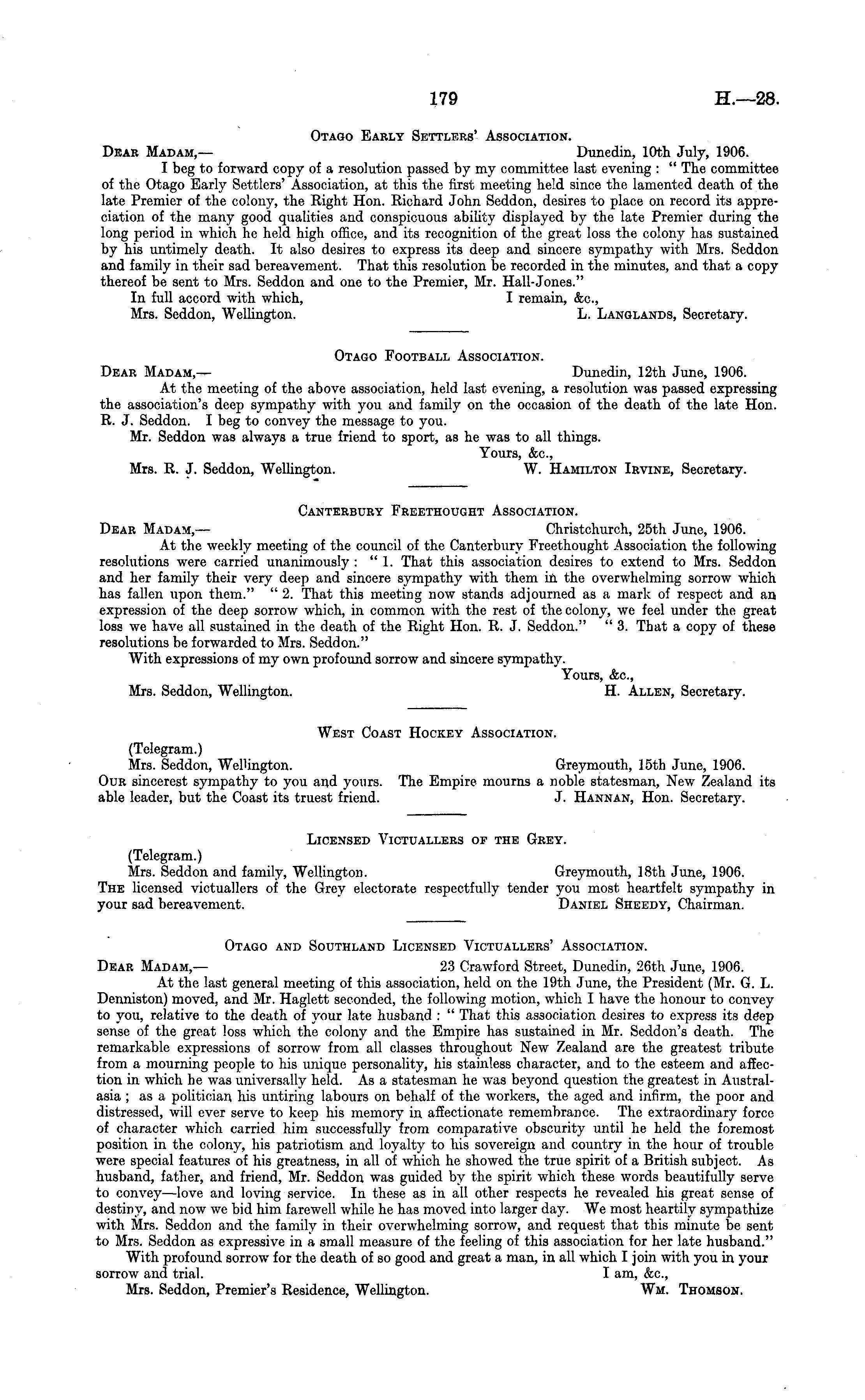 Otago Early Settlers' Association. Dear Madam, — Dunedin, 10th July, 1906. I beg to forward copy of a resolution passed by my committee last evening : " The committee of the Otago Early Settlers' Association, at this the first meeting held since the lamented death of the late Premier of the colony, the Right Hon. Richard John Seddon, desires to place on record its appreciation of the many good qualities and conspicuous ability displayed by the late Premier during the long period in which he held high office, and its recognition of the great loss the colony has sustained by his untimely death. It also desires to express its deep and sincere sympathy with Mrs. Seddon and family in their sad bereavement. That this resolution be recorded in the minutes, and that a copy thereof be sent to Mrs. Seddon and one to the Premier, Mr. Hall-Jones." In full accord with which, I remain, <&c, Mrs. Seddon, Wellington. L. Langlands, Secretary. Otago Football Association. Dear Madam, — Dunedin, 12th June, 1906. At the meeting of the above association, held last evening, a resolution was passed expressing the association's deep sympathy with you and family on the occasion of the death of the late Hon. R. J. Seddon. I beg to convey the message to you. Mr. Seddon was always a true friend to sport, as he was to all things. Yours, &c, Mrs. R. J. Seddon, Wellington. W. Hamilton Irvine, Secretary. Canterbury Freethought Association. Dear Madam,— Christchurch, 25th June, 1906. At the weekly meeting of the council of the Canterbury Freethought .Association the following resolutions were carried unanimously : " 1. That this association desires to extend to Mrs. Seddon and her family their very deep and sincere sympathy with them in the overwhelming sorrow which has fallen upon them." "2. That this meeting now stands adjourned as a mark of respect and an expression of the deep sorrow which, in common yvith the rest of the colony, we feel under the great loss we have all sustained in the death of the Right Hon. R. J. Seddon." "3. That a copy of these resolutions be forwarded to Mrs. Seddon." With expressions of my own profound sorrow and sincere sympathy. Yours, &c, Mrs. Seddon, Wellington. H. Allen, Secretary. West Coast Hockey Association. (Telegram.) Mrs. Seddon, Wellington. Greymouth, 15th June, 1906. Our sincerest sympathy to you and yours. The Empire mourns a noble statesman, New Zealand its able leader, but the Coast its truest friend. J. Hannan, Hon. Secretary. Licensed Victuallers of the Grey. (Telegram.) Mrs. Seddon and family, Wellington. Greymouth, 18th June, 1906. The licensed victuallers of the Grey electorate respectfully tender you most heartfelt sympathy in your sad bereavement. Daniel Sheedy, Chairman. Otago and Southland Licensed Victuallers' .Association. Dear Madam, — 23 Crawford Street, Dunedin, 26th June, 1906. At the last general meeting of this association, held on the 19th June, the President (Mr. G. L. Denniston) moved, and Mr. Haglett seconded, the following motion, which I have the honour to convey to you, relative to the death of your late husband : " That this association desires to express its deep sense of the great loss which the colony and the Empire has sustained in Mr. Seddon's death. The remarkable expressions of sorrow from all classes throughout New Zealand are the greatest tribute from a mourning people to his unique personality, his stainless character, and to the esteem and affection in which he was universally held. As a statesman he was beyond question the greatest in Australasia ; as a politician his untiring labours on behalf of the workers, the aged and infirm, the poor and distressed, will ever serve to keep his memory in affectionate remembrance. The extraordinary force of character which carried him successfully from comparative obscurity until he held the foremost position in the colony, his patriotism and loyalty to his sovereign and country in the hour of trouble were special features of his greatness, in all of which he showed the true spirit of a British subject. As husband, father, and friend, Mr. Seddon was guided by the spirit which these words beautifully serve to convey—love and loving service. In these as in all other respects he revealed his great sense of destiny, and now we bid him farewell while he has moved into larger day. We most heartily sympathize with Mrs. Seddon and the family in their overwhelming sorrow, and request that this minute be sent to Mrs. Seddon as expressive in a small measure of the feeling of this association for her late husband." With profound sorrow for the death of so good and great a man, in all which I join with you in your sorrow and trial. I am, &c, Mrs. Seddon, Premier's Residence, Wellington. Wm. Thomson.