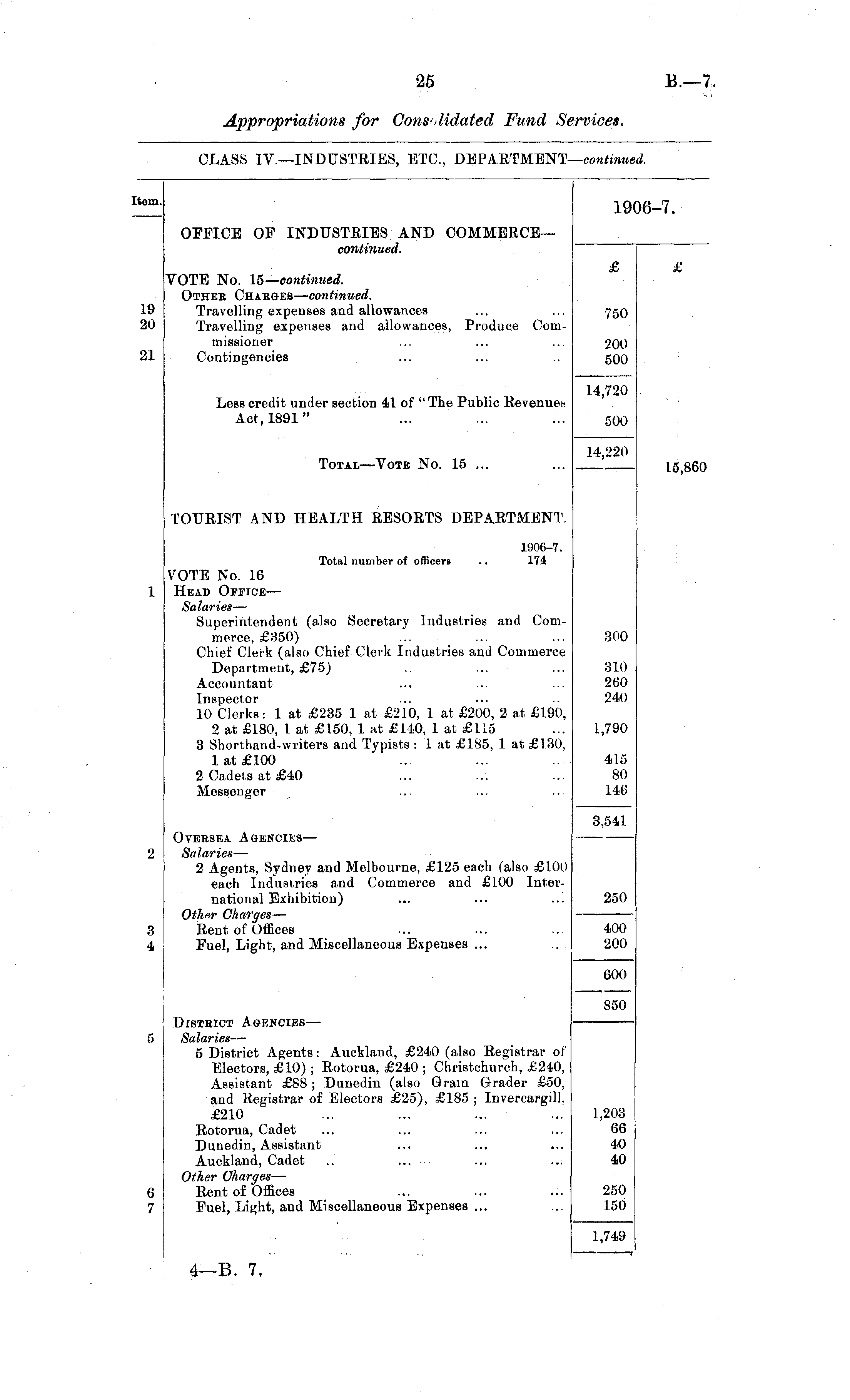 Xem. 19 16-7. OFFICE OF INDUSTRIES AND COMMERCE— continued. VOTE No. 15— continued. Other Charges— continued. Travelling expenses and allowances Travelling expenses and allowances, Produce Commissioner Contingencies £ 19 20 750 21 200 500 Less credit under section 41 of "The Public Revenues Act, 1891" 14,720 500 Total—Vote No. 15 ... 14,220 15,86' TOURIST AND HEALTH RESORTS DEPARTMENT. 1906-7. Total number of officers .. 174 VOTE No. 16 Heau Office— Salaries — Superintendent (also Secretary Industries and Commerce, £350) Chief Clerk (also Chief Clerk Industries and Commerce Department, £75) Accountant Inspector 10 Clerks: 1 at £235 1 at £210, 1 at £200, 2 at £190, 2 at £180, I at £150, 1 at £140, 1 at £115 3 Shorthand-writers and Typists : 1 at £185, 1 at £130, 1 at £100 2 Cadets at £40 Messenger 300 310 260 240 1,790 415 80 146 Oversea Agencies— Salaries — 2 Agents, Sydney and Melbourne, £125 each (also £100 each Industries and Commerce and £100 International Exhibition) ... ... ... Other Charges — Rent of Offices Fuel, Light, and Miscellaneous Expenses ... 3,541 250 3 4 400 200 600 5 District Agencies— Salaries — 5 District Agents: Auckland, £240 (also Registrar of Electors, £10) ; Rotorua, £240 ; Christchurch, £240, Assistant £88; Dunedin (also Grain Grader £50, and Registrar of Electors £25), £185 ; Invercargill. £210 Rotorua, Cadet Dunedin, Assistant Auckland, Cadet Other Charges — Rent of Offices Fuel, Light, and Miscellaneous Expenses ... 850 1,203 66 40 40 6 7 250 150 1,749